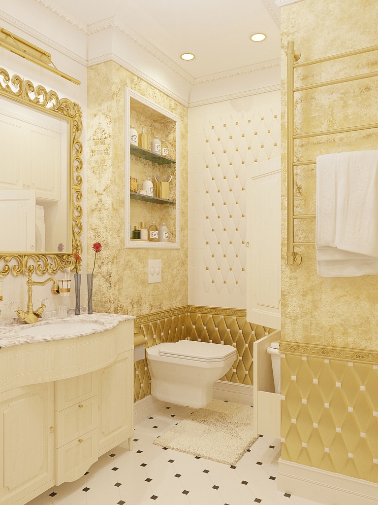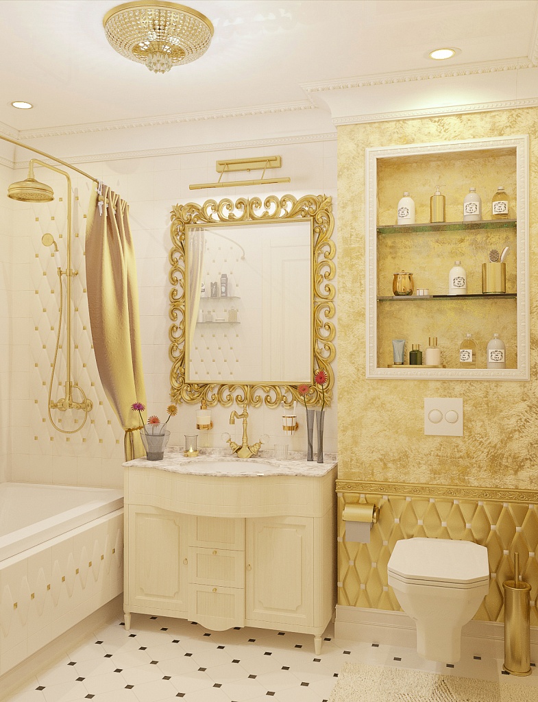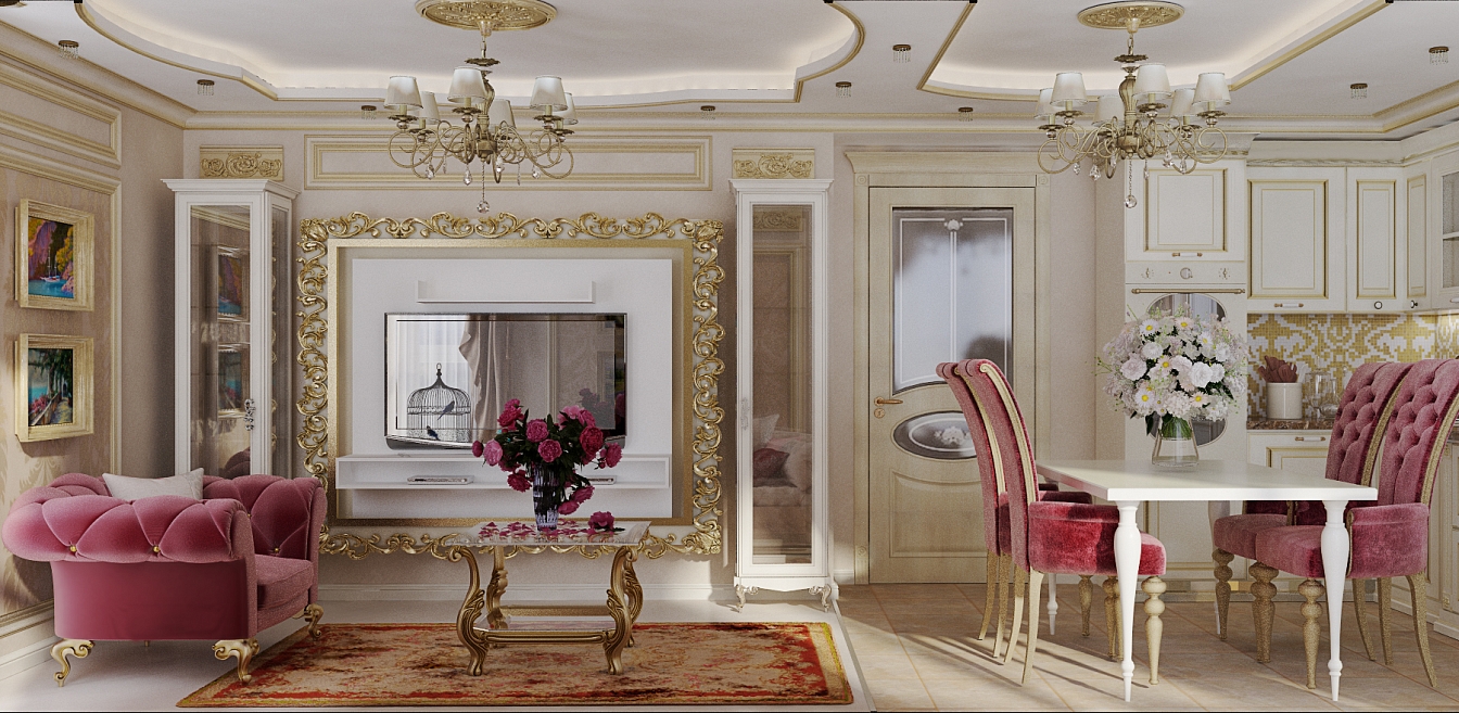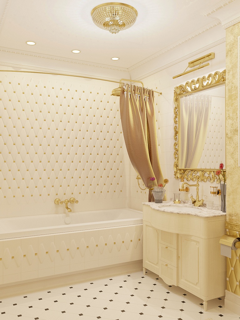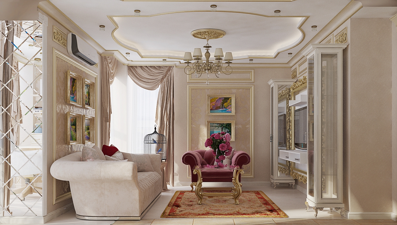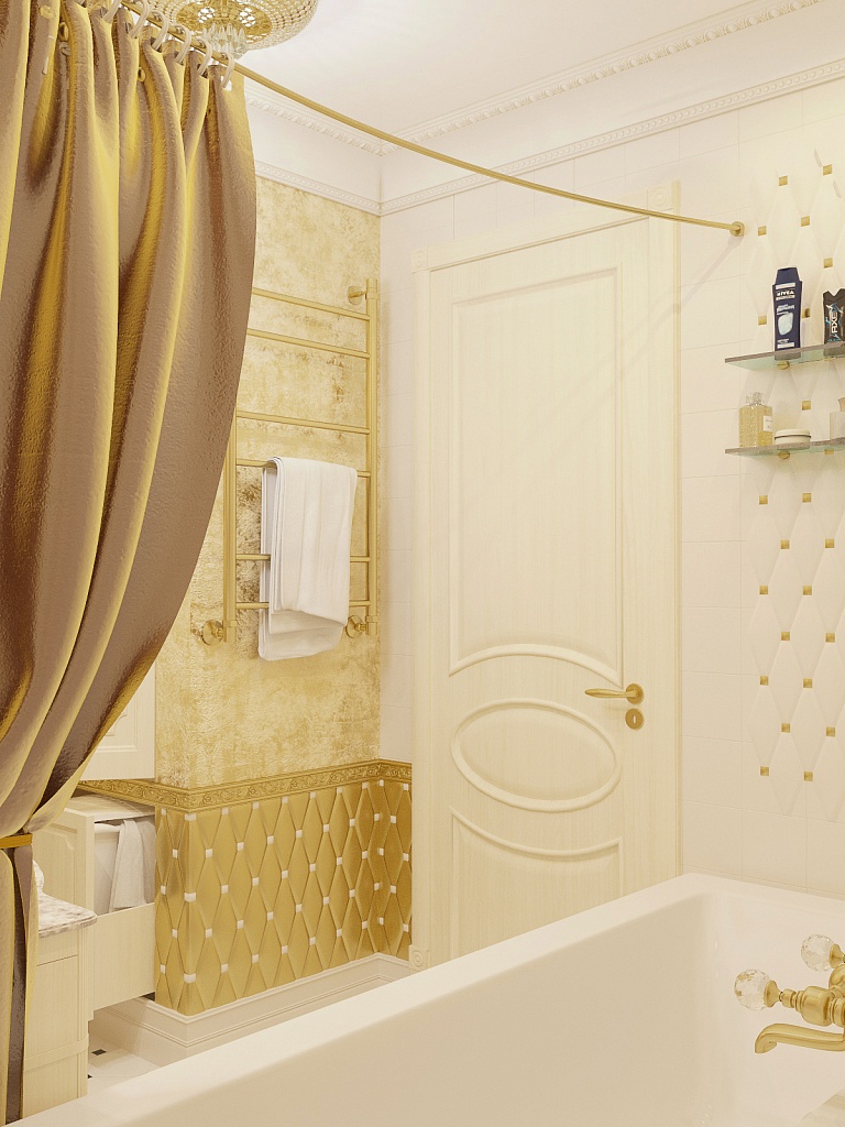 Эта презентабельная квартира для молодой женщины с ребенком .Роскошь и лоск чувствуются в каждой детали интерьера. Здесь как в шкатулке с драгоценностями, рассыпаны позолота и зеркала, лепнина и бархат. Золотая мозаика Bisazza, элитные обои традиционной коллекции с рисунком «Дамаск», венецианская штукатурка с эффектом золотого шелка – все это лишь оттеняет блеск самой хозяйки. В этой квартире живут попугаи и рыбки, а из дальних поездок хозяйка часто привозит сувениры – для них нашлось место в гостиной возле телевизора и у рабочего стола.