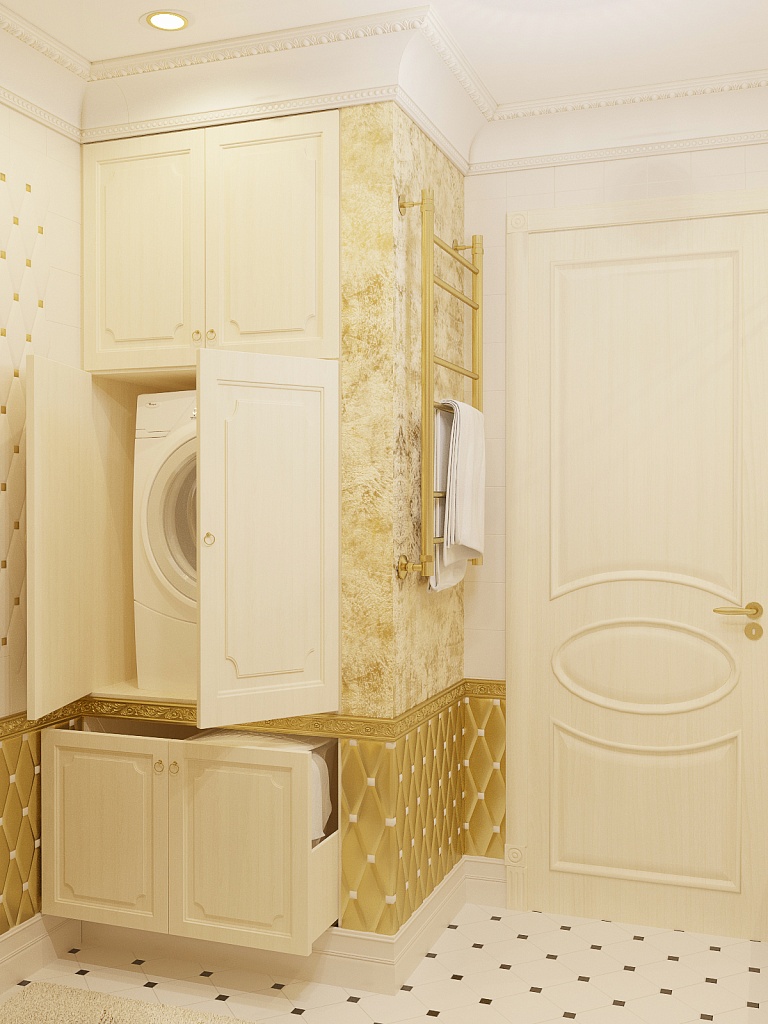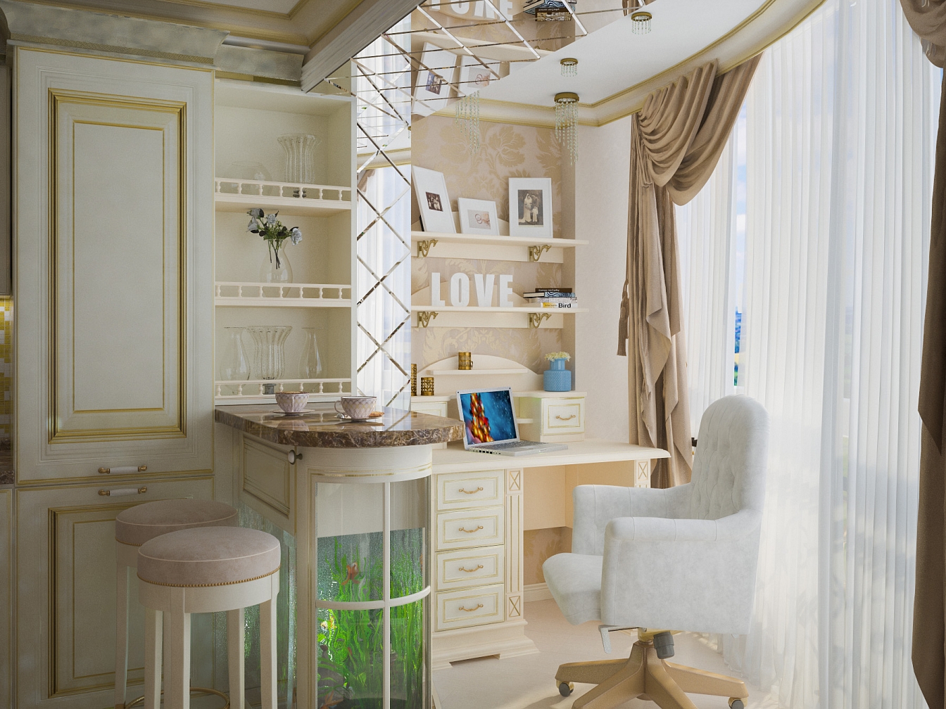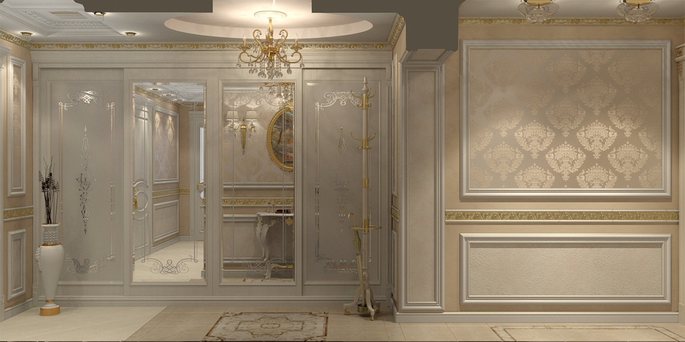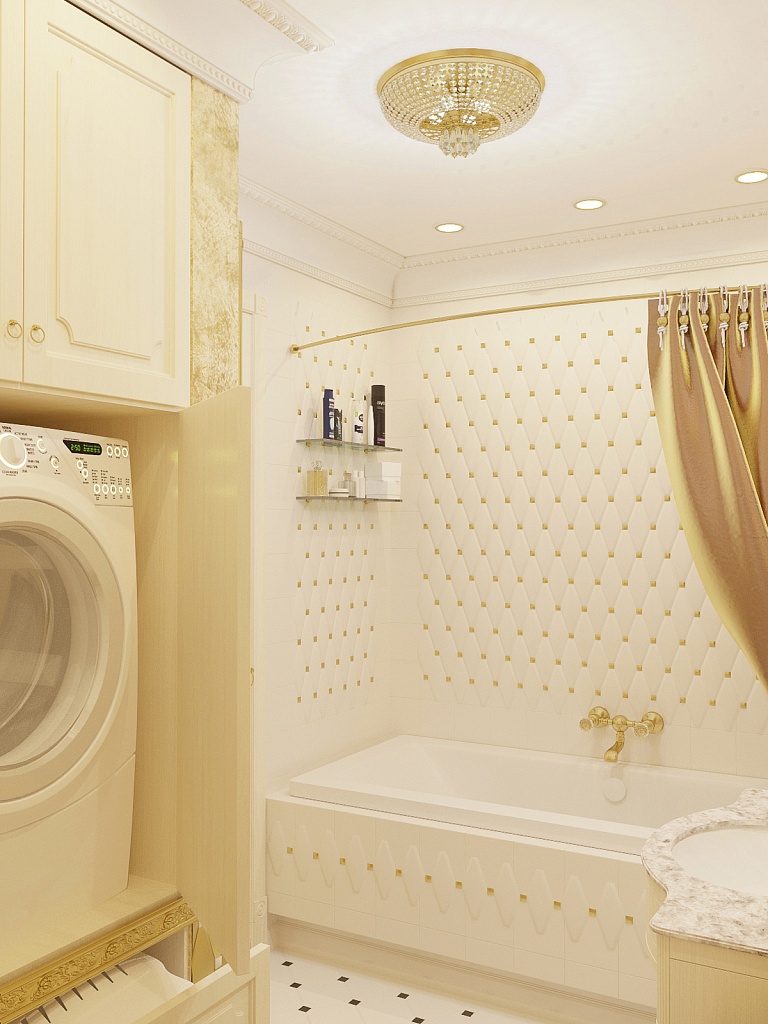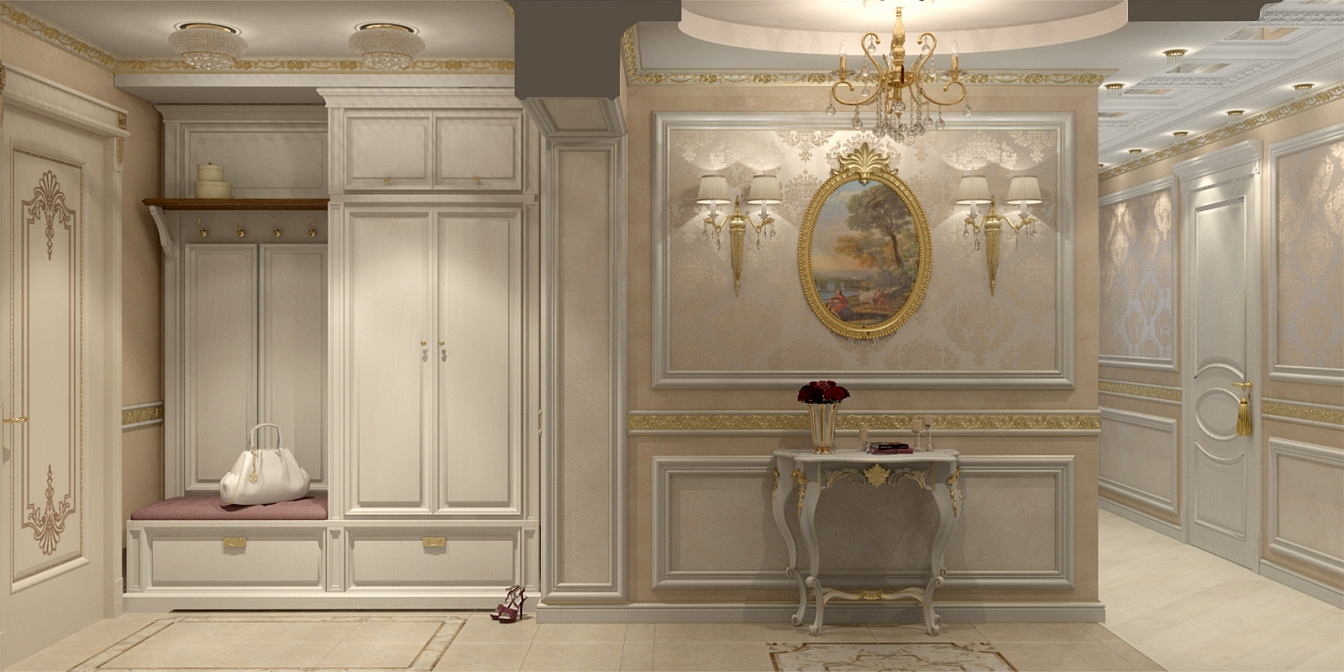 Эта презентабельная квартира для молодой женщины с ребенком .Роскошь и лоск чувствуются в каждой детали интерьера. Здесь как в шкатулке с драгоценностями, рассыпаны позолота и зеркала, лепнина и бархат. Золотая мозаика Bisazza, элитные обои традиционной коллекции с рисунком «Дамаск», венецианская штукатурка с эффектом золотого шелка – все это лишь оттеняет блеск самой хозяйки. В этой квартире живут попугаи и рыбки, а из дальних поездок хозяйка часто привозит сувениры – для них нашлось место в гостиной возле телевизора и у рабочего стола.