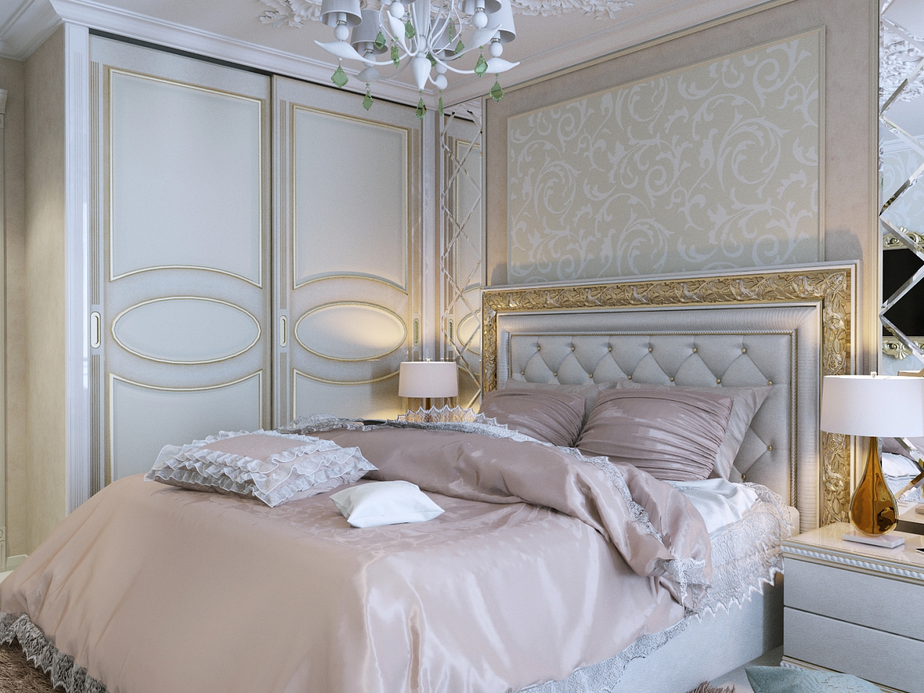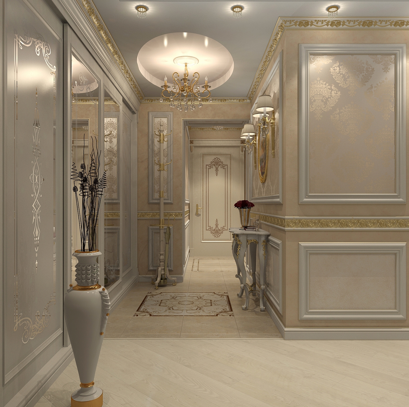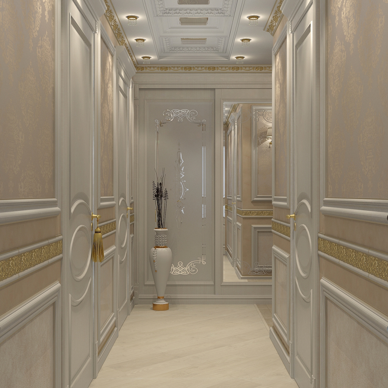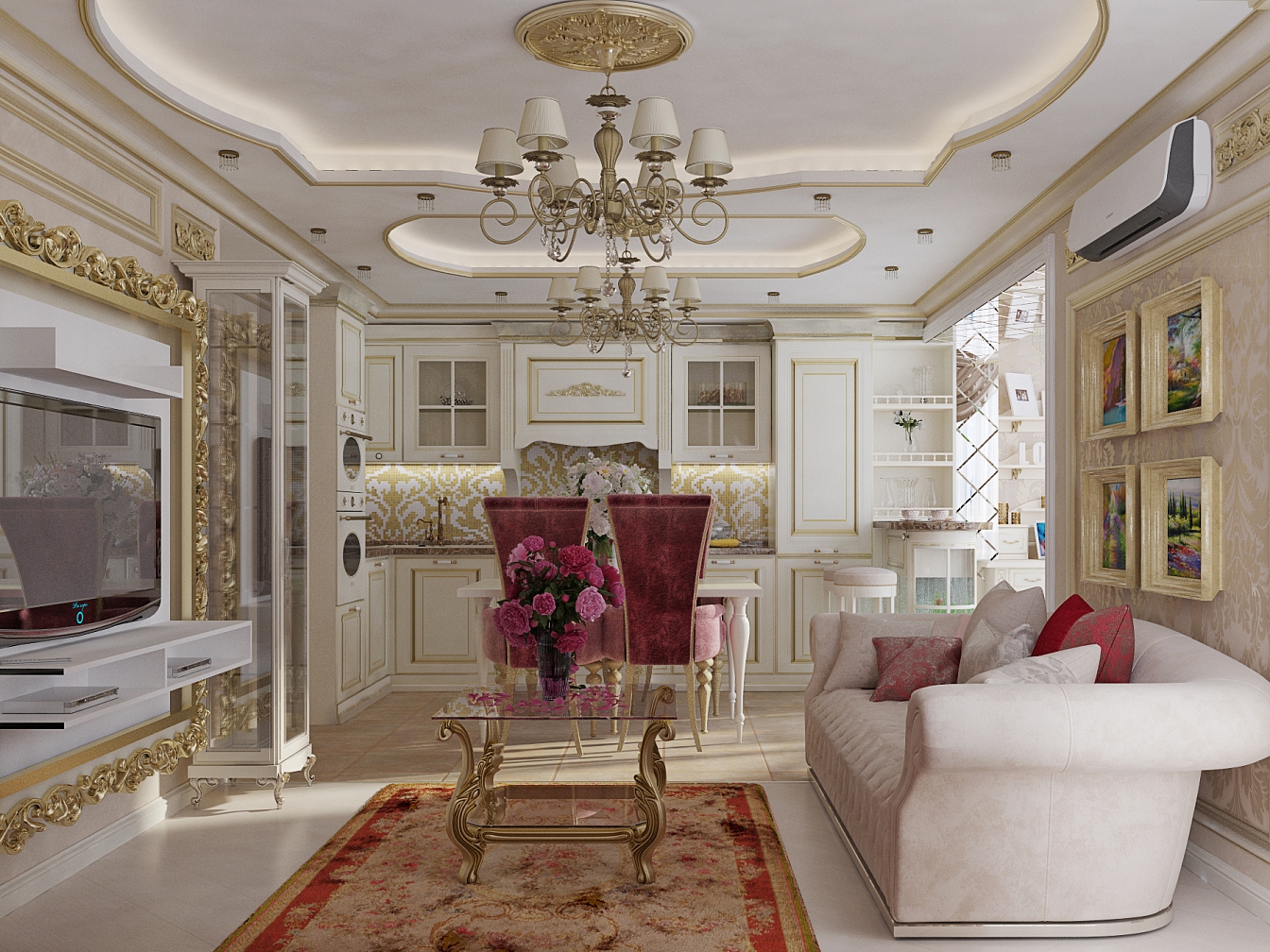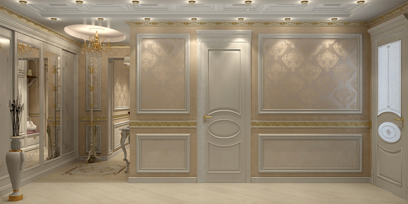 Эта презентабельная квартира для молодой женщины с ребенком .Роскошь и лоск чувствуются в каждой детали интерьера. Здесь как в шкатулке с драгоценностями, рассыпаны позолота и зеркала, лепнина и бархат. Золотая мозаика Bisazza, элитные обои традиционной коллекции с рисунком «Дамаск», венецианская штукатурка с эффектом золотого шелка – все это лишь оттеняет блеск самой хозяйки. В этой квартире живут попугаи и рыбки, а из дальних поездок хозяйка часто привозит сувениры – для них нашлось место в гостиной возле телевизора и у рабочего стола.