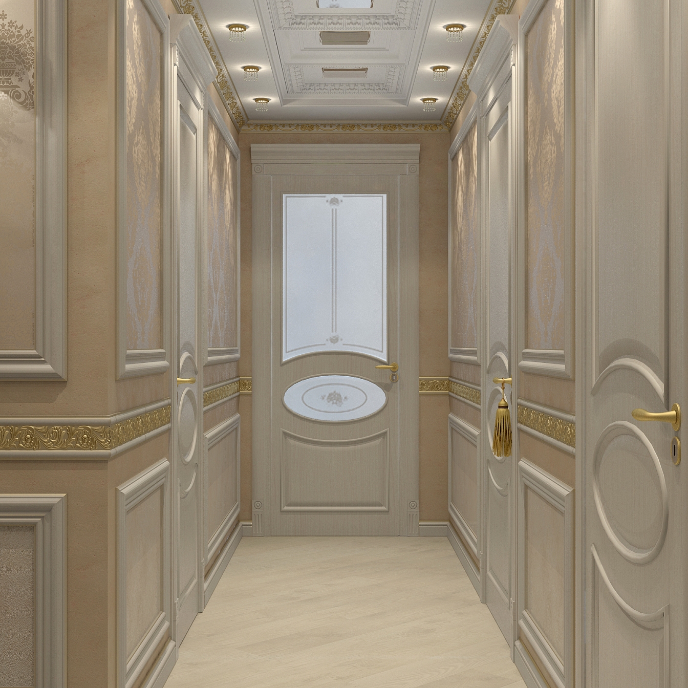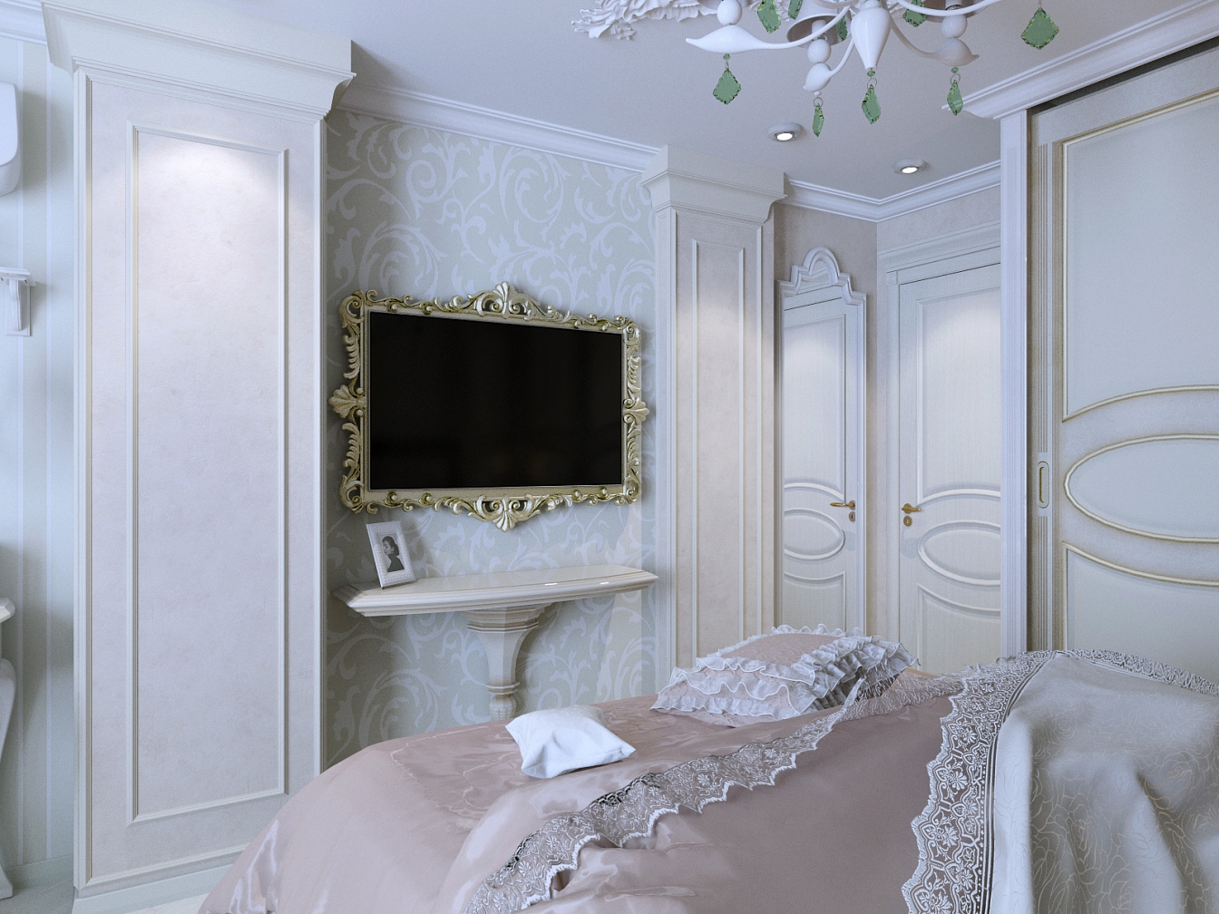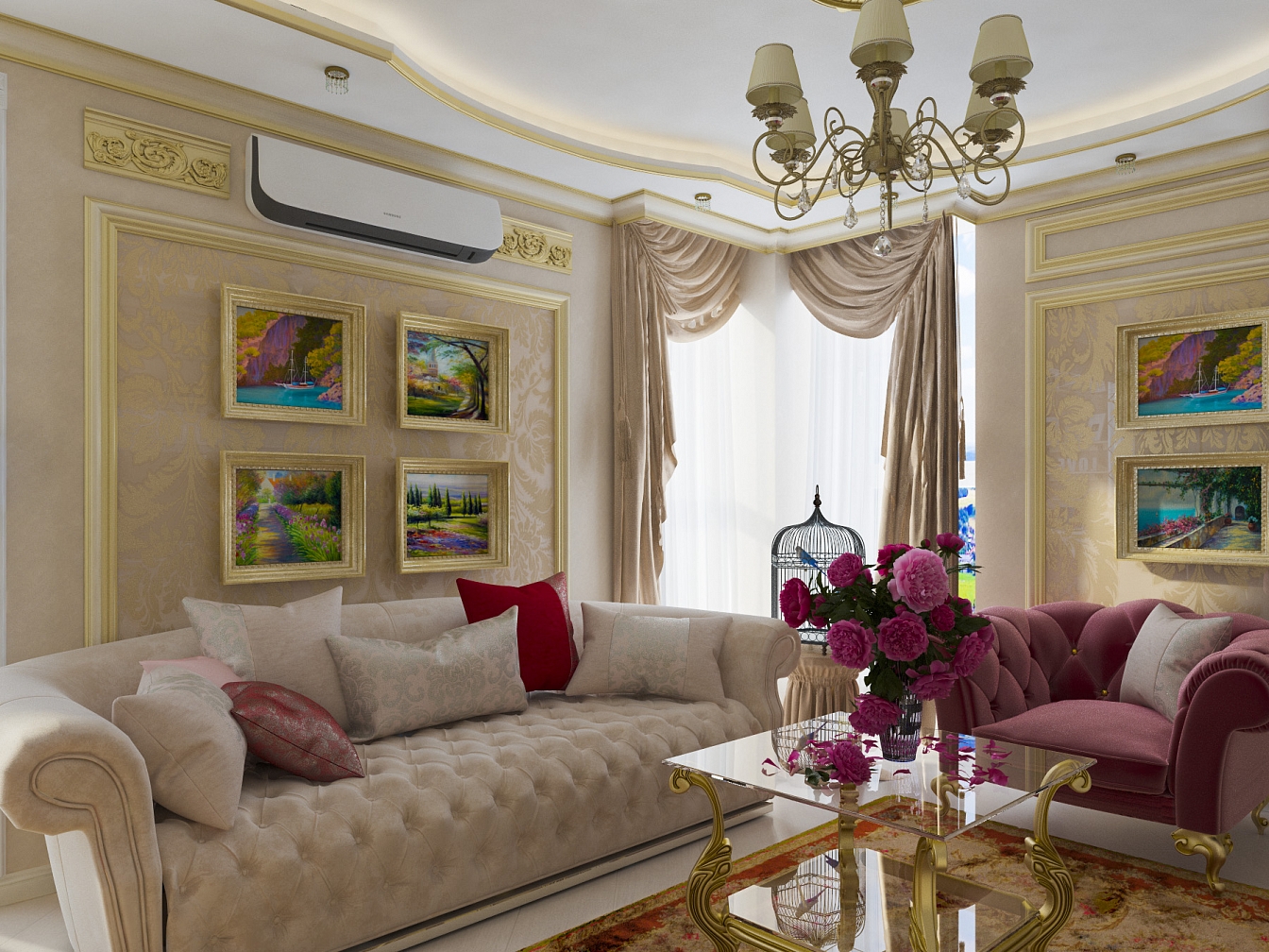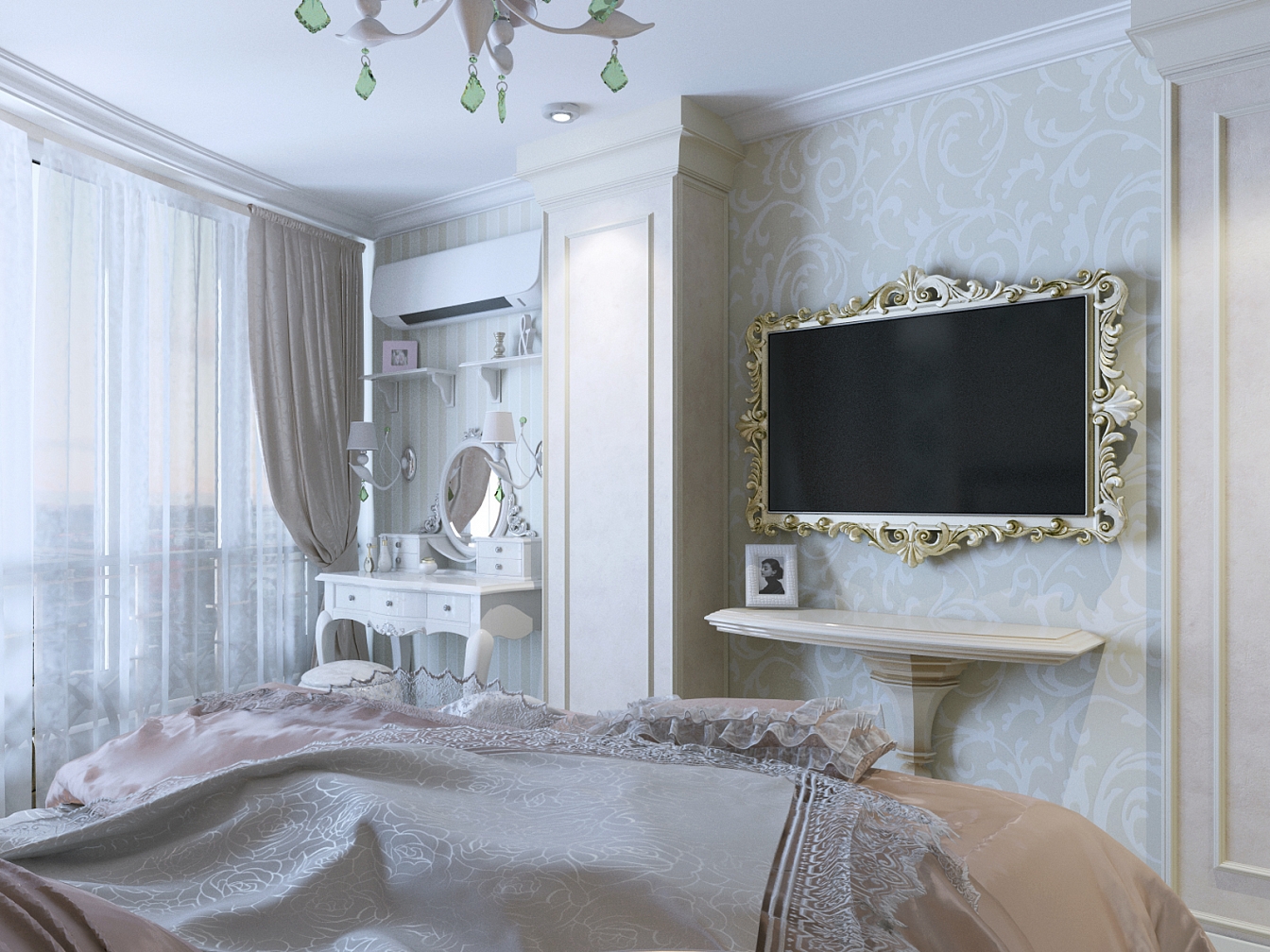Эта презентабельная квартира для молодой женщины с ребенком .Роскошь и лоск чувствуются в каждой детали интерьера. Здесь как в шкатулке с драгоценностями, рассыпаны позолота и зеркала, лепнина и бархат. Золотая мозаика Bisazza, элитные обои традиционной коллекции с рисунком «Дамаск», венецианская штукатурка с эффектом золотого шелка – все это лишь оттеняет блеск самой хозяйки. В этой квартире живут попугаи и рыбки, а из дальних поездок хозяйка часто привозит сувениры – для них нашлось место в гостиной возле телевизора и у рабочего стола.