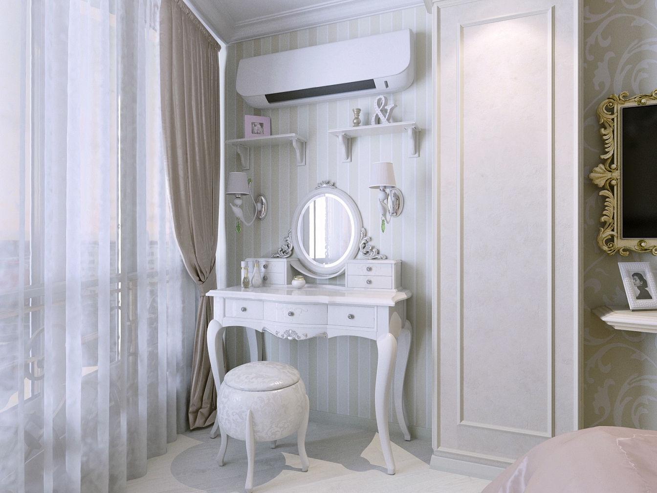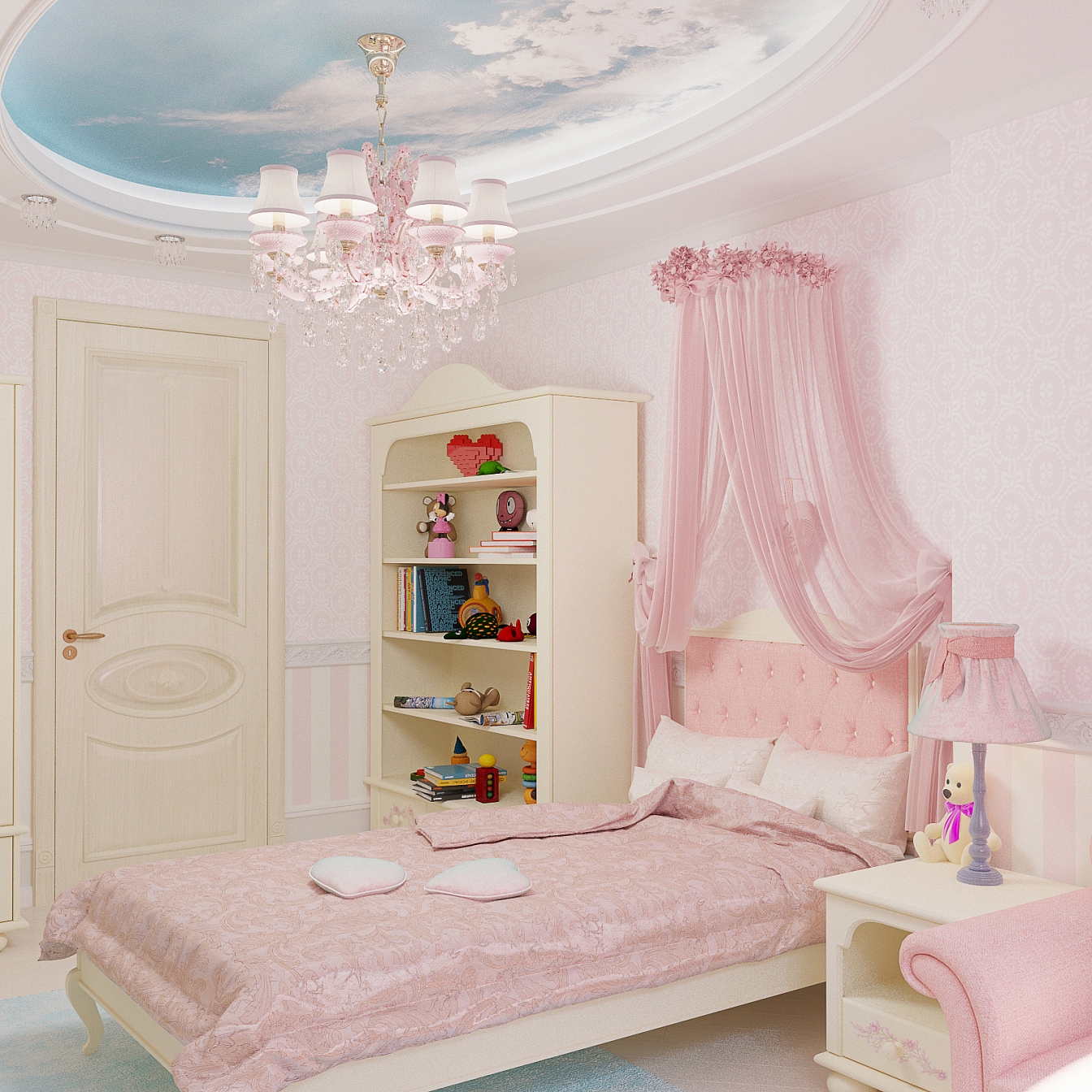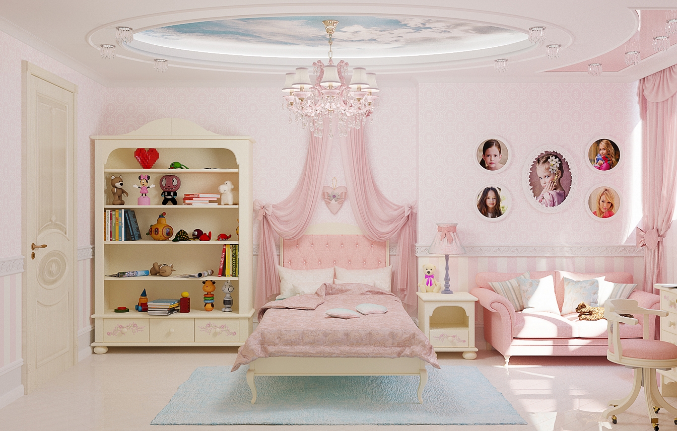 В спальне дочери царит розовое настроение. Кровать с балдахином под облаками марки Woodrightkids. На такой кровати будут сниться самые милые сны. В ванной использована плитка ромбами от Adex в бежевом и золотом сочетании.