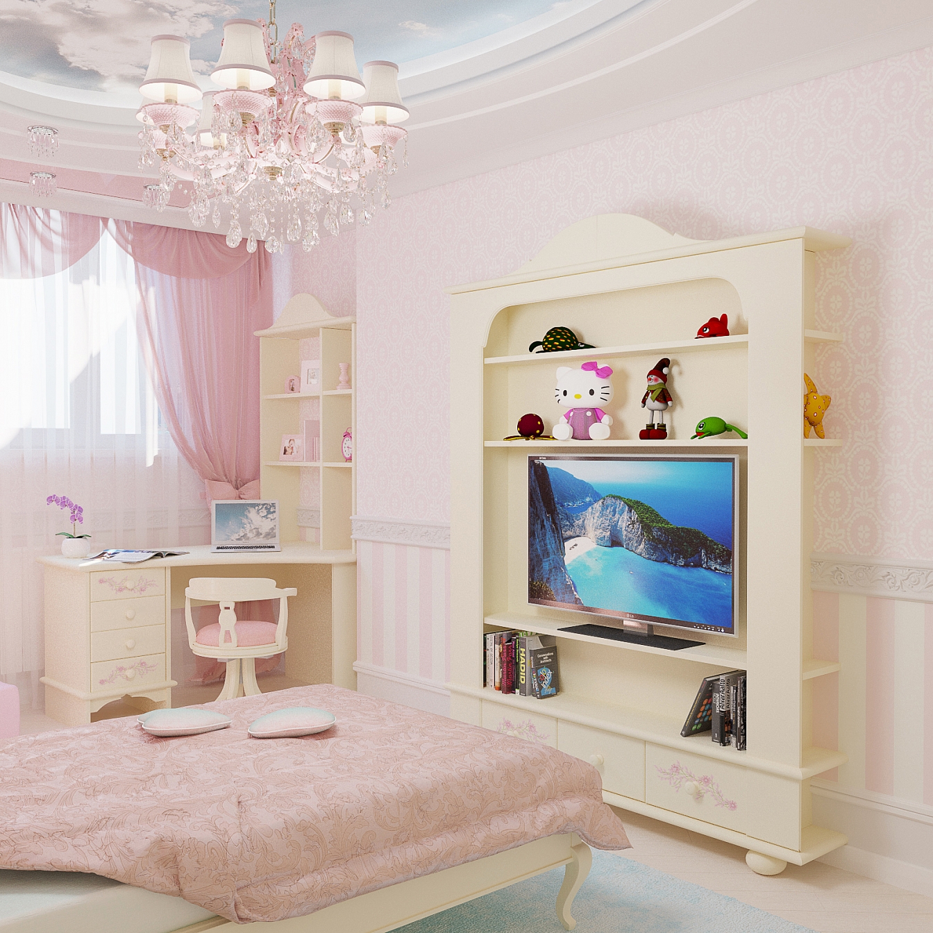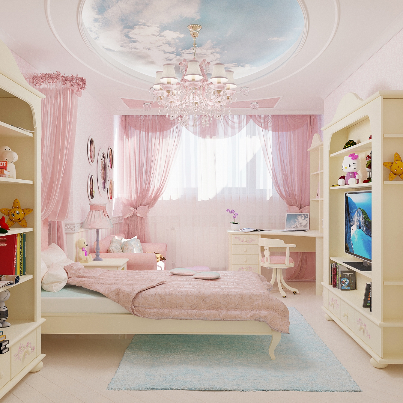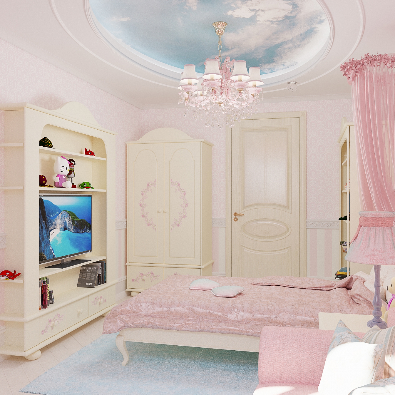 В спальне дочери царит розовое настроение. Кровать с балдахином под облаками марки Woodrightkids. На такой кровати будут сниться самые милые сны. В ванной использована плитка ромбами от Adex в бежевом и золотом сочетании.