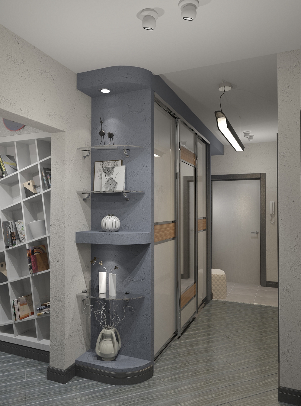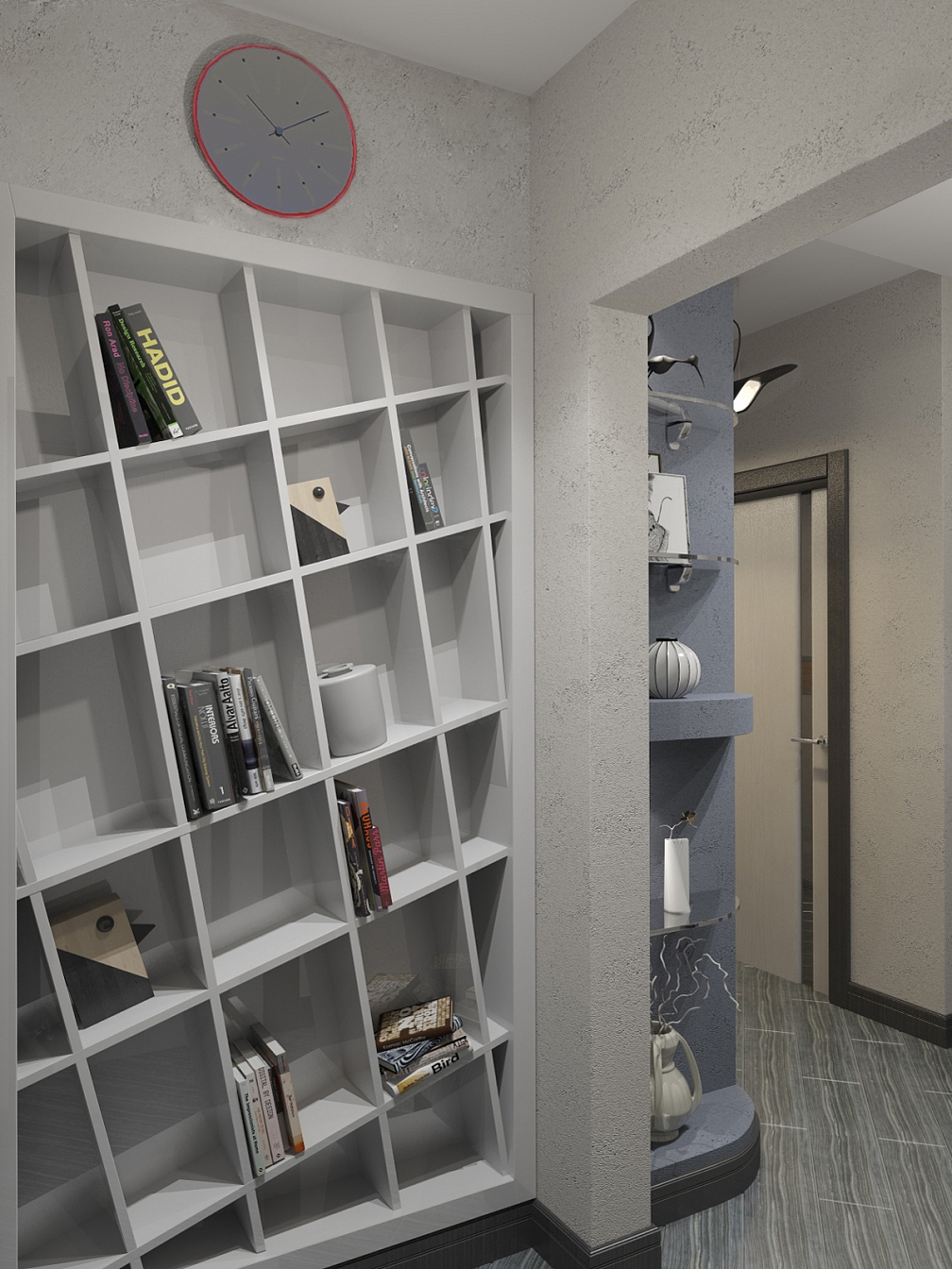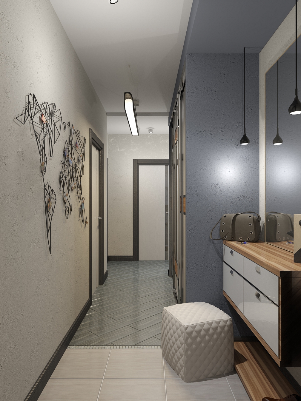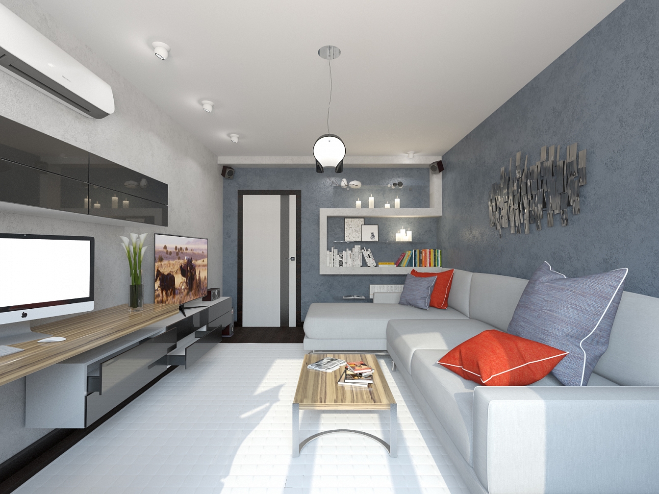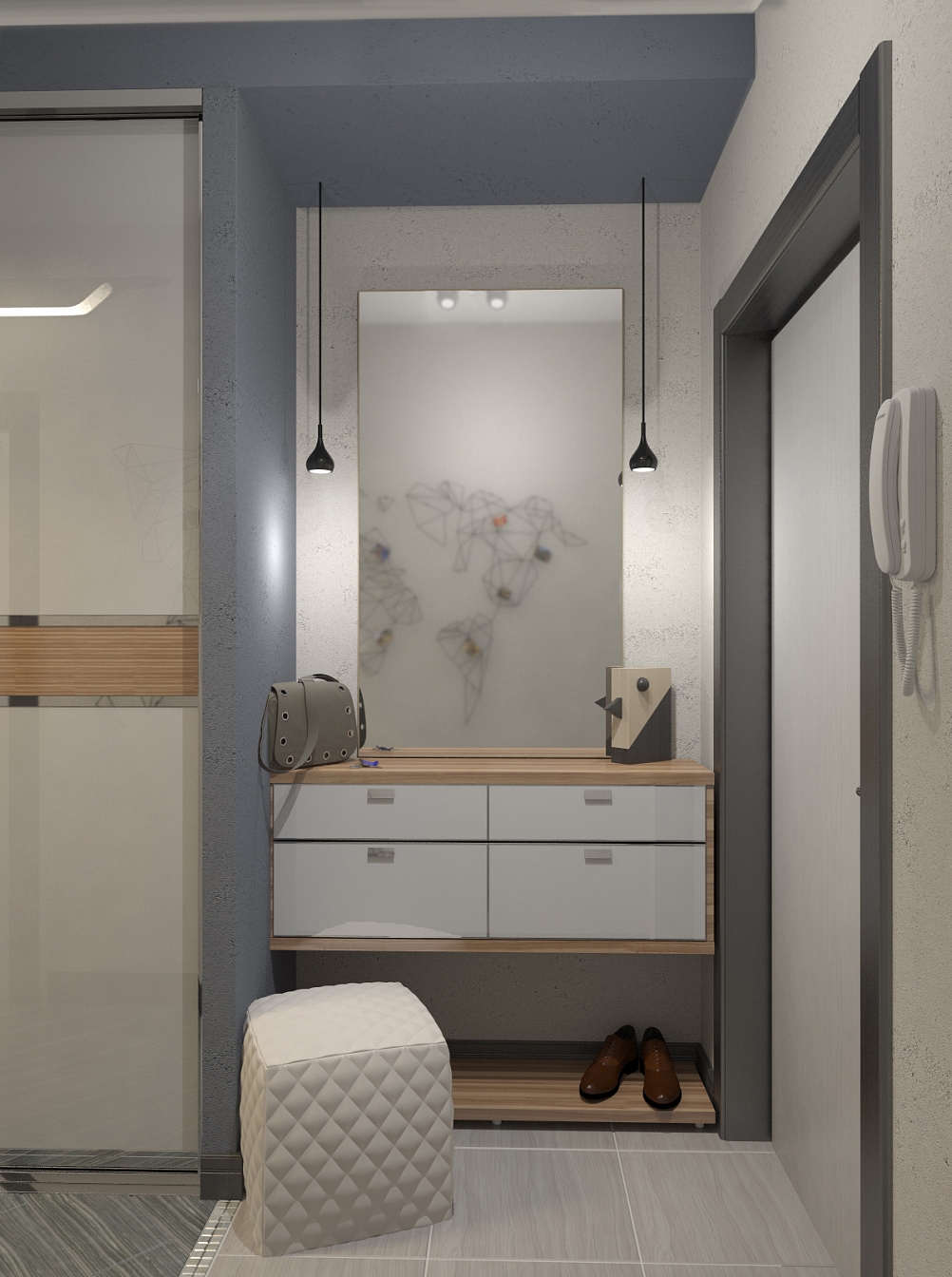 Этот современный интерьер для молодого человека, живущего в быстром ритме. Типовая квартира без перепланировки, но помещения передали молодежное легкое настроение, характерное для хозяина. Холодные оттенки в гостиной и коридоре сменяются насыщенным плотным цветом в спальне.