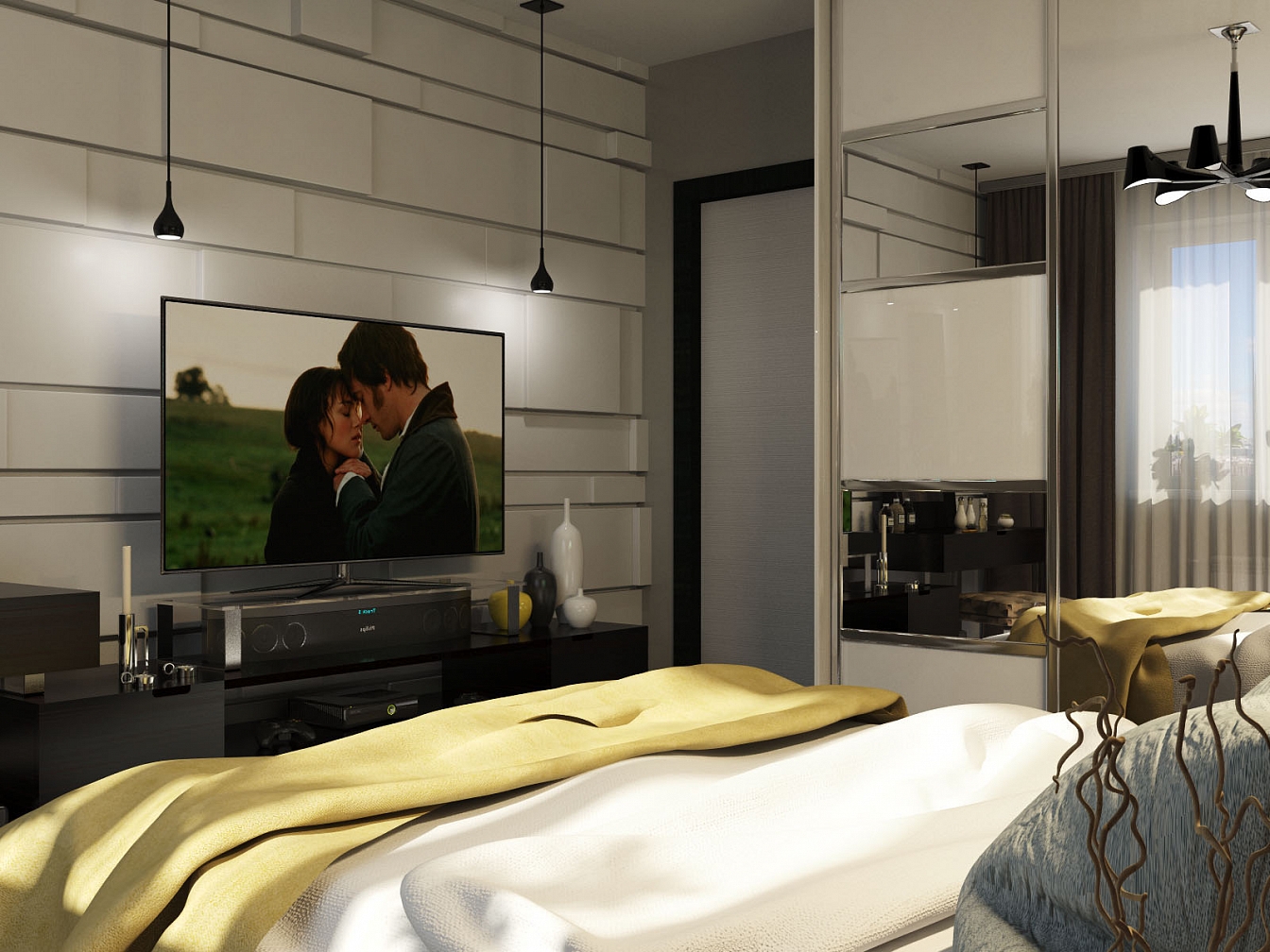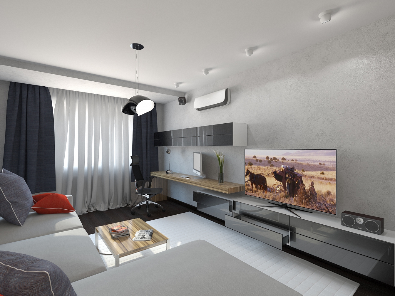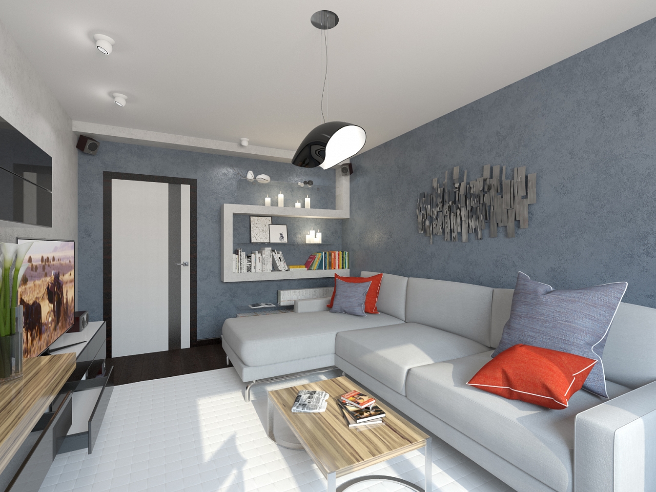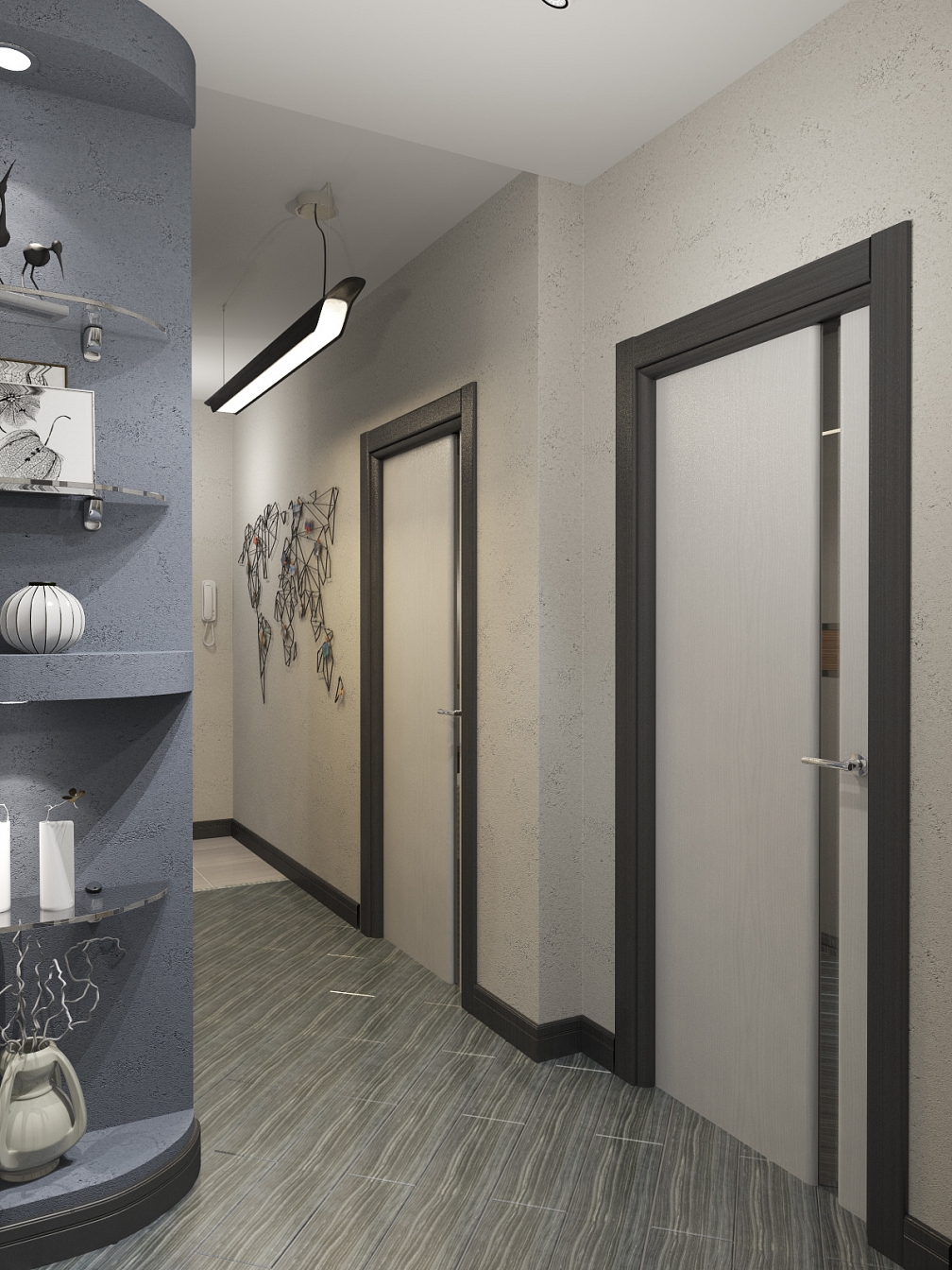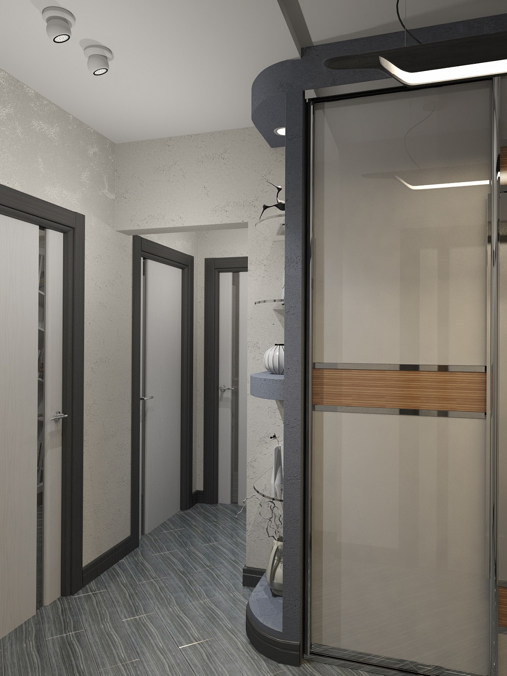 Этот современный интерьер для молодого человека, живущего в быстром ритме. Типовая квартира без перепланировки, но помещения передали молодежное легкое настроение, характерное для хозяина. Холодные оттенки в гостиной и коридоре сменяются насыщенным плотным цветом в спальне.