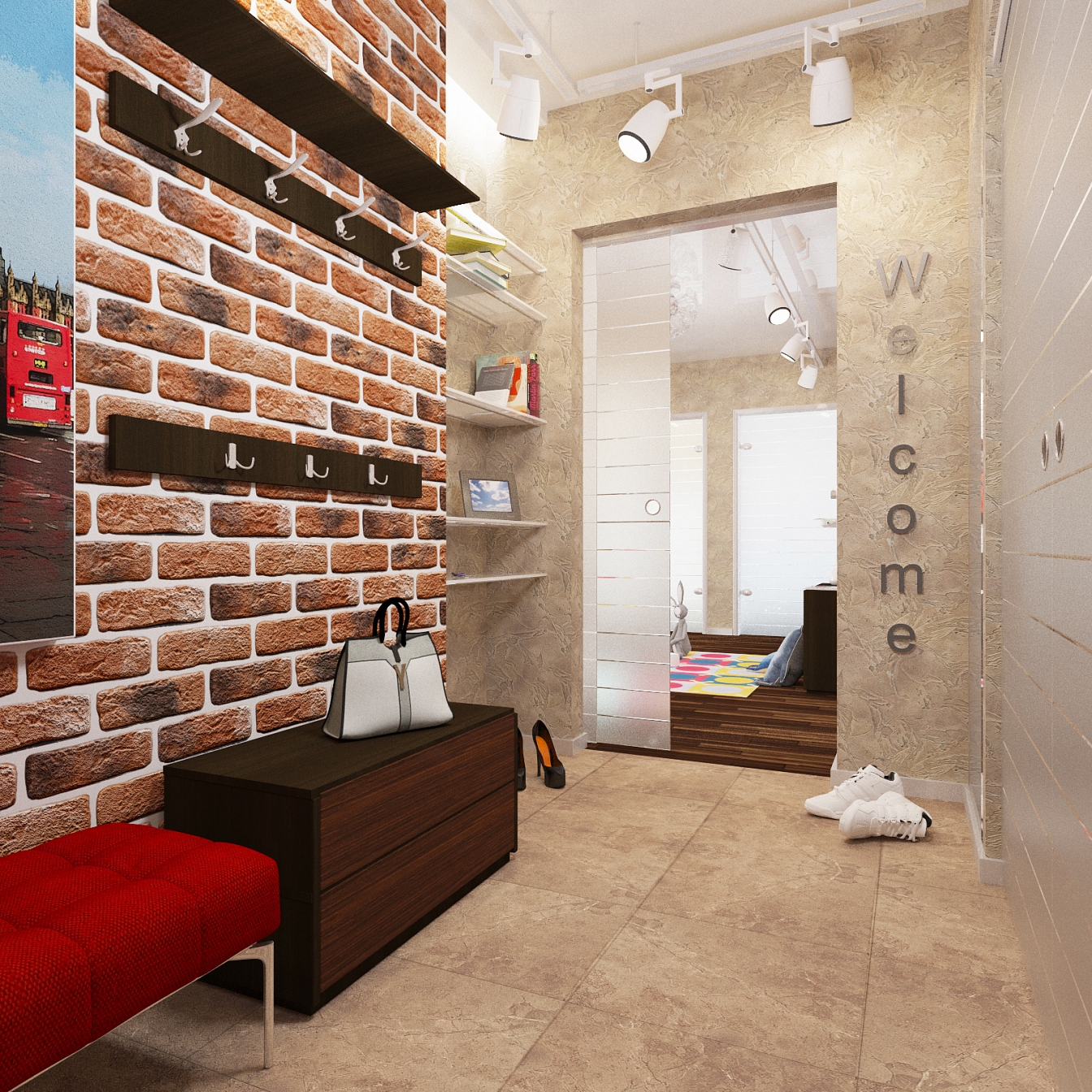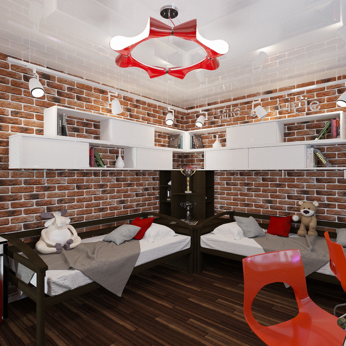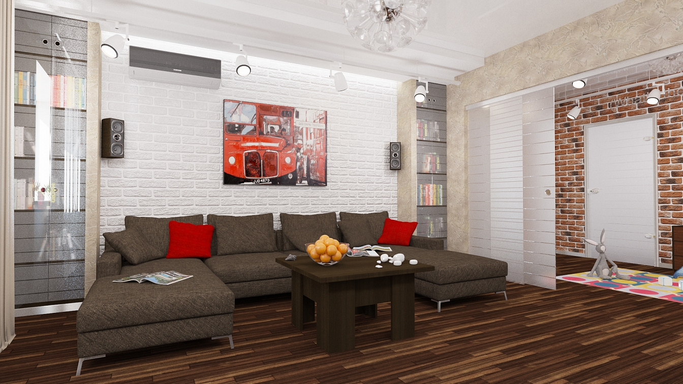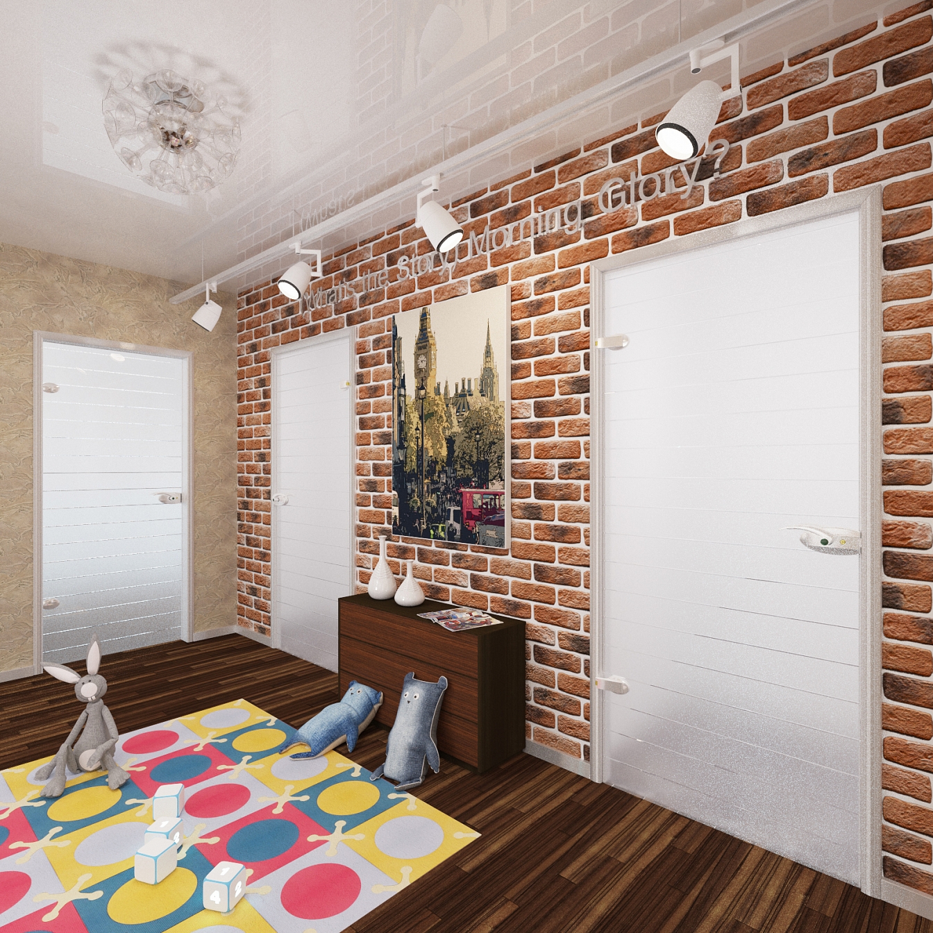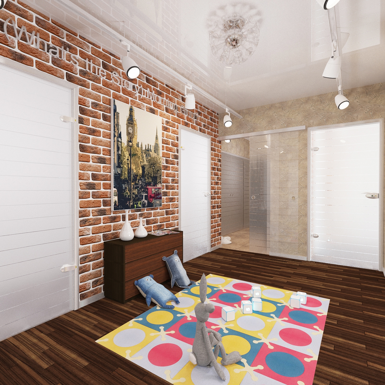 Интерьер квартиры предназначен для молодой семьи с двумя детьми. Предпочтения отдавались прочным, устойчивым материалам, как например, кирпич и декоративная штукатурка с грубой фактурой. Массивное дерево в мебели сочетается со стеклянными дверями и стальными фасадами на кухне. Получилась необычная, стильная квартира.