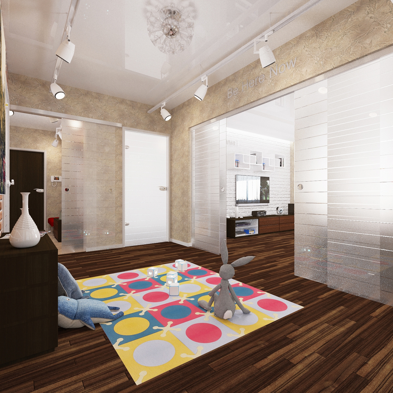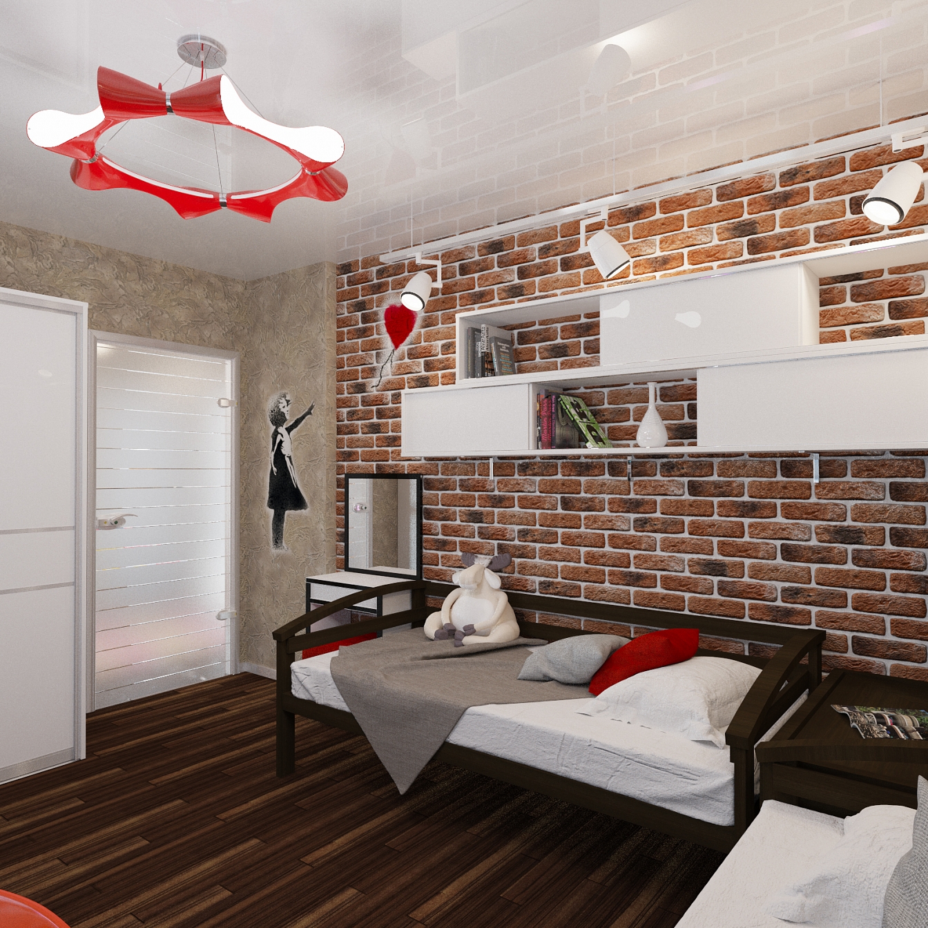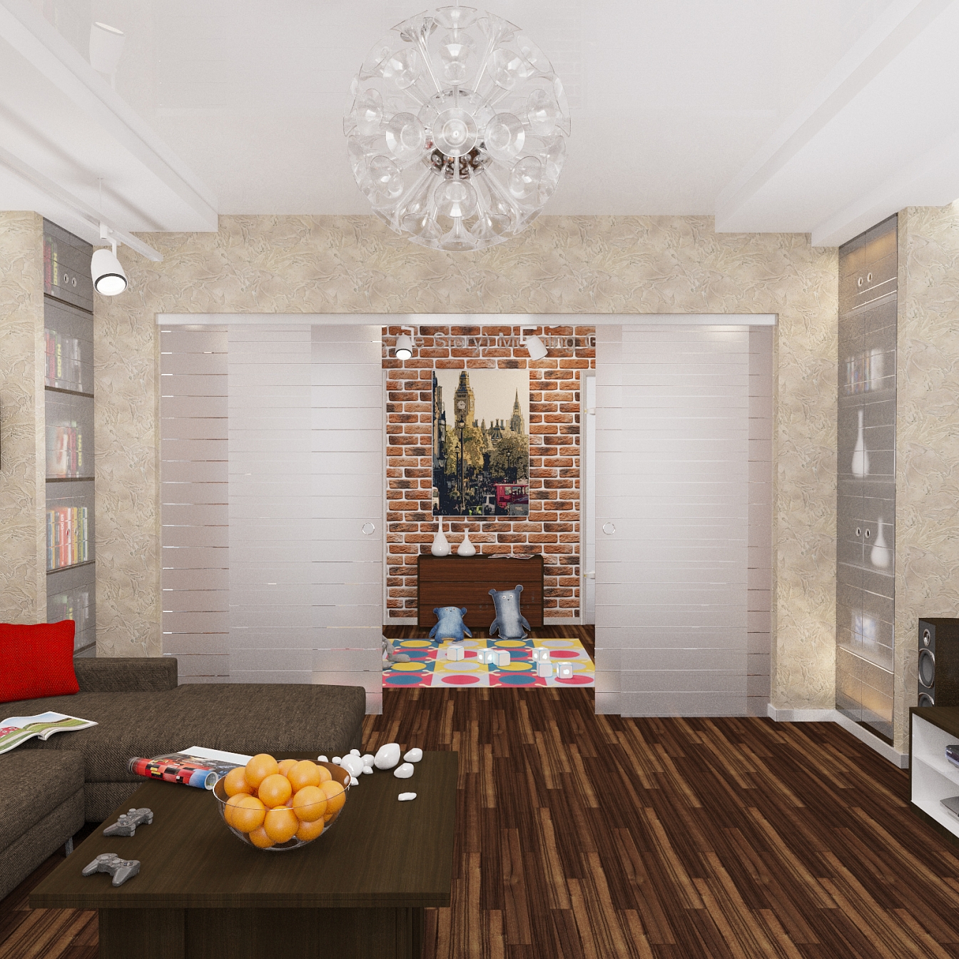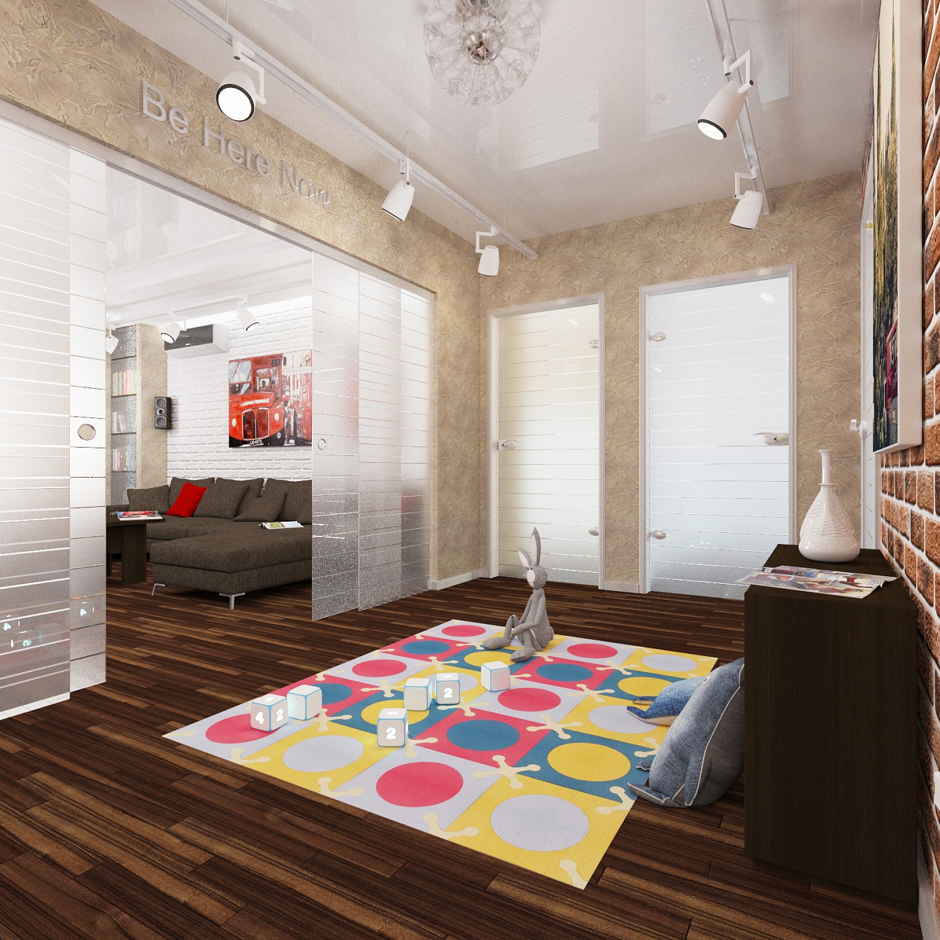 Интерьер квартиры предназначен для молодой семьи с двумя детьми. Предпочтения отдавались прочным, устойчивым материалам, как например, кирпич и декоративная штукатурка с грубой фактурой. Массивное дерево в мебели сочетается со стеклянными дверями и стальными фасадами на кухне. Получилась необычная, стильная квартира.