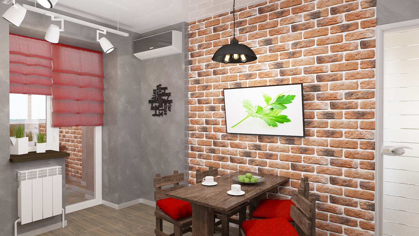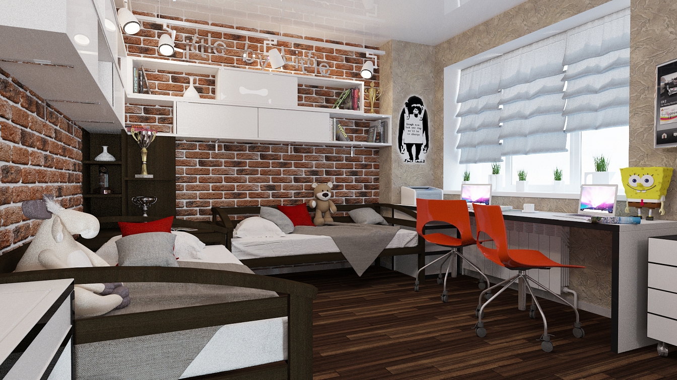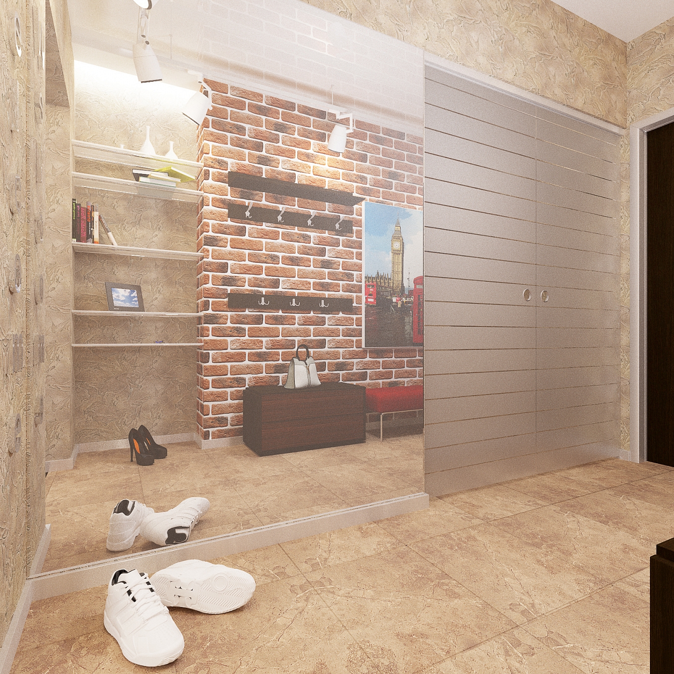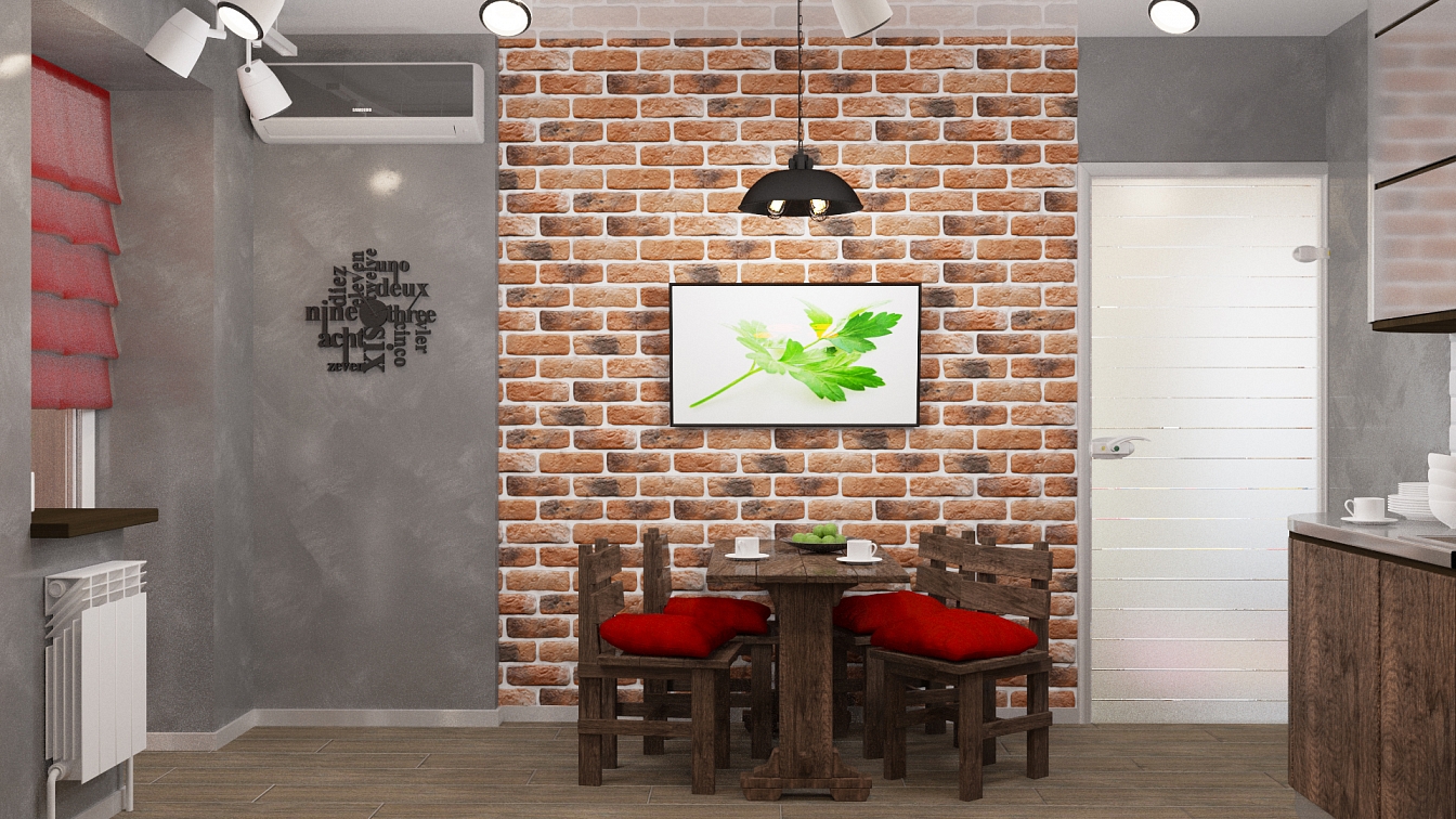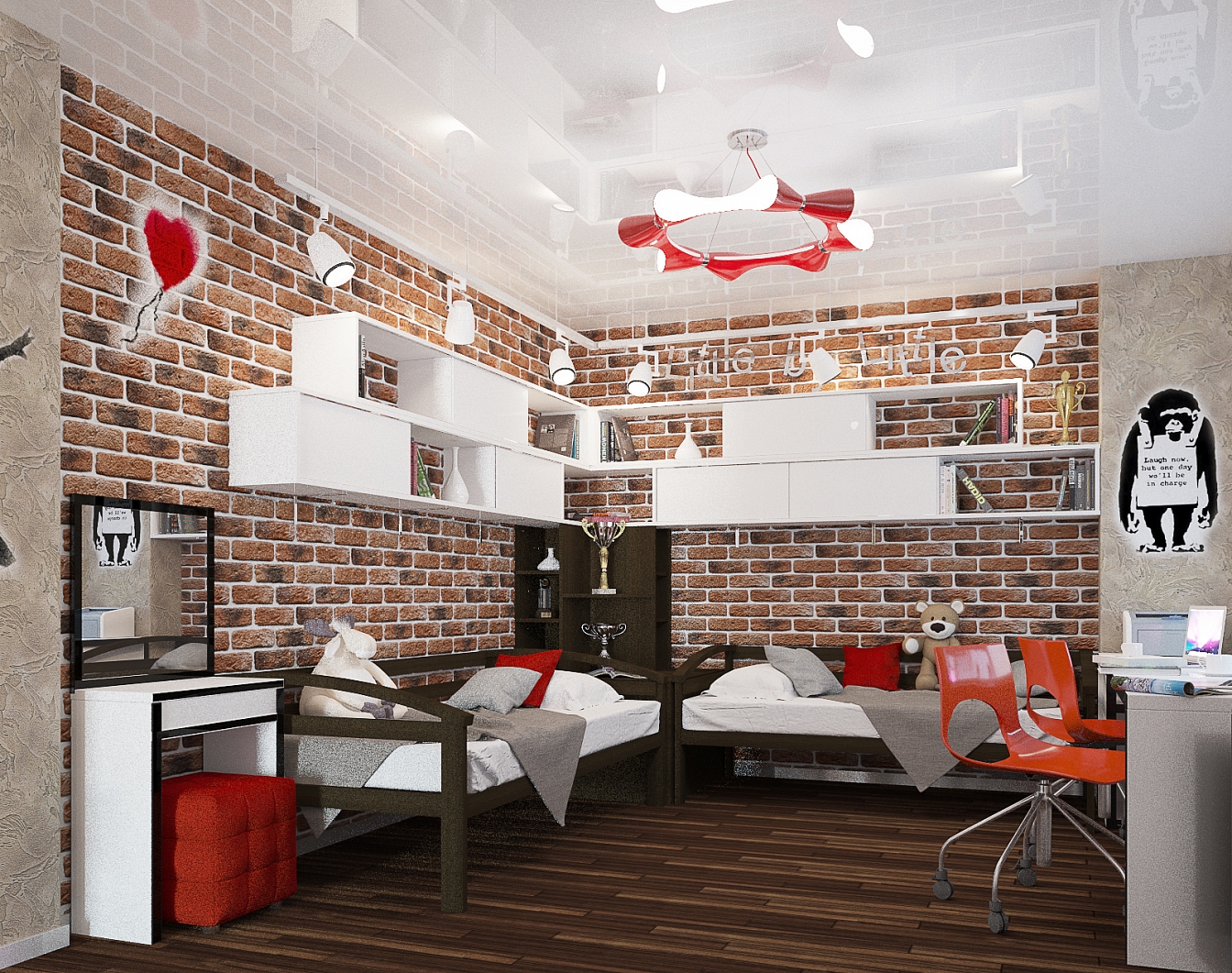 Интерьер квартиры предназначен для молодой семьи с двумя детьми. Предпочтения отдавались прочным, устойчивым материалам, как например, кирпич и декоративная штукатурка с грубой фактурой. Массивное дерево в мебели сочетается со стеклянными дверями и стальными фасадами на кухне. Получилась необычная, стильная квартира.