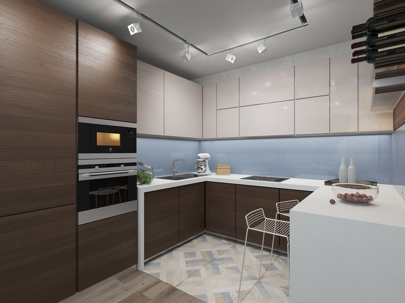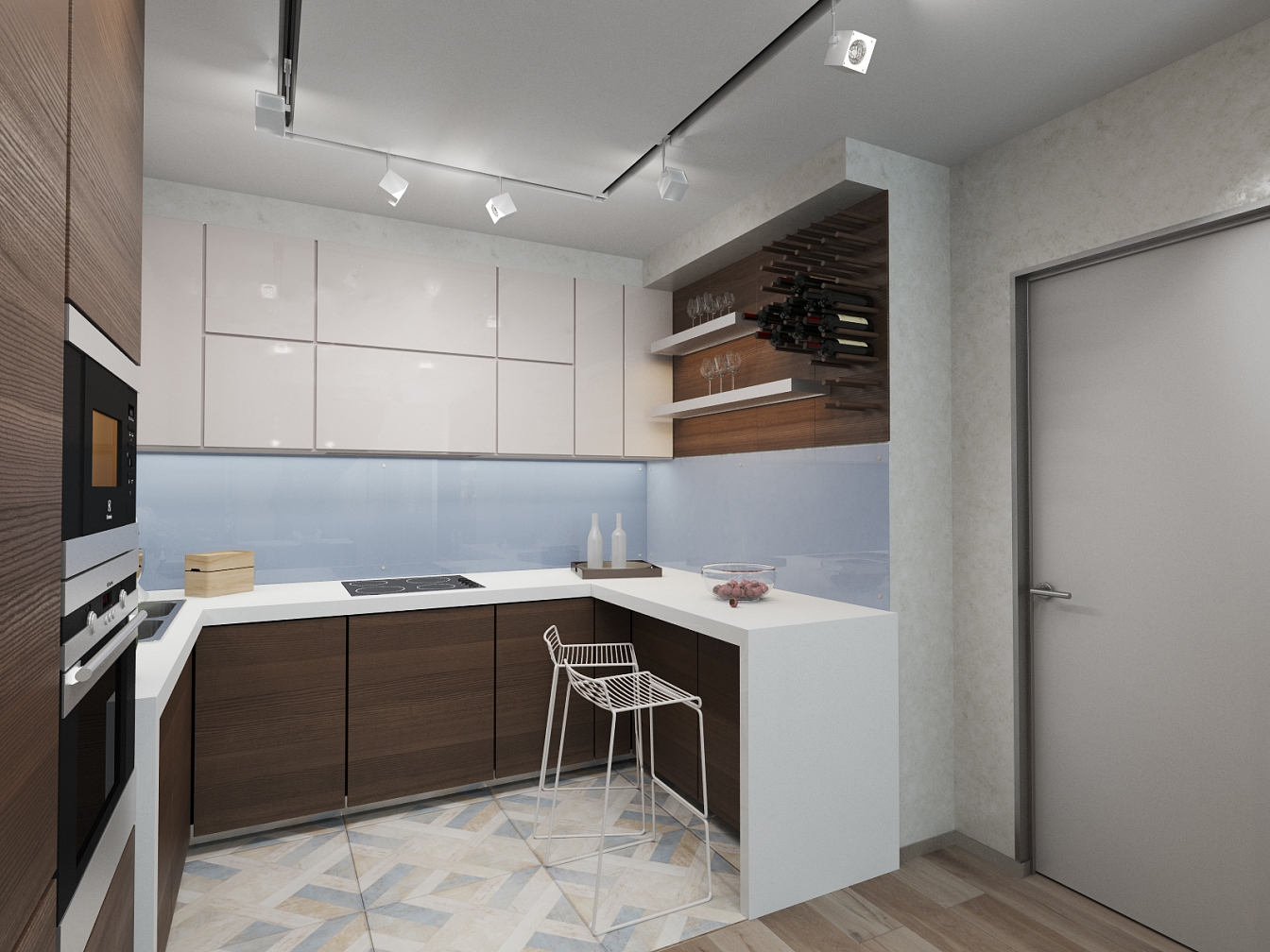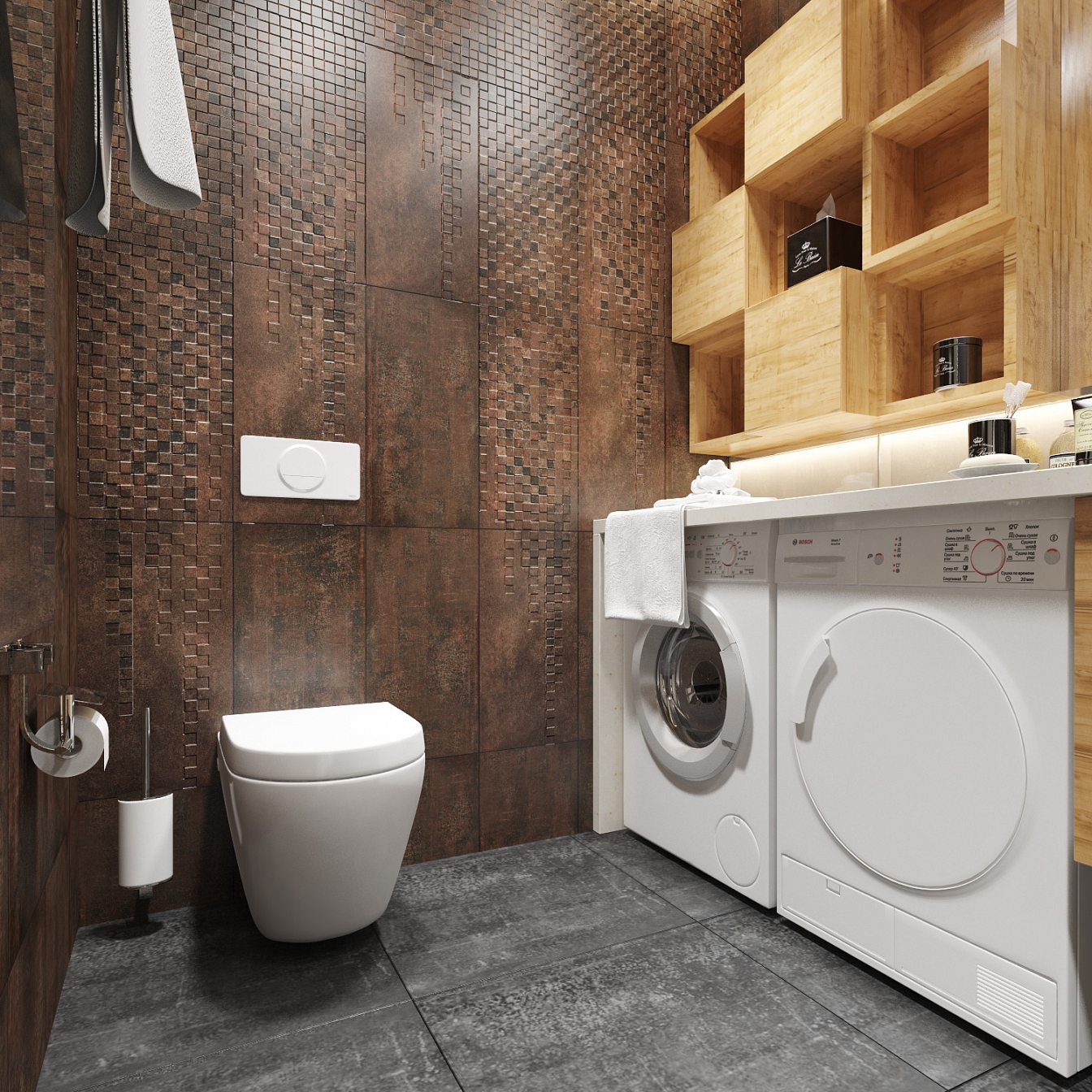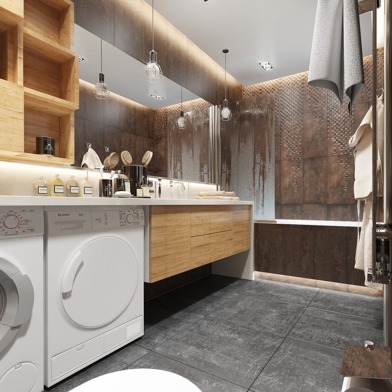 Деревянные балки на потолке в гостиной задают направление помещению и приводят к массивному стеллажу со складной системой дверей. Кухня тоже повторяет историю гостиной – чувствуется устойчивость и спокойствие в массивных кухонных поверхностях и стеклянном фартуке. В ванной используется плитка с имитацией ржавчины, стены здесь принимают на себя большое внимание, к ним притягивает взгляд дополнительная подсветка. Единая большая столешница объединяет раковину, стиральную и сушильную машины.