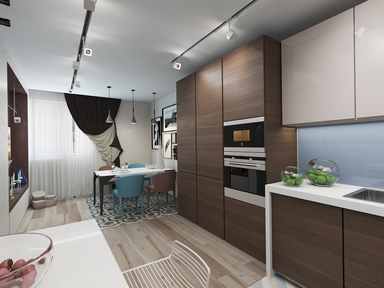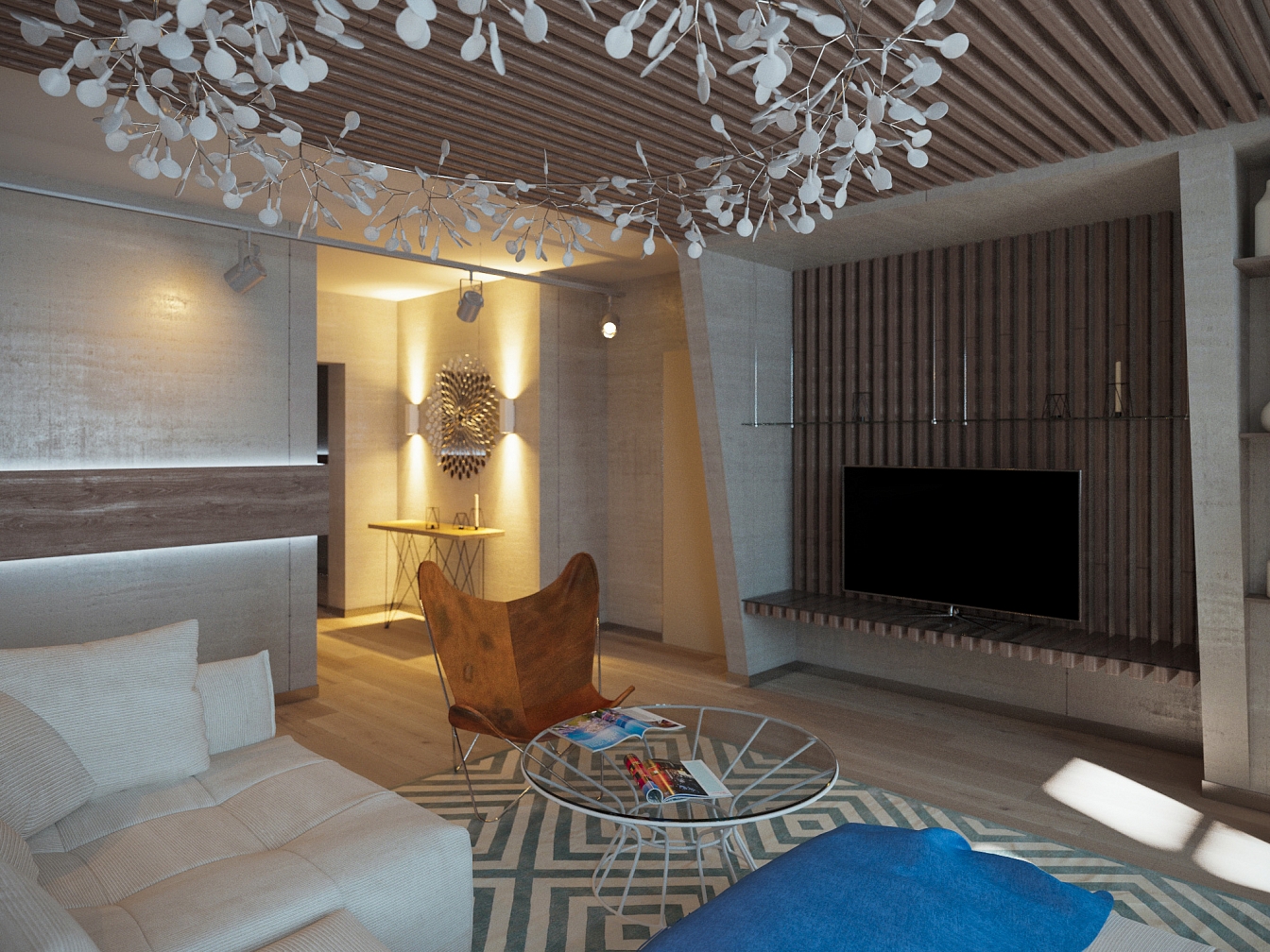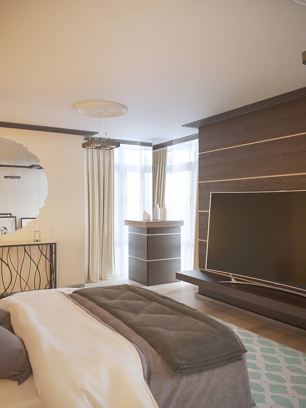 Проект квартиры для молодого человека. Лаконичный и строгий дизайн подкупает натуральным деревом в отделке, большими пространствами и элегантным уютом. Колонна в спальне «растворилась» благодаря зеркалам, добавляя пространство и свет.