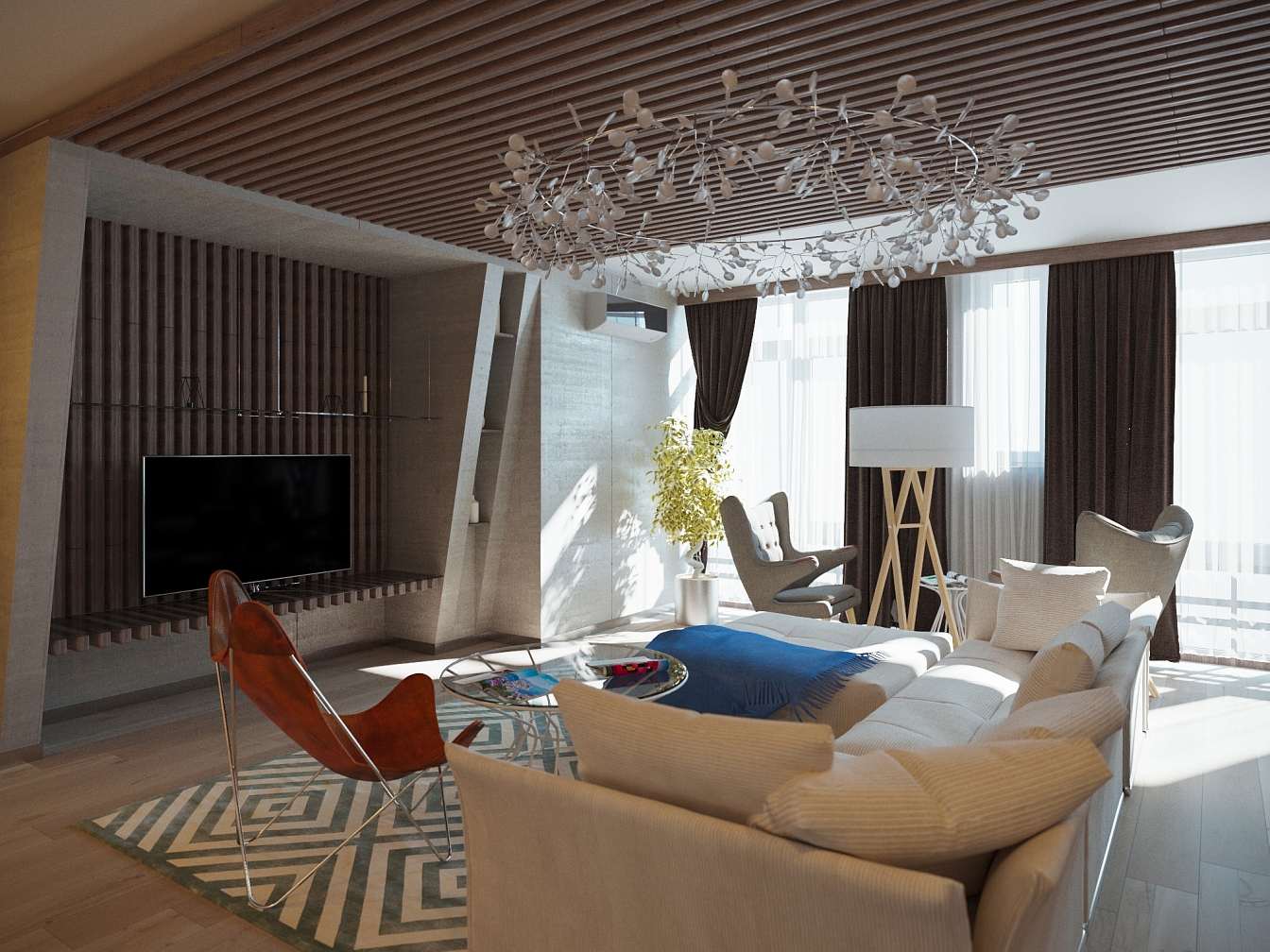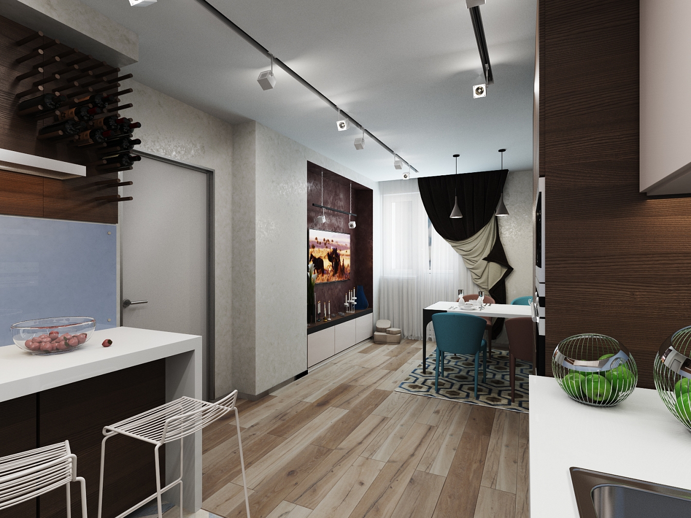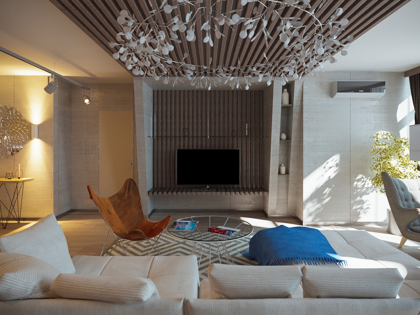 Проект квартиры для молодого человека. Лаконичный и строгий дизайн подкупает натуральным деревом в отделке, большими пространствами и элегантным уютом. Колонна в спальне «растворилась» благодаря зеркалам, добавляя пространство и свет.
