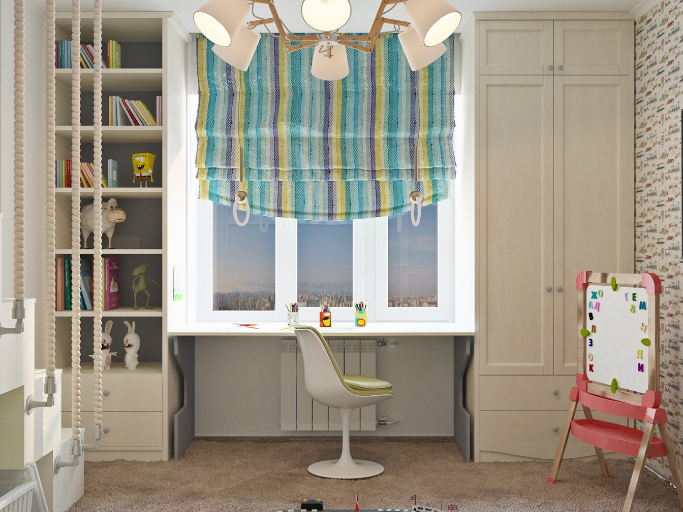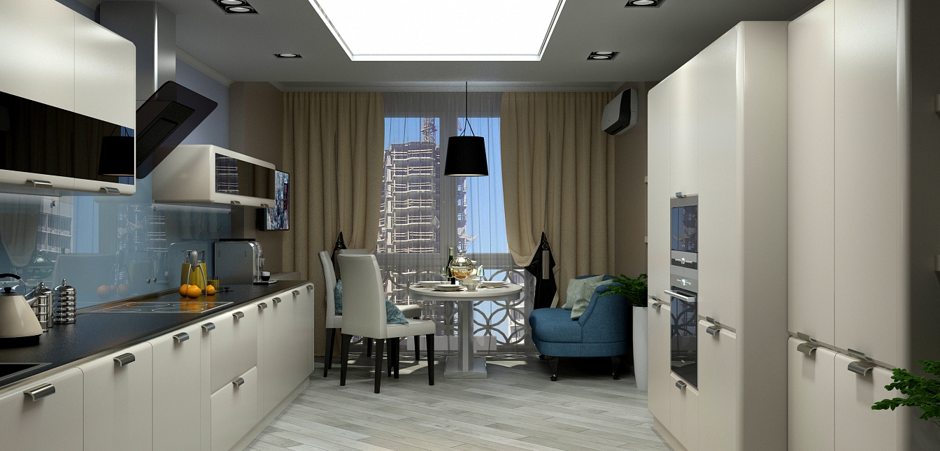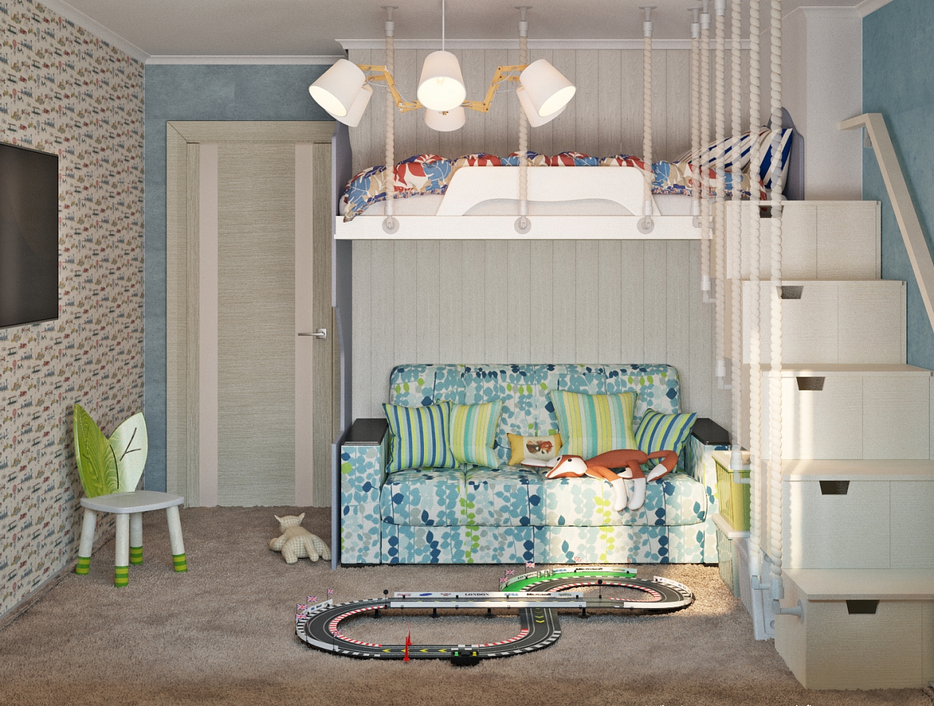 В спальне присутствуют классические мотивы – мягкая стежка капитоне на спинке кровати и на фасадах шкафа, молдинги и роспись за кроватью. Детская с кроватью-чердаком дополнена канатами для спокойствия родителей. Просторный письменный стол, и ёмкие шкафы - здесь есть всё для ребёнка. На диванчике под чердаком можно почитать с малышом. Коридор плавно перетекает в кухню. Она просторная, с высокими шкафами, с одной стороны, и большой рабочей поверхностью с другой. Уютная обеденная зона с большим окном и телевизором немного в стороне от приготовления. Там можно расслабиться и посидеть за чашечкой чая на мягком диванчике.