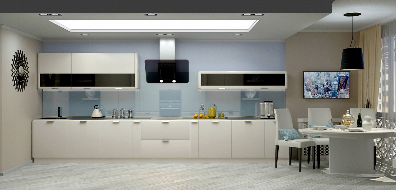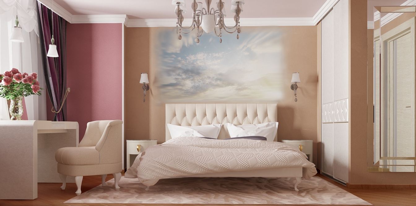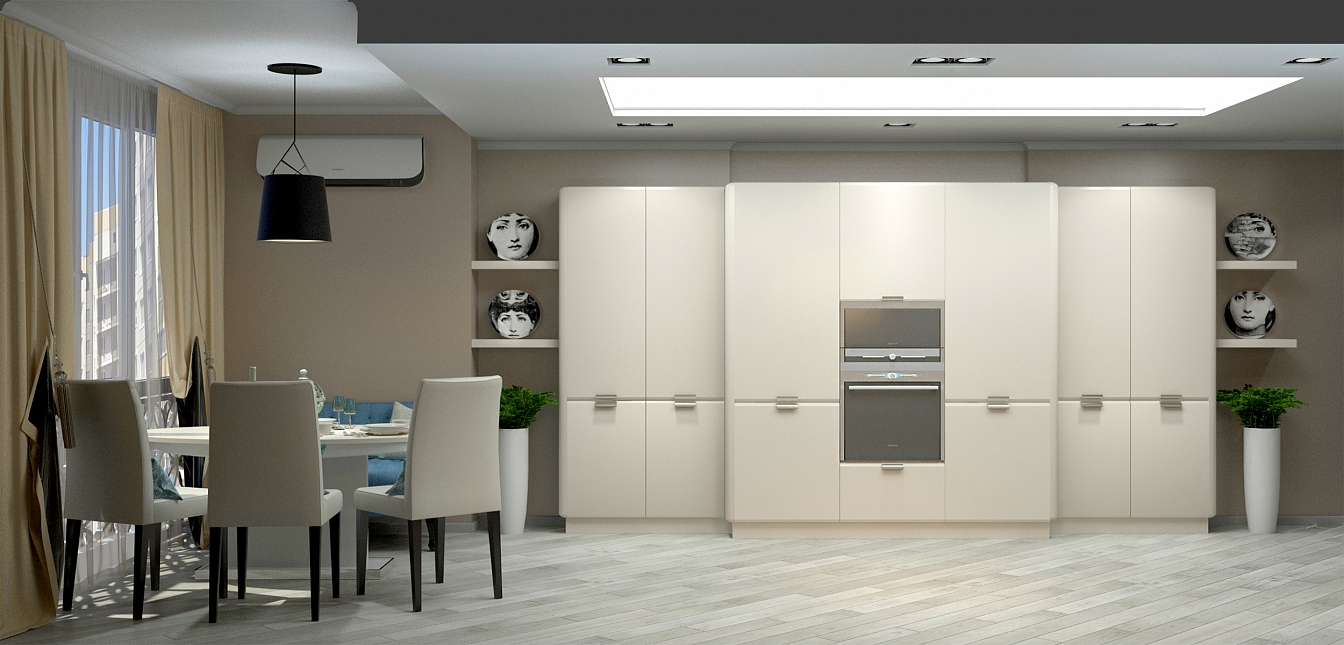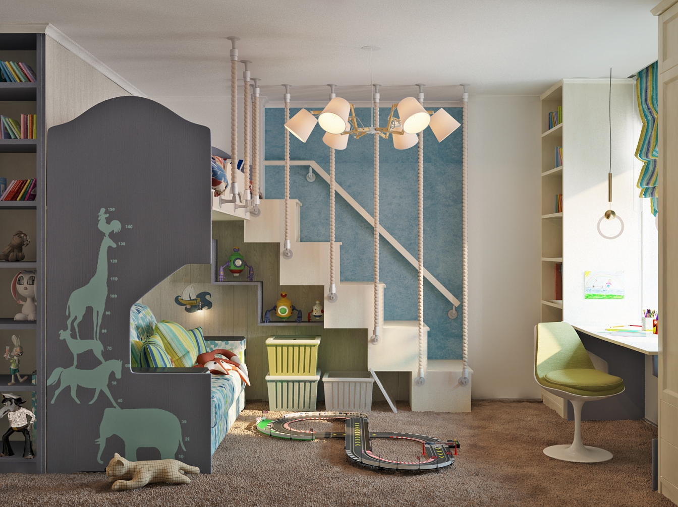 В спальне присутствуют классические мотивы – мягкая стежка капитоне на спинке кровати и на фасадах шкафа, молдинги и роспись за кроватью. Детская с кроватью-чердаком дополнена канатами для спокойствия родителей. Просторный письменный стол, и ёмкие шкафы - здесь есть всё для ребёнка. На диванчике под чердаком можно почитать с малышом. Коридор плавно перетекает в кухню. Она просторная, с высокими шкафами, с одной стороны, и большой рабочей поверхностью с другой. Уютная обеденная зона с большим окном и телевизором немного в стороне от приготовления. Там можно расслабиться и посидеть за чашечкой чая на мягком диванчике.