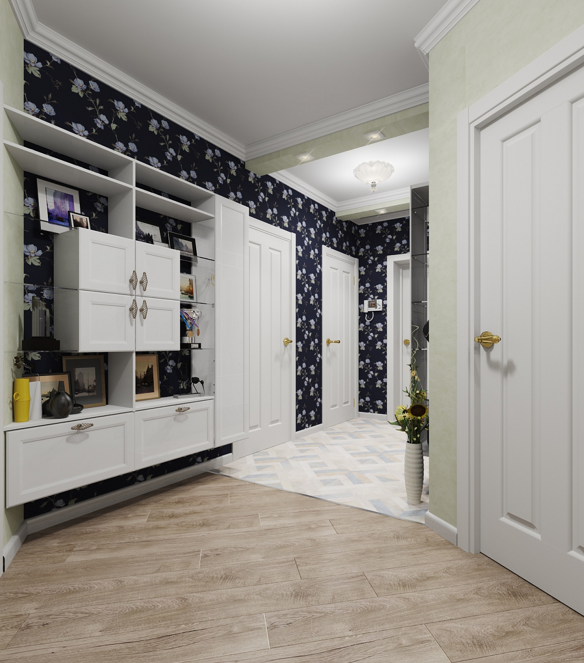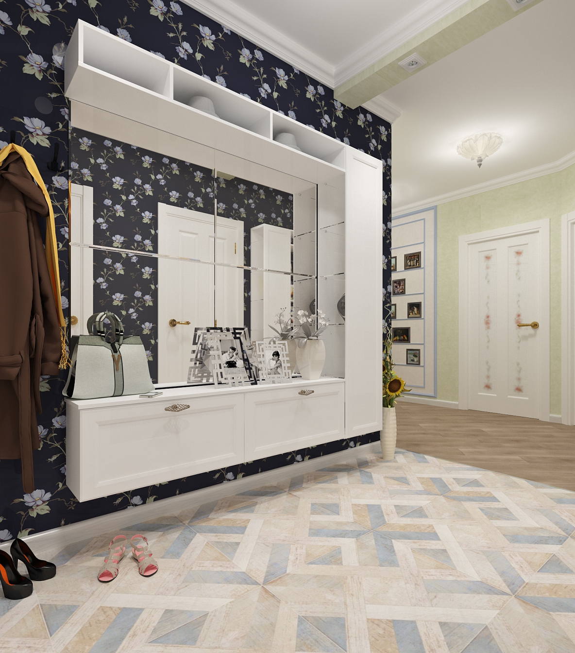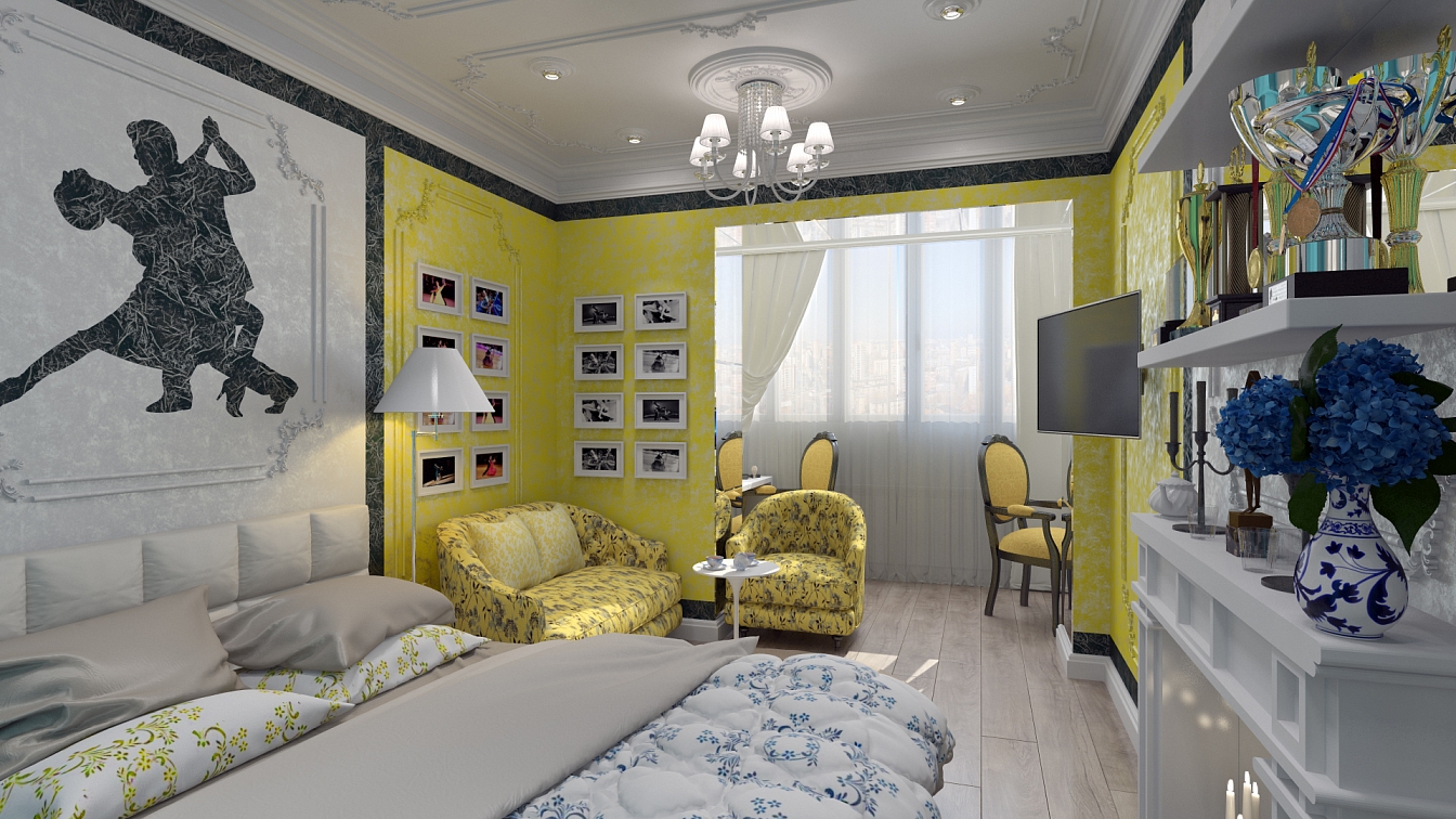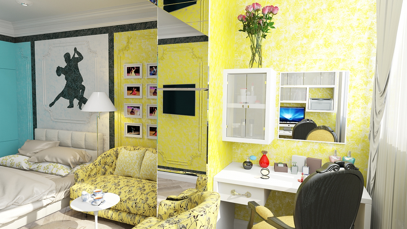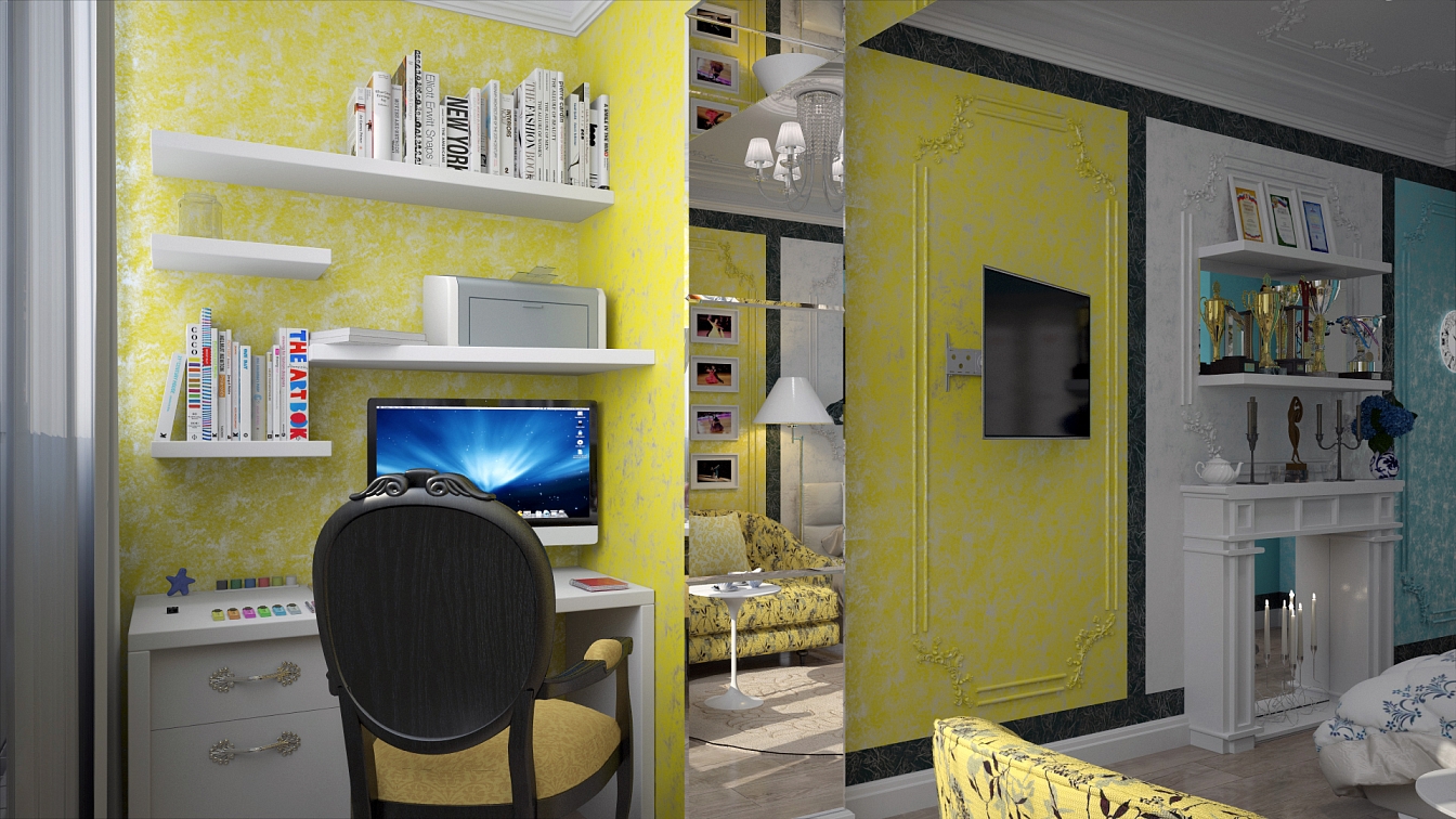 Заказчики не побоялись яркого желтого цвета для комнаты старшей дочери, смелого сочетания цветов для ванной комнаты. При этом остальные помещения очень спокойные, степенные. Обои подчеркивают мягкость обстановки. Цветочный орнамент со стен коридора переходит в гостиную, меняясь в фоне.