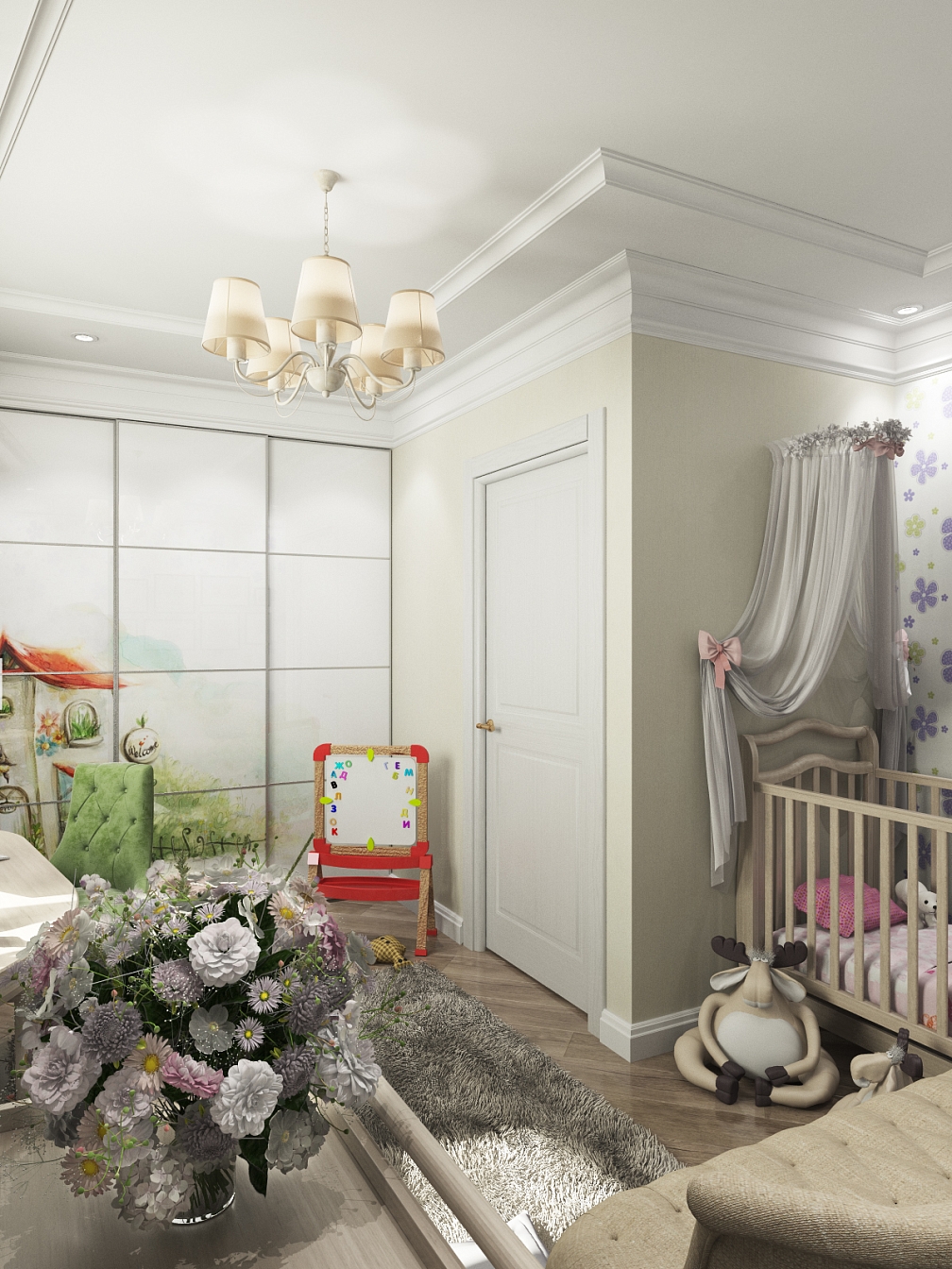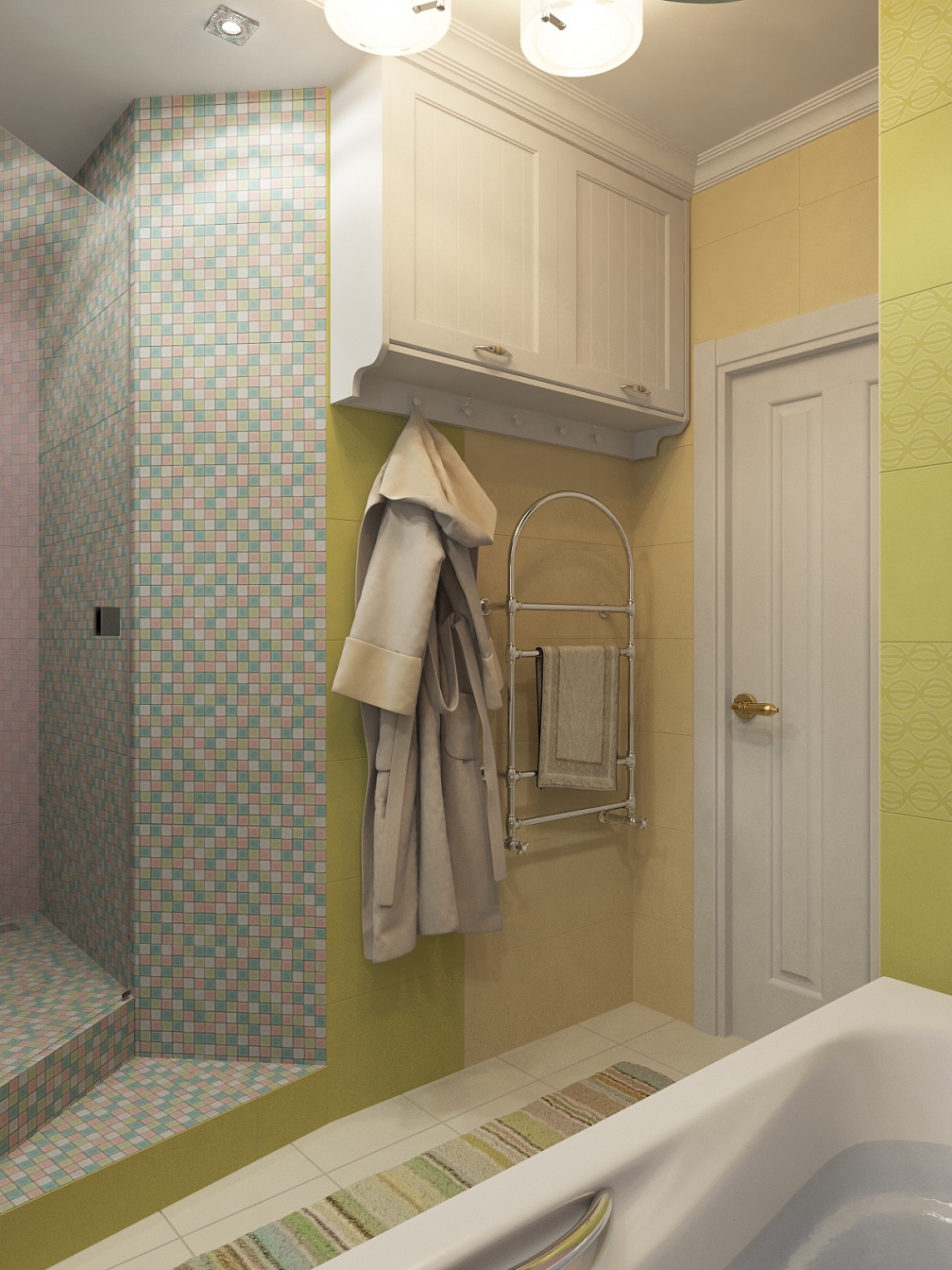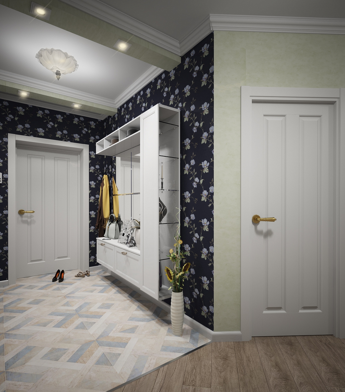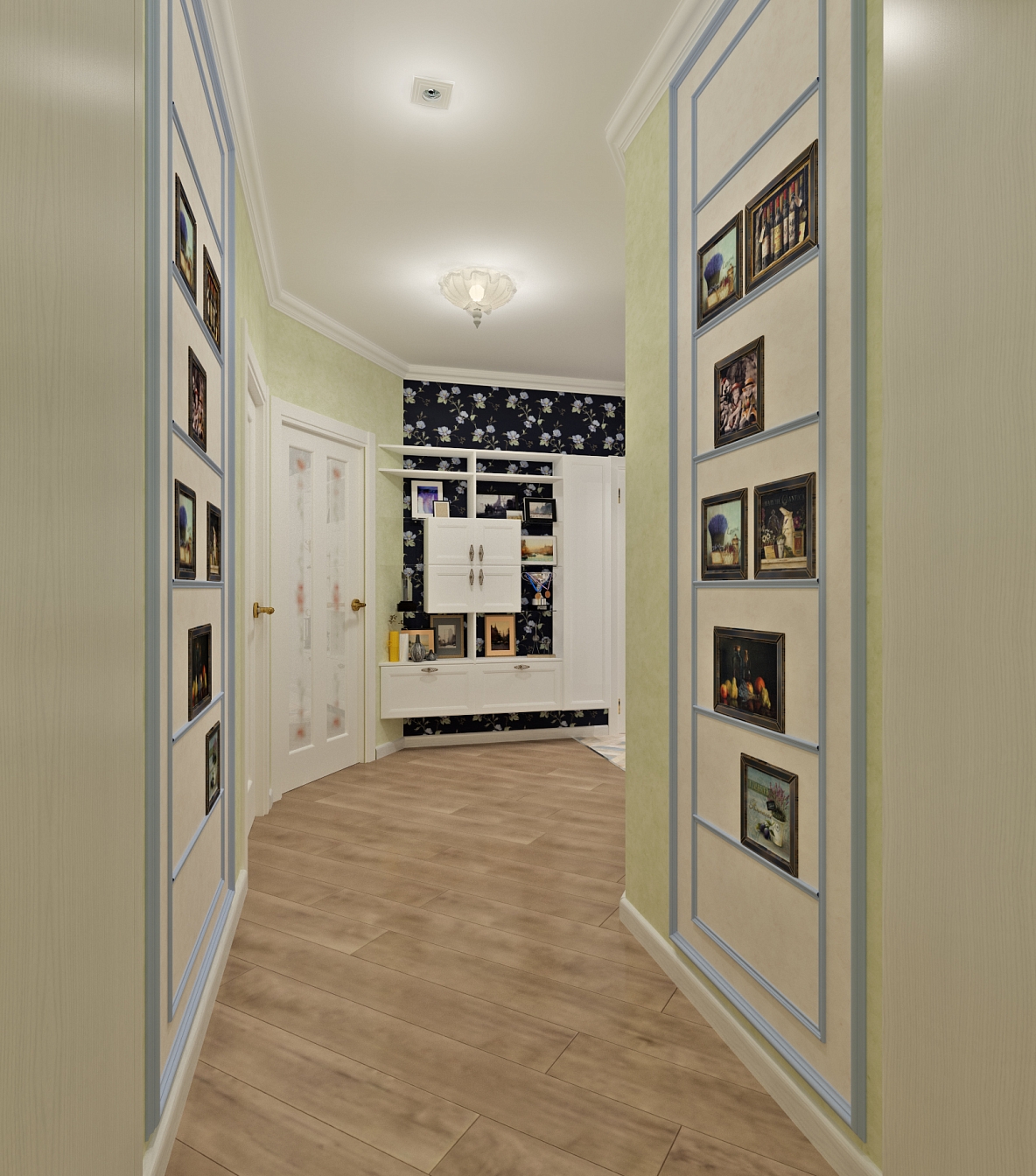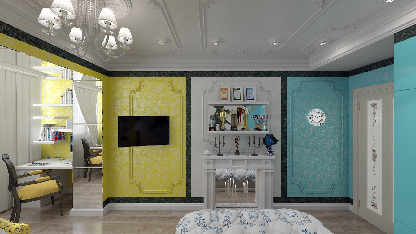 Заказчики не побоялись яркого желтого цвета для комнаты старшей дочери, смелого сочетания цветов для ванной комнаты. При этом остальные помещения очень спокойные, степенные. Обои подчеркивают мягкость обстановки. Цветочный орнамент со стен коридора переходит в гостиную, меняясь в фоне.