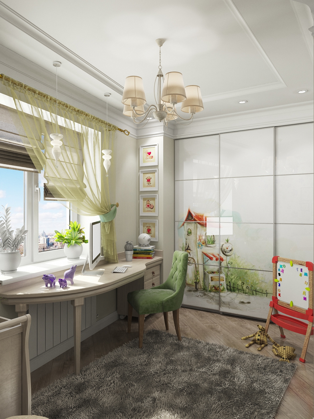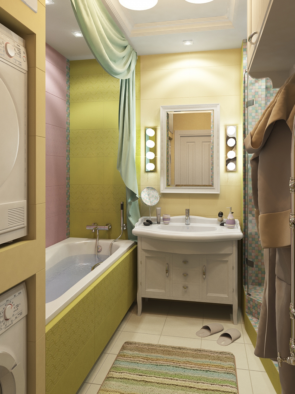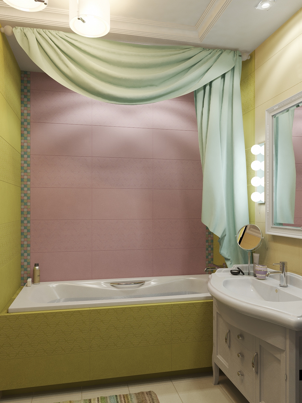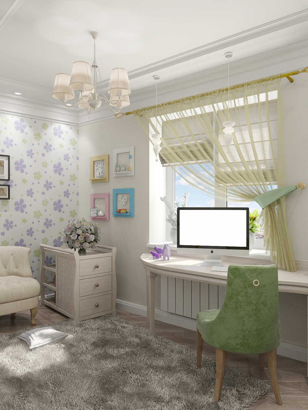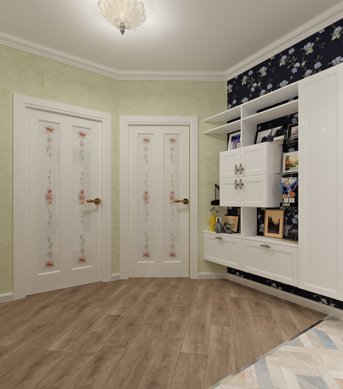 Заказчики не побоялись яркого желтого цвета для комнаты старшей дочери, смелого сочетания цветов для ванной комнаты. При этом остальные помещения очень спокойные, степенные. Обои подчеркивают мягкость обстановки. Цветочный орнамент со стен коридора переходит в гостиную, меняясь в фоне.