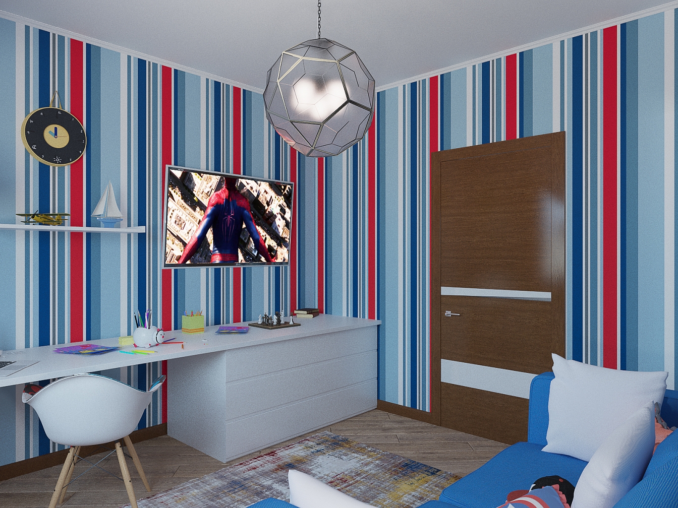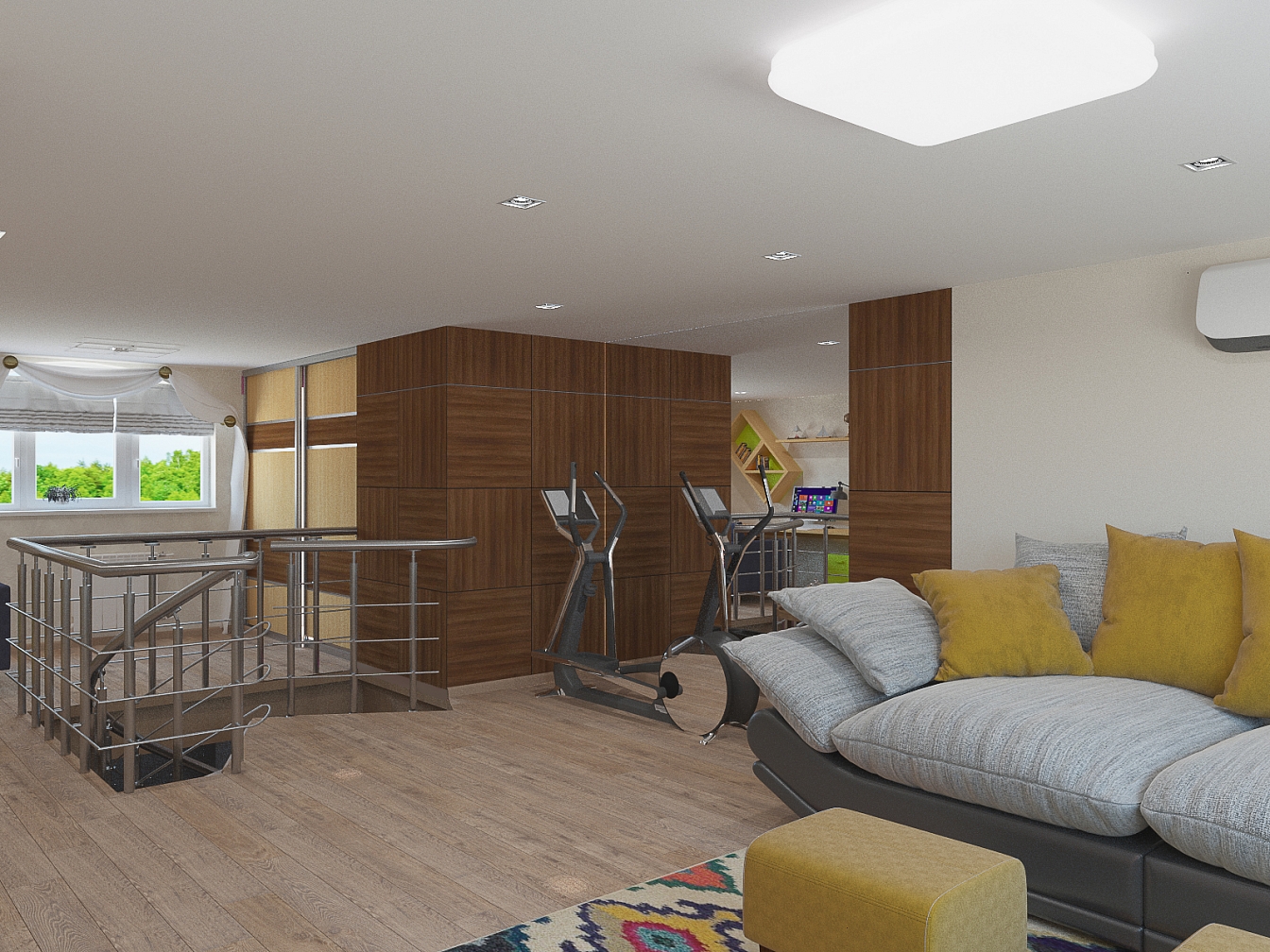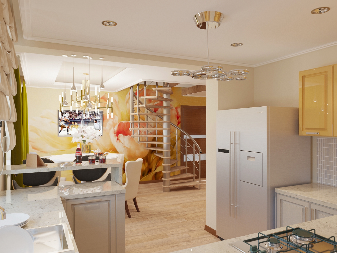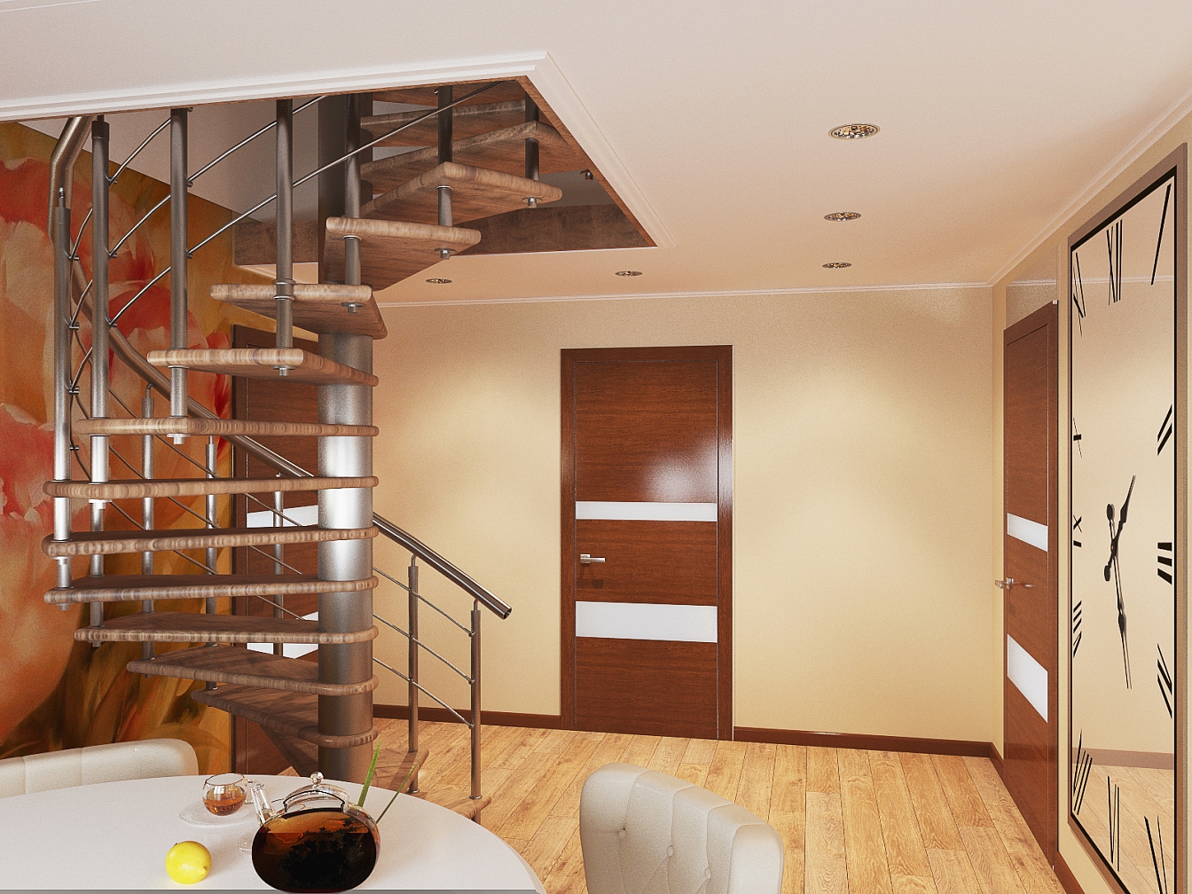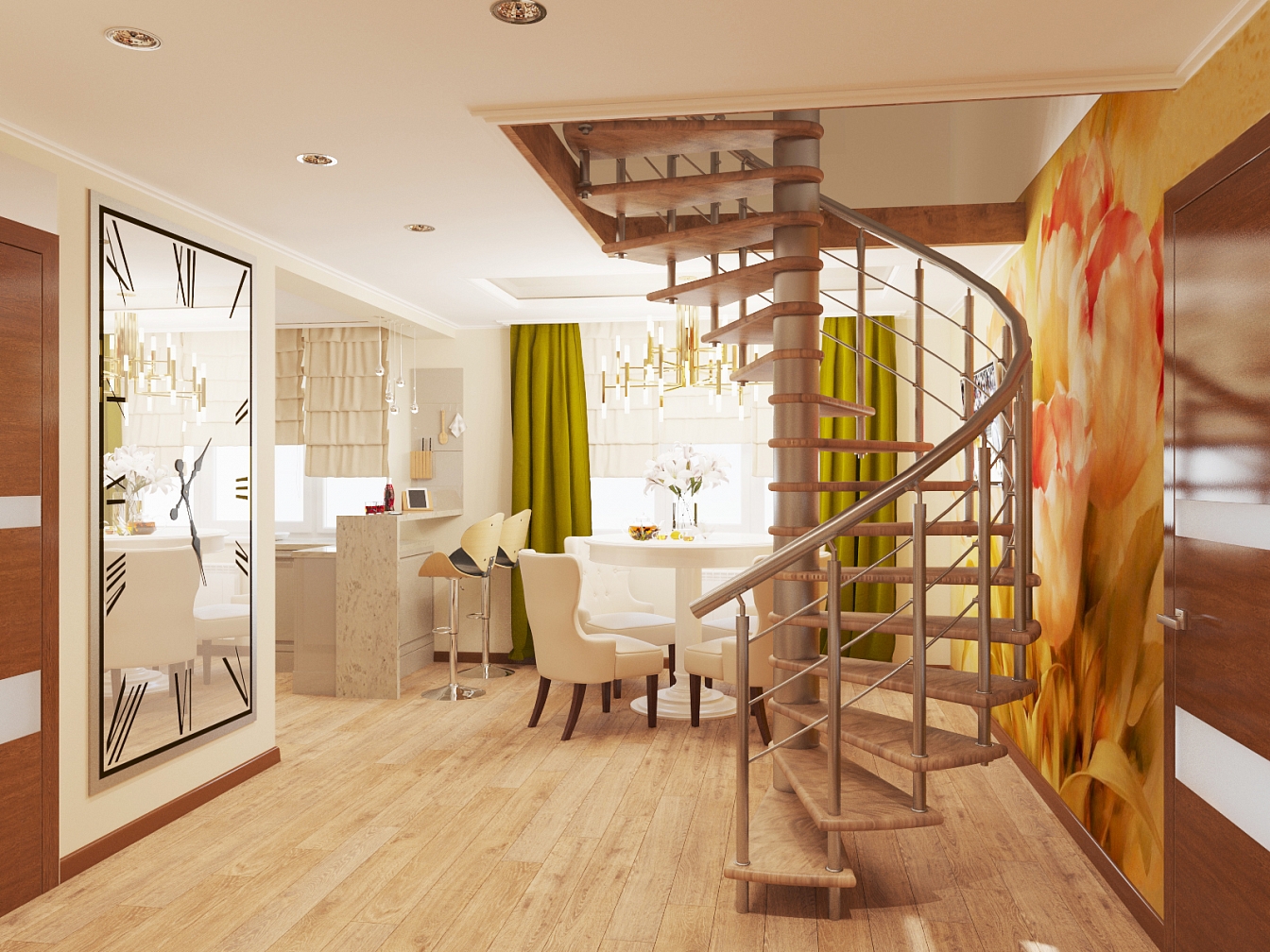 Мы попадаем в интерьер, полный контраста. Здесь насыщенная темно-коричневая штукатурка из прихожей переходит в гостиную. Круглая люстра Caboshe сочетается с зеркалом, оранжевые вставки в мебели контрастируют с мятным цветом дивана. Точечные светильники большого размера отлично дополнены потолочными карнизами. Выглядит вполне по-мужски. Кухня-столовая более женская, с цветочной фреской в зоне обеденного стола, желтой кухней и нейтральными стенами. Большие часы-зеркало отражают винтовую лестницу, которая ведет на второй этаж. Там расположено рабочее место хозяина и небольшой спортзал. Панели из дерева повторяют облицовку лестницы. В спальне мягкие стеновые панели и круглая кровать располагают к приятному отдыху. Детская для активного ребенка с сине-красными полосками.