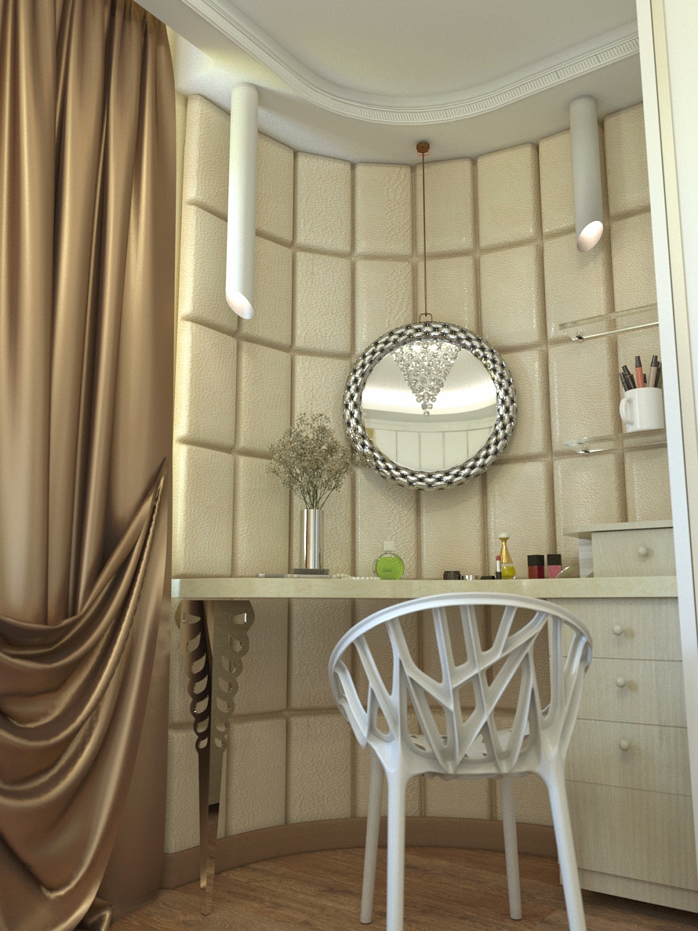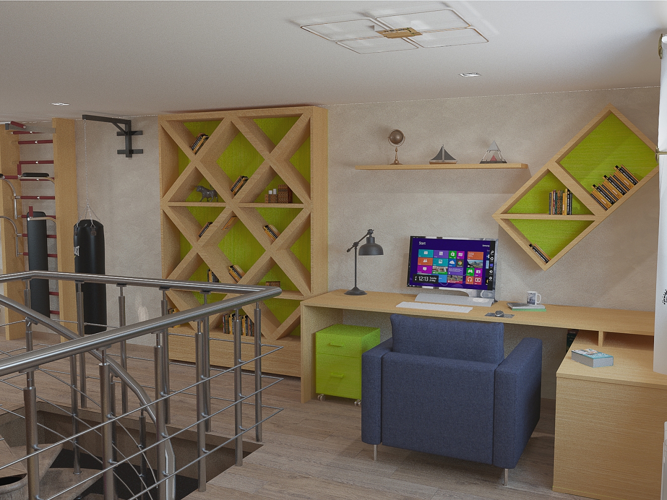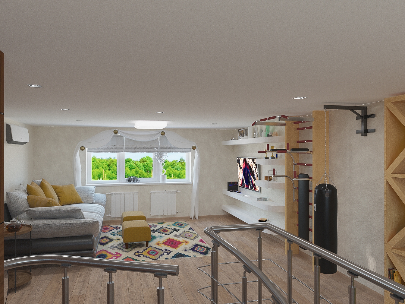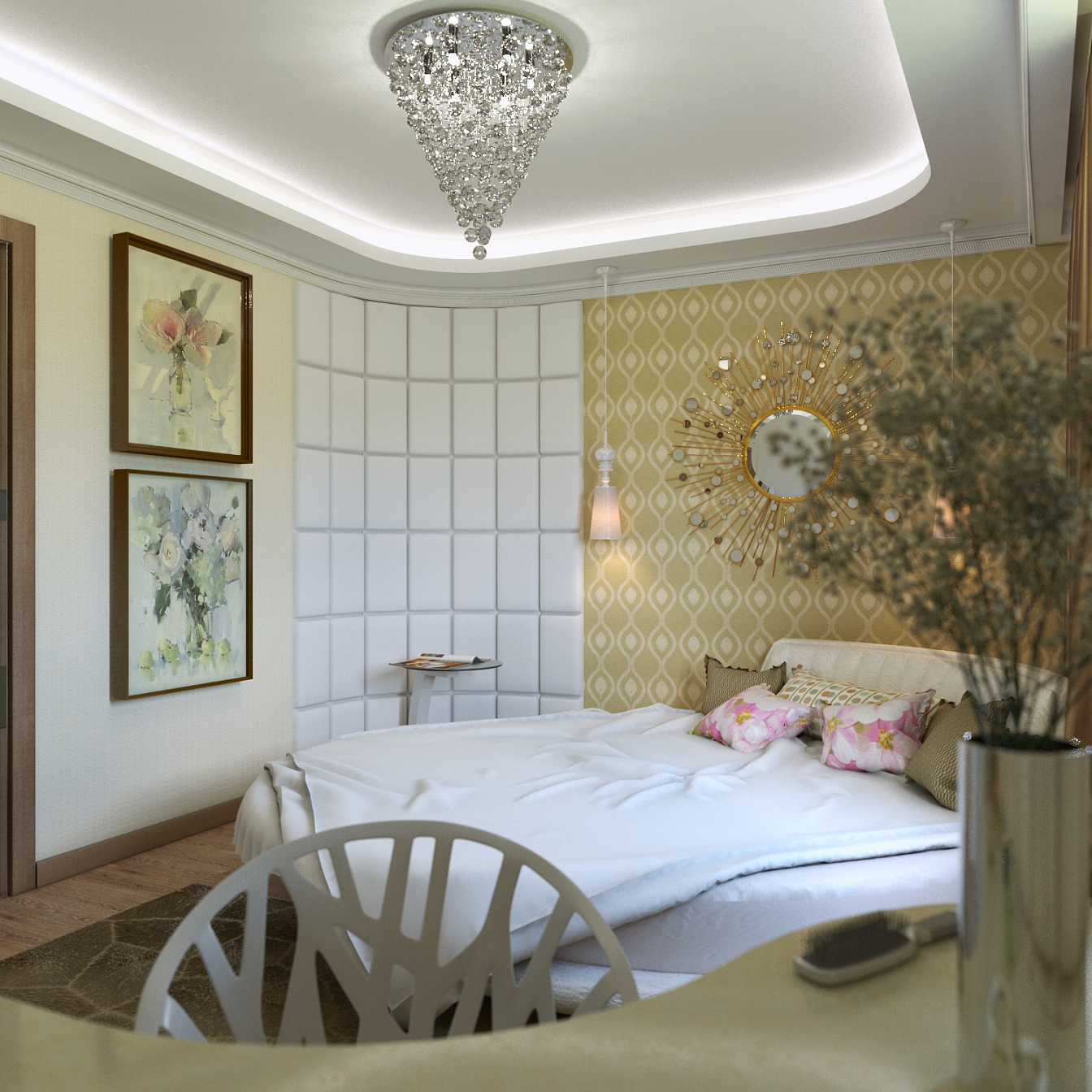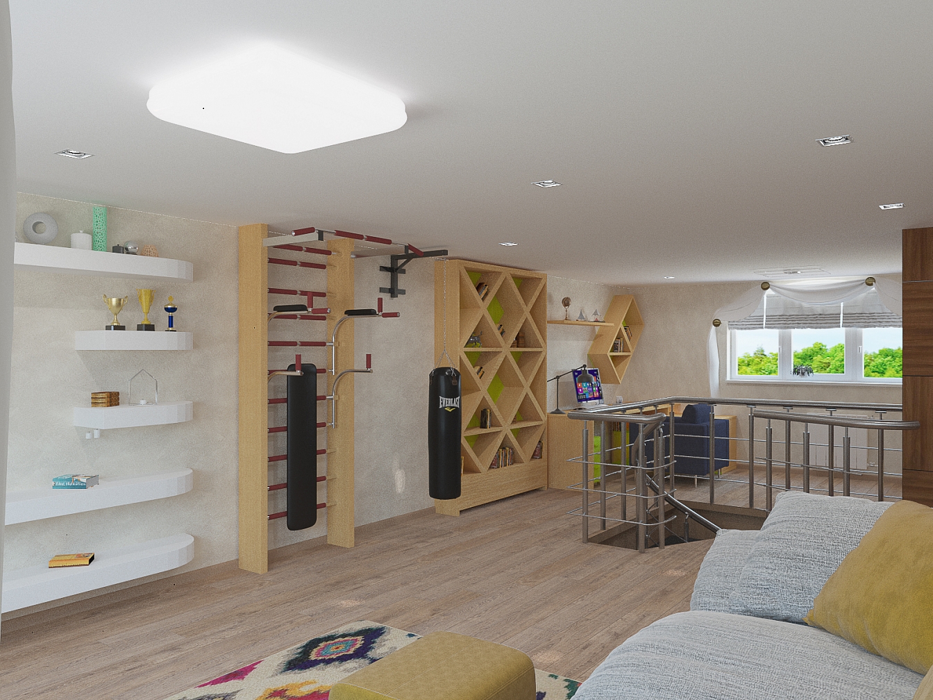 Мы попадаем в интерьер, полный контраста. Здесь насыщенная темно-коричневая штукатурка из прихожей переходит в гостиную. Круглая люстра Caboshe сочетается с зеркалом, оранжевые вставки в мебели контрастируют с мятным цветом дивана. Точечные светильники большого размера отлично дополнены потолочными карнизами. Выглядит вполне по-мужски. Кухня-столовая более женская, с цветочной фреской в зоне обеденного стола, желтой кухней и нейтральными стенами. Большие часы-зеркало отражают винтовую лестницу, которая ведет на второй этаж. Там расположено рабочее место хозяина и небольшой спортзал. Панели из дерева повторяют облицовку лестницы. В спальне мягкие стеновые панели и круглая кровать располагают к приятному отдыху. Детская для активного ребенка с сине-красными полосками.
