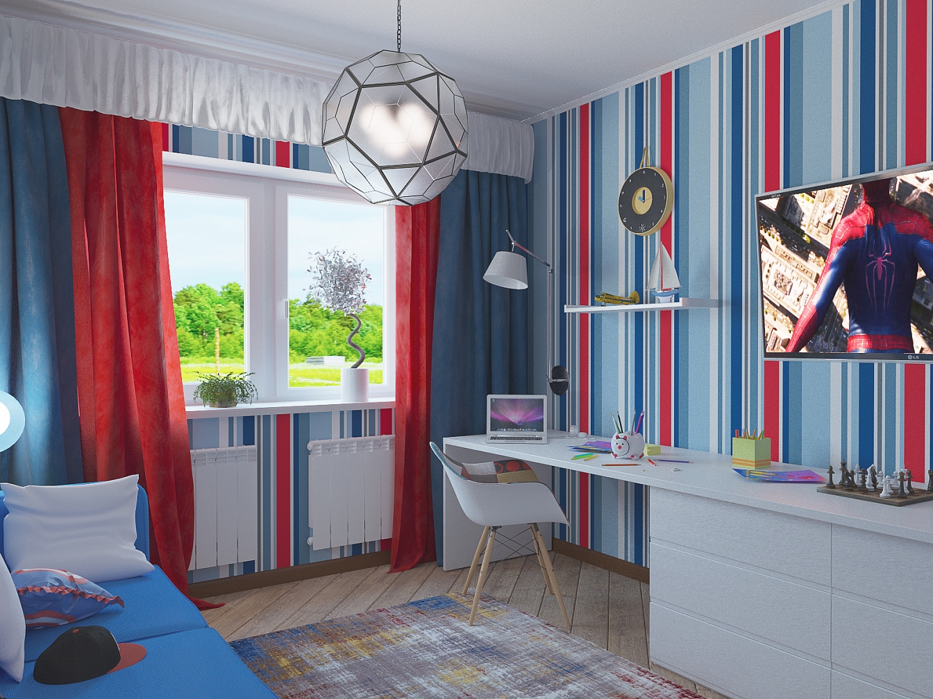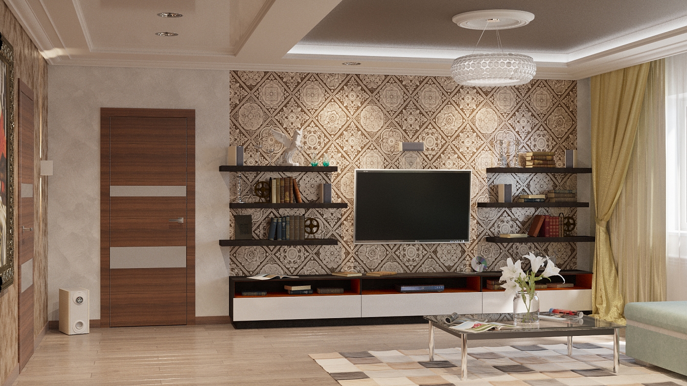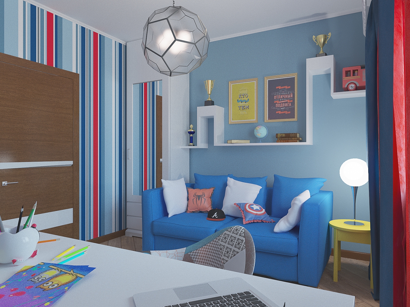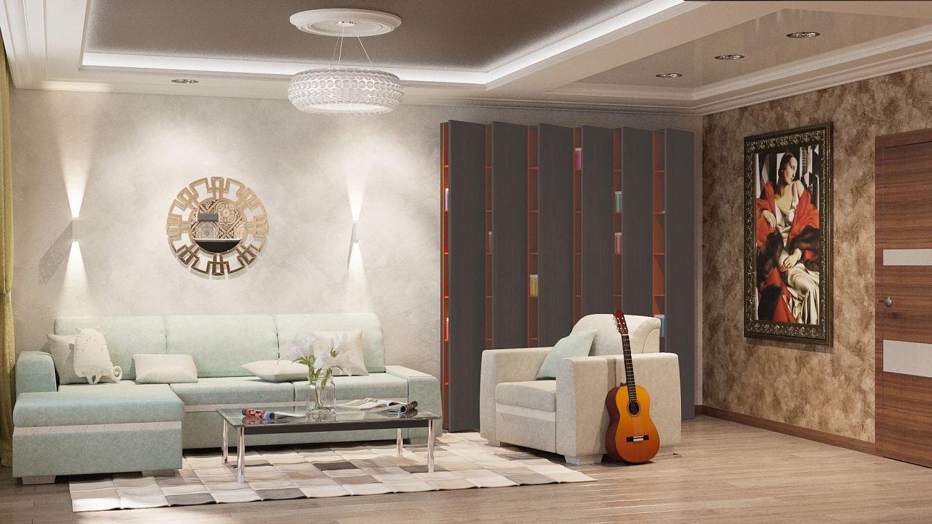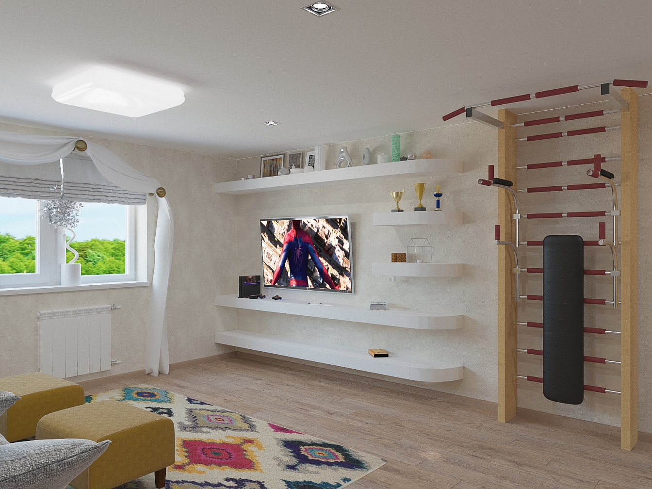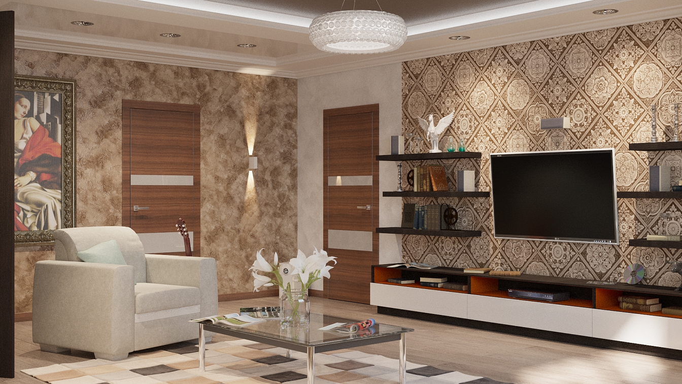 Мы попадаем в интерьер, полный контраста. Здесь насыщенная темно-коричневая штукатурка из прихожей переходит в гостиную. Круглая люстра Caboshe сочетается с зеркалом, оранжевые вставки в мебели контрастируют с мятным цветом дивана. Точечные светильники большого размера отлично дополнены потолочными карнизами. Выглядит вполне по-мужски. Кухня-столовая более женская, с цветочной фреской в зоне обеденного стола, желтой кухней и нейтральными стенами. Большие часы-зеркало отражают винтовую лестницу, которая ведет на второй этаж. Там расположено рабочее место хозяина и небольшой спортзал. Панели из дерева повторяют облицовку лестницы. В спальне мягкие стеновые панели и круглая кровать располагают к приятному отдыху. Детская для активного ребенка с сине-красными полосками.
