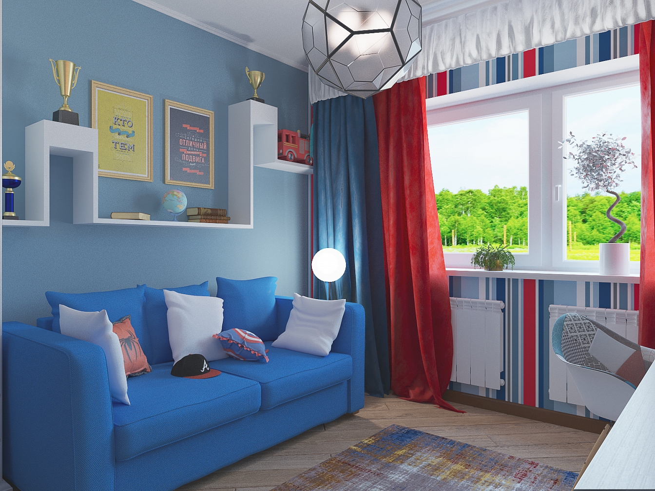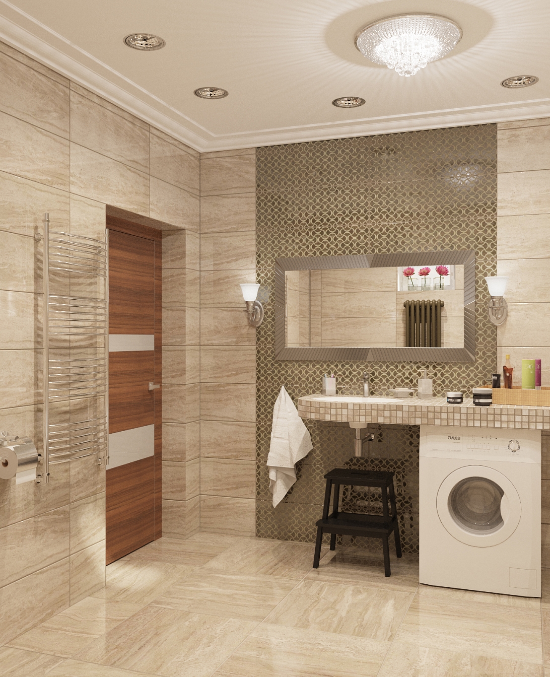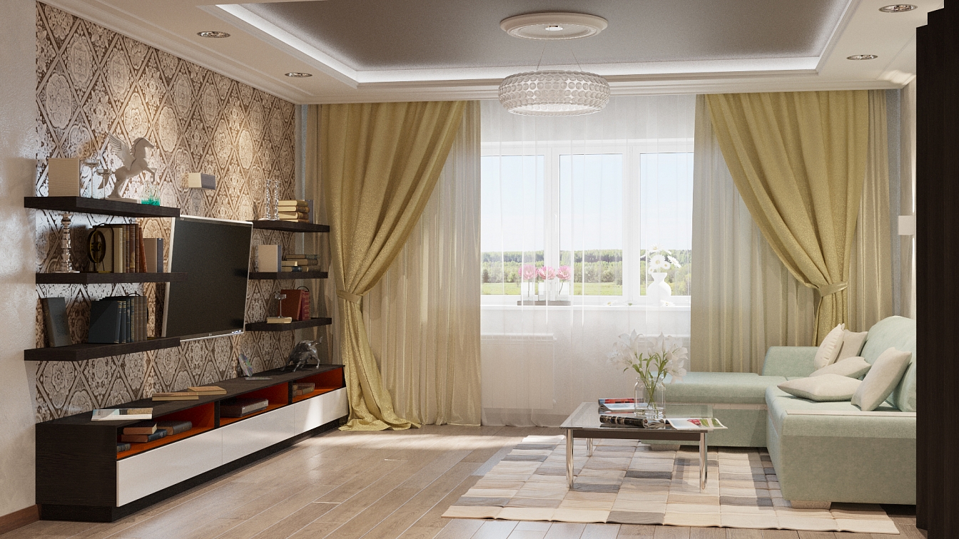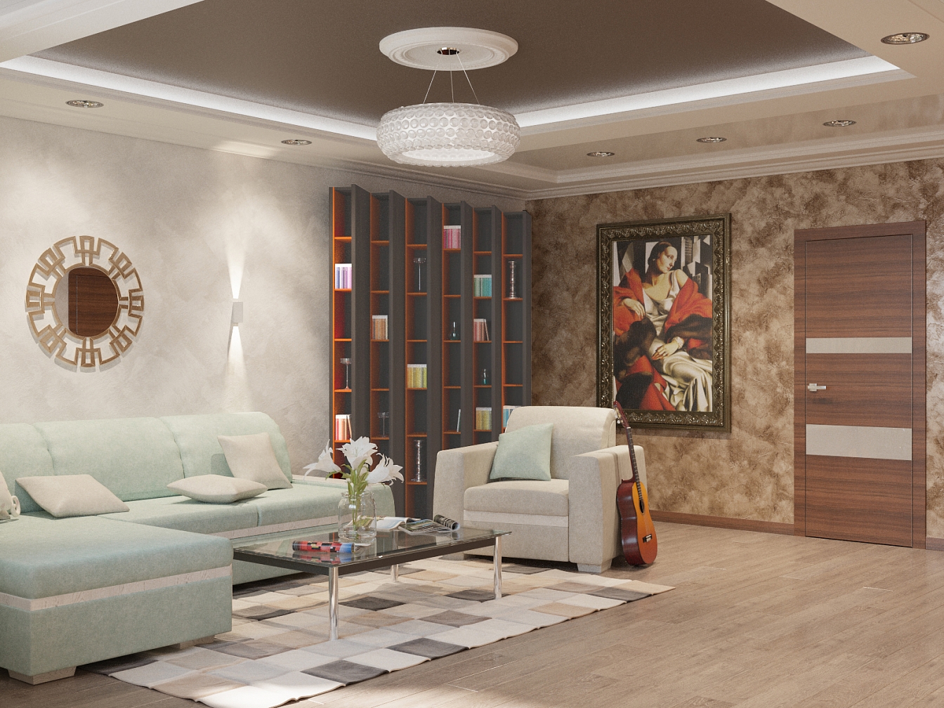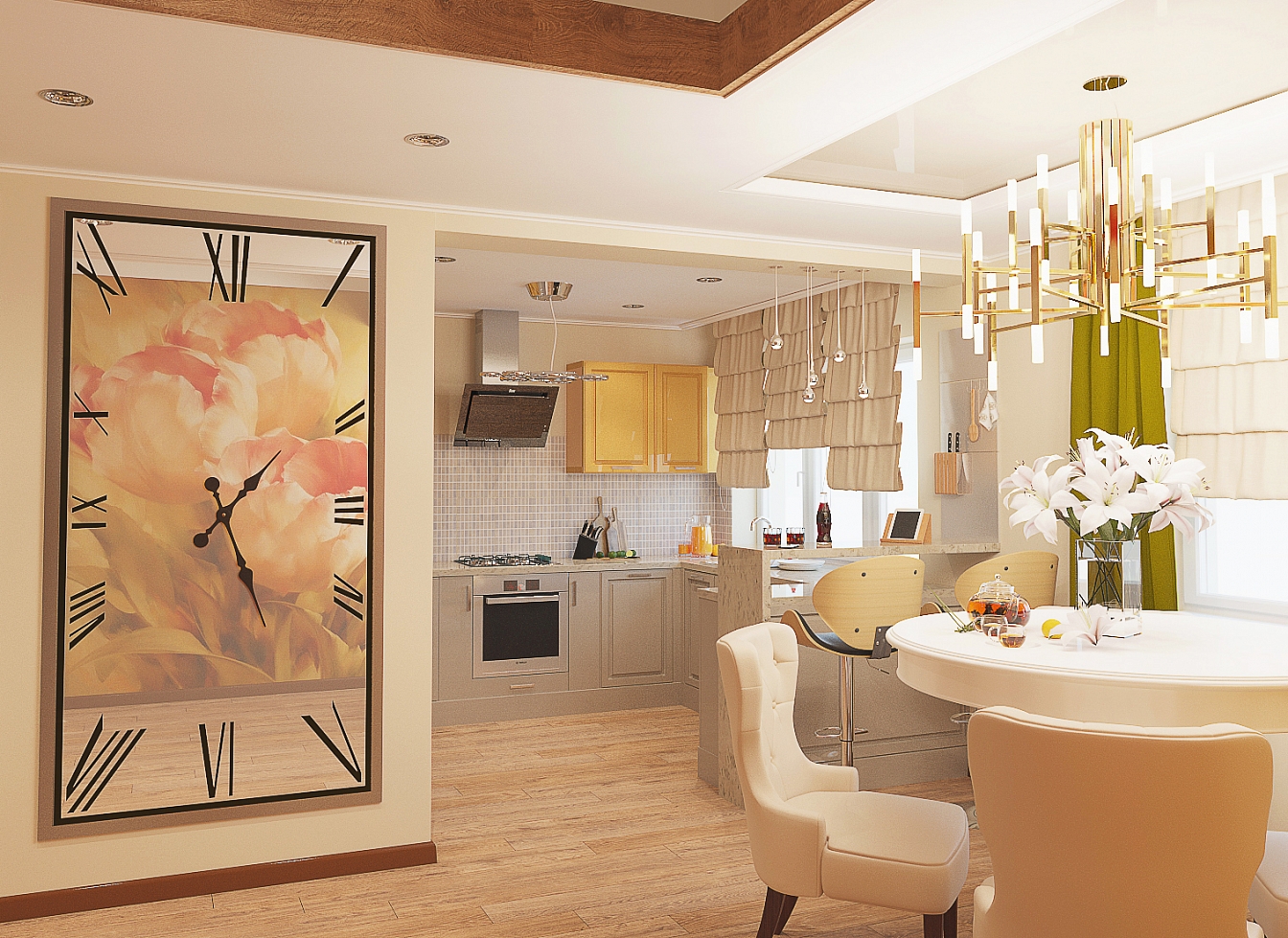 Мы попадаем в интерьер, полный контраста. Здесь насыщенная темно-коричневая штукатурка из прихожей переходит в гостиную. Круглая люстра Caboshe сочетается с зеркалом, оранжевые вставки в мебели контрастируют с мятным цветом дивана. Точечные светильники большого размера отлично дополнены потолочными карнизами. Выглядит вполне по-мужски. Кухня-столовая более женская, с цветочной фреской в зоне обеденного стола, желтой кухней и нейтральными стенами. Большие часы-зеркало отражают винтовую лестницу, которая ведет на второй этаж. Там расположено рабочее место хозяина и небольшой спортзал. Панели из дерева повторяют облицовку лестницы. В спальне мягкие стеновые панели и круглая кровать располагают к приятному отдыху. Детская для активного ребенка с сине-красными полосками.