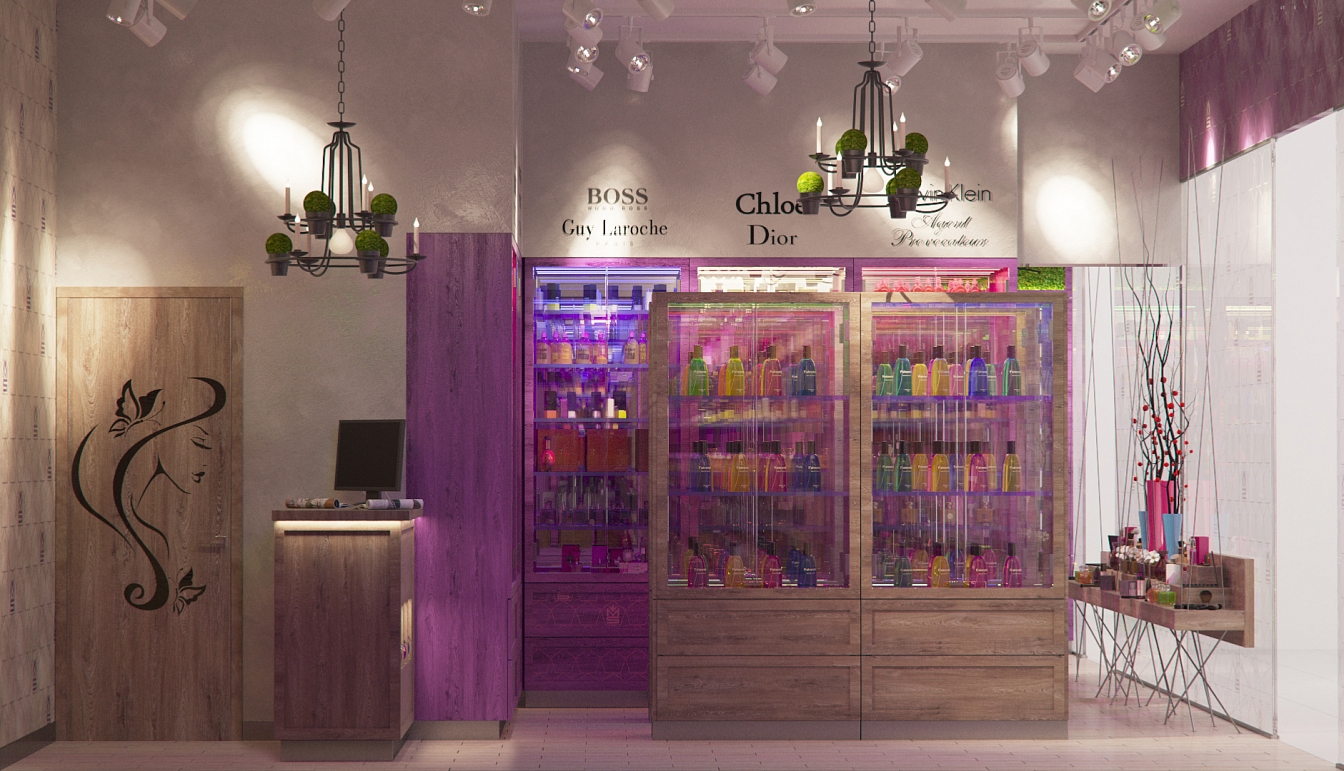 На этапе проектирования заказчики еще не определились, какая именно планировка им нужна. Поэтому дизайнерами были разработаны несколько вариантов функционального зонирования. Основное различие заключалось в расположении входных зон : центральное или угловое. При этом основная концепция оставалась единой. Пространство магазина превращалось в загадочную оранжерею, где женщины могут пребывать во власти своих фантазий и грёз. Привлекающая внимание розовая палитра, разбавлена в одном варианте неожиданной текстурой настоящего мха, в другом- облаком порхающих бабочек.