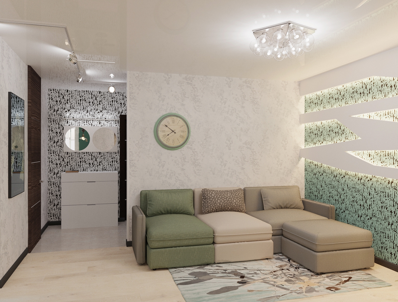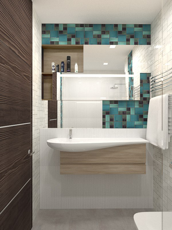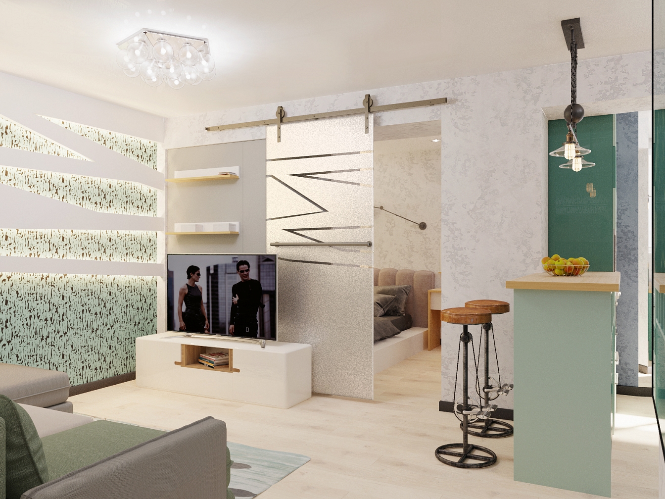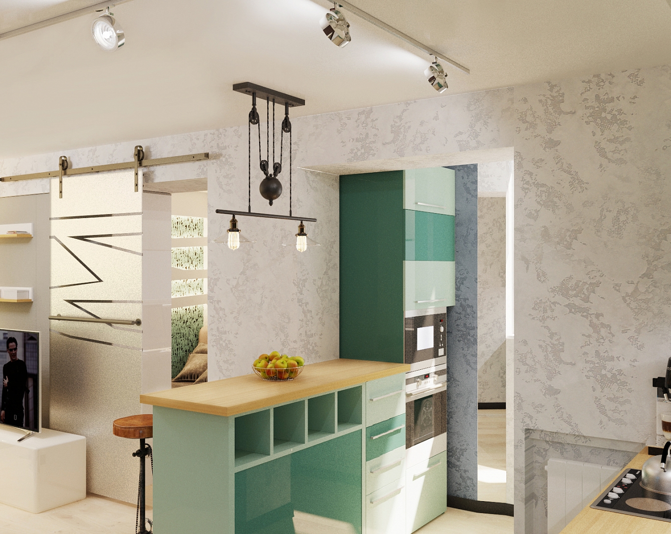 Этот интерьер для активного молодого человека. Он легкий, свободный, с интересными деталями обстановки в стиле стимпанк и обилием освещения. Гостиную отделяет от спальни шкаф с телевизором, а от кухни – барная стойка. Прихожая легкая, в светлой гамме с несколькими желтыми штрихами. Гостиная и спальная зона отделены шкафом и раздвижной дверью, но соединены световой конструкцией с ломаными линиями. Обои с маленькими человечками объединяют все пространство в квартире. Бирюзовая кухня переходит на балкон.