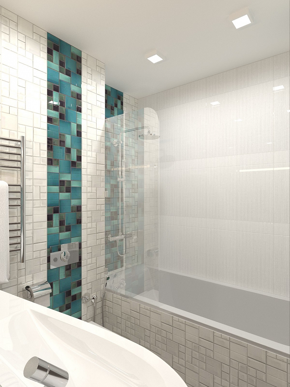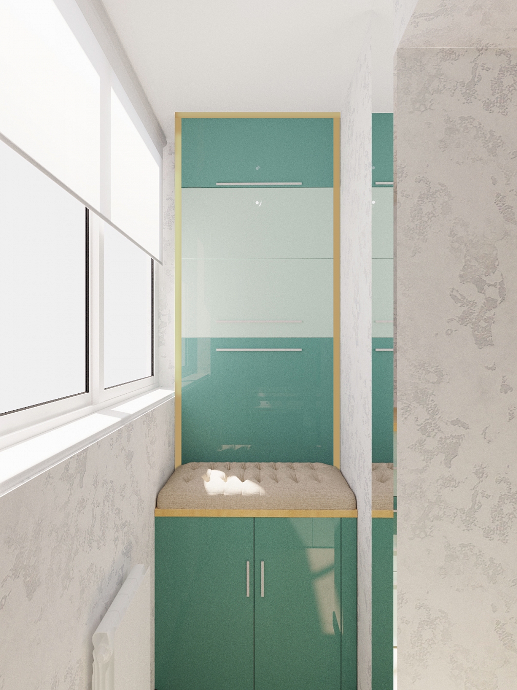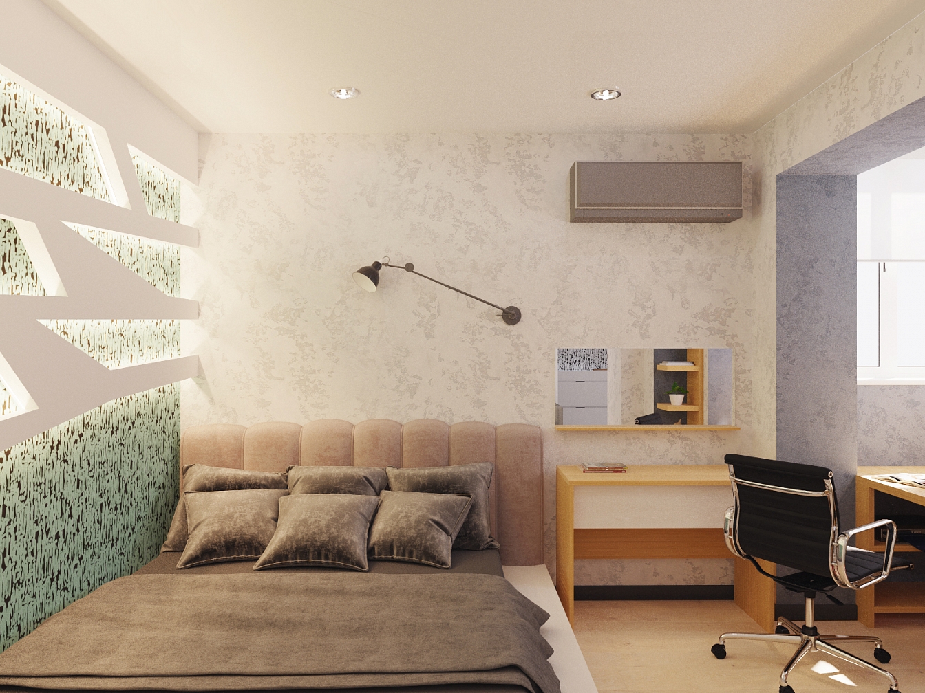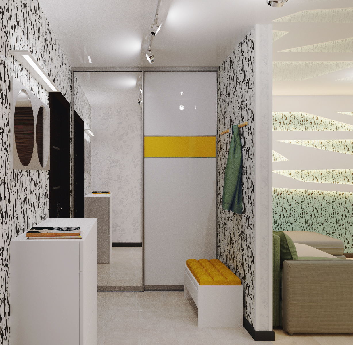 Этот интерьер для активного молодого человека. Он легкий, свободный, с интересными деталями обстановки в стиле стимпанк и обилием освещения. Гостиную отделяет от спальни шкаф с телевизором, а от кухни – барная стойка. Прихожая легкая, в светлой гамме с несколькими желтыми штрихами. Гостиная и спальная зона отделены шкафом и раздвижной дверью, но соединены световой конструкцией с ломаными линиями. Обои с маленькими человечками объединяют все пространство в квартире. Бирюзовая кухня переходит на балкон.