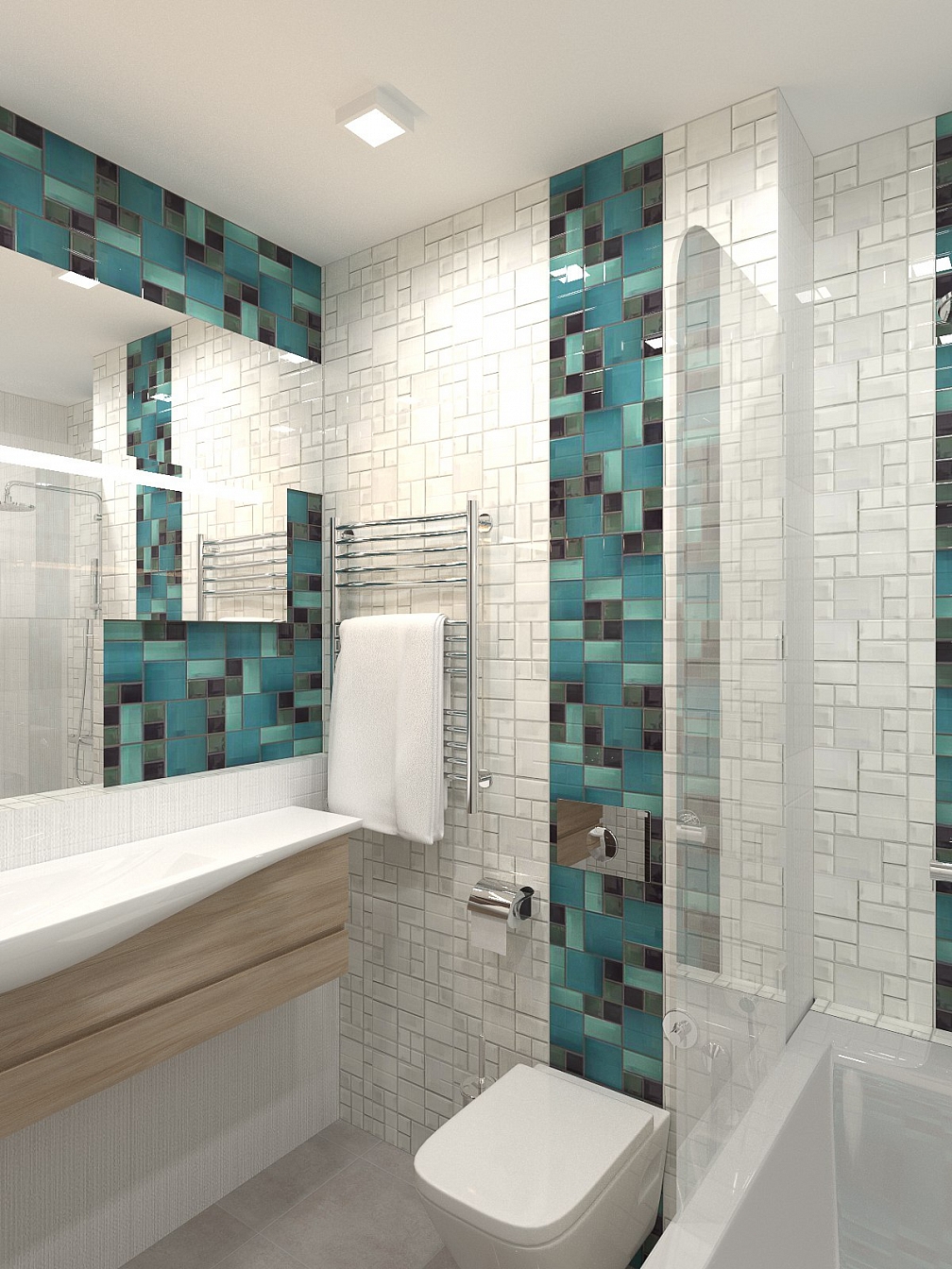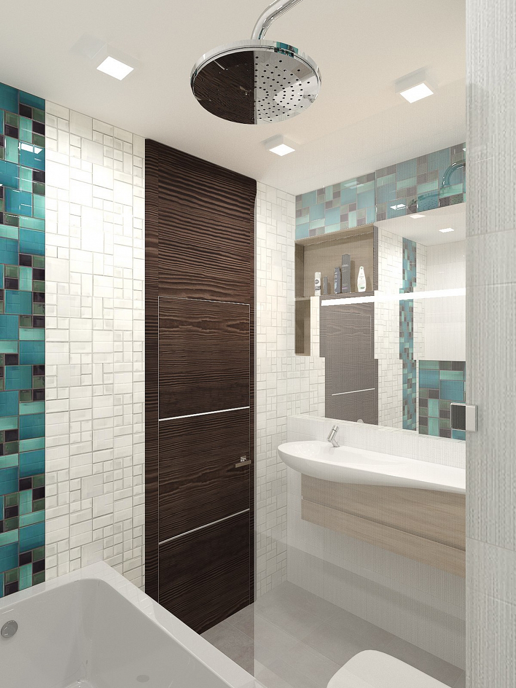 Система зеркал добавляет естественного света в квартиру. Ванная продолжает стилистику основного интерьера.