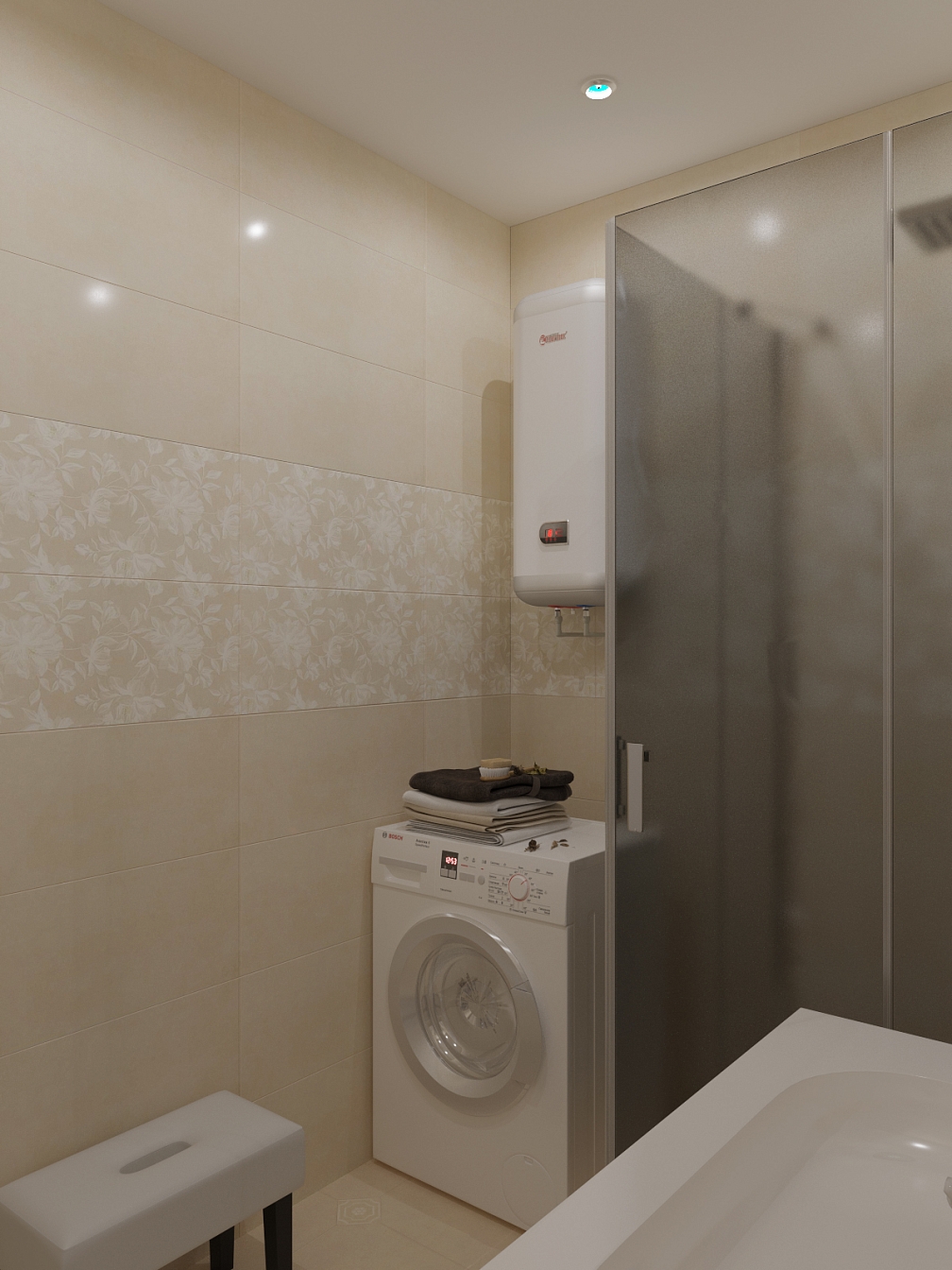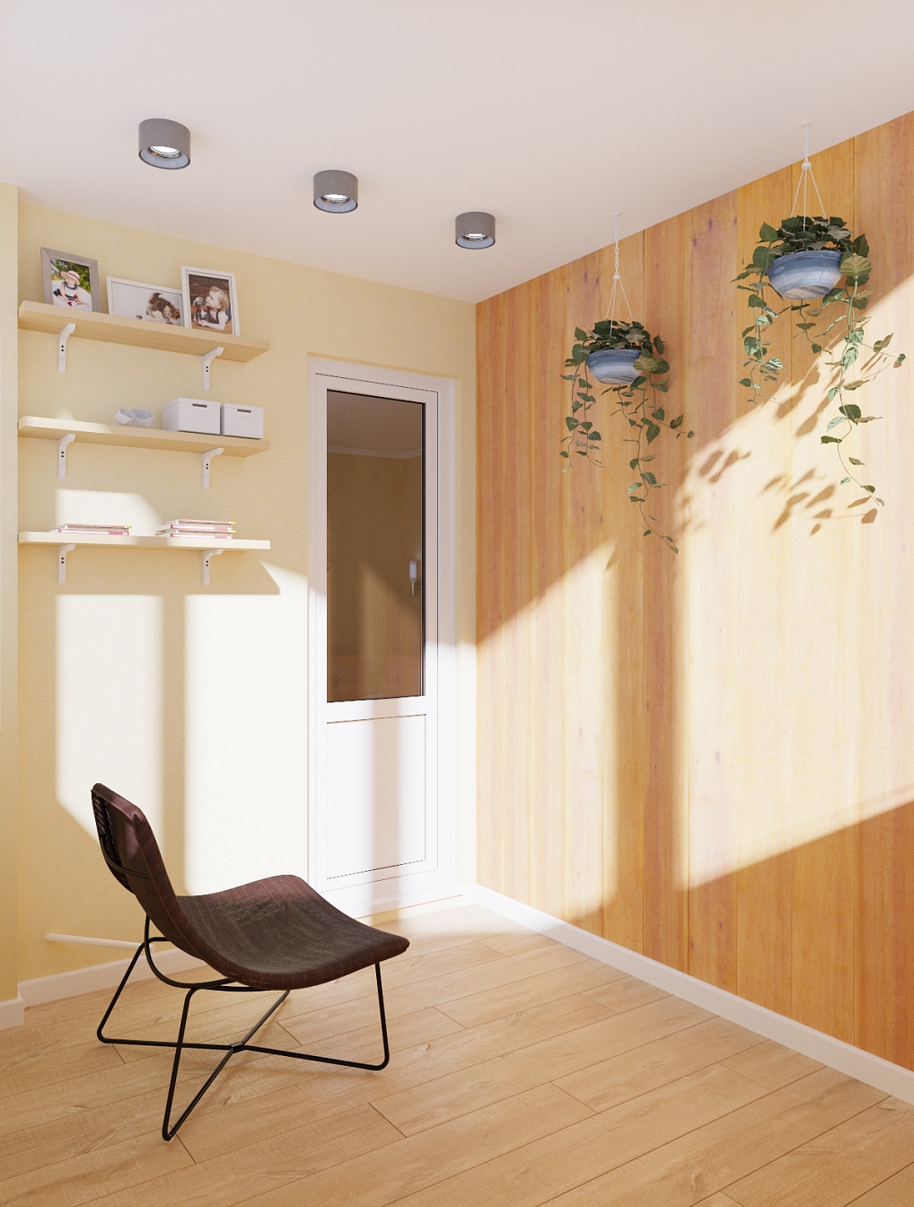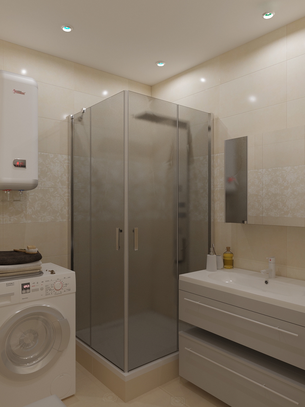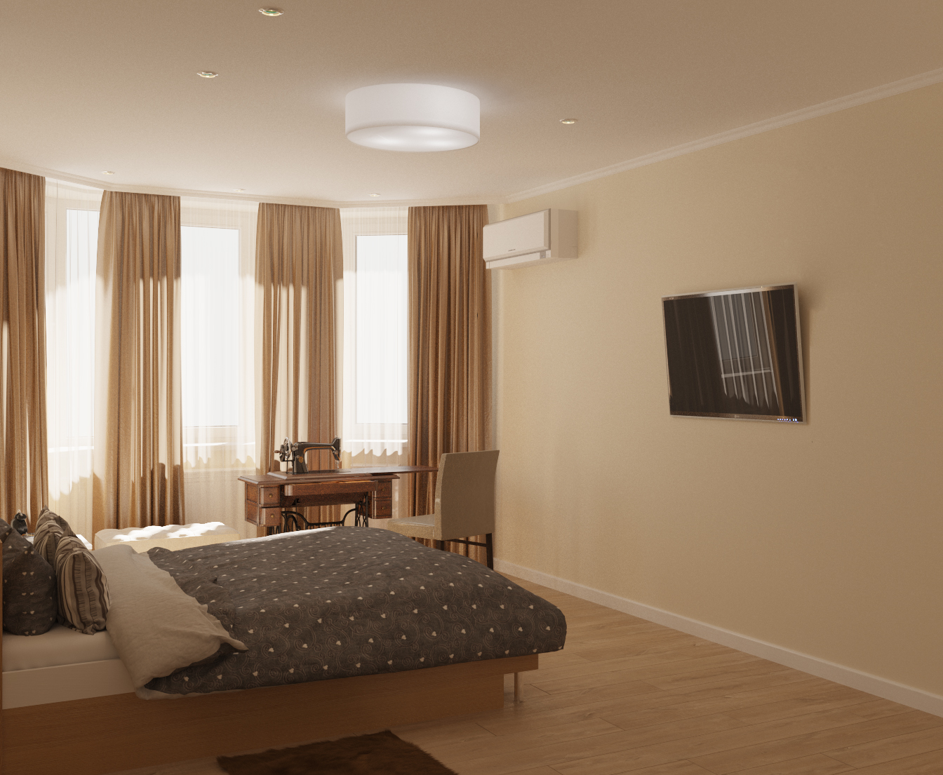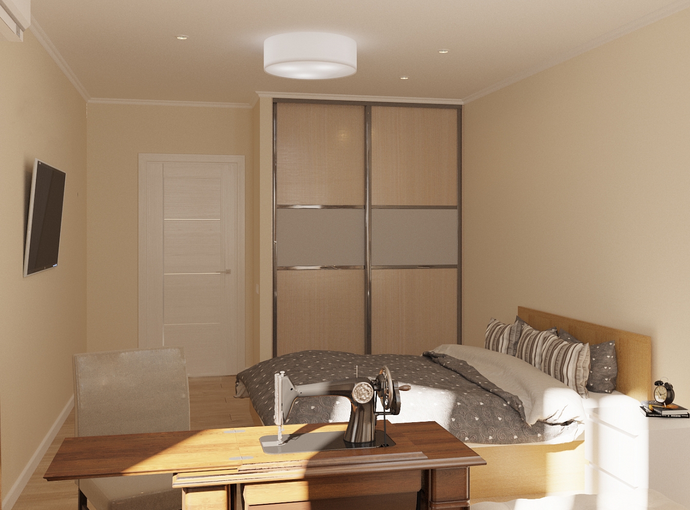 Планировочное решение отличалось максимальной функциональностью в организации пространства. Основным лейтмотивом концепции стал минимализм с небольшими акцентами модерна. Отделка и наполнение воспринимались только фоном, не привлекающим внимание и не отвлекающим от происходящего в квартире. Пространство смоделировано с помощью освещения, набора простых и функциональных вещей, броского аксессуара, такого как старинная швейная машинка.