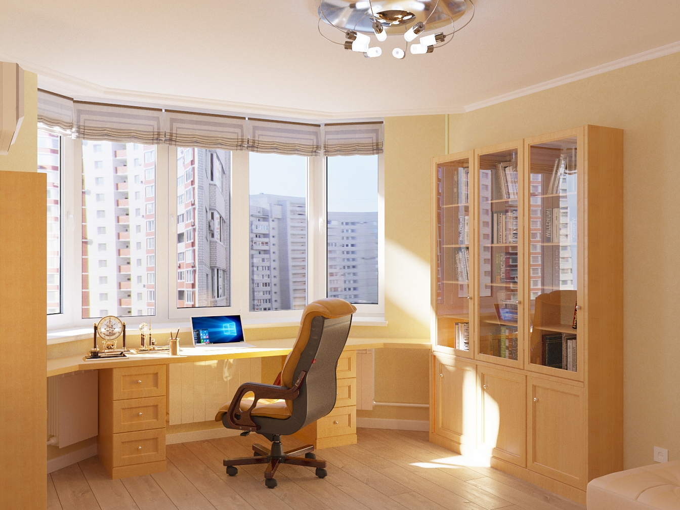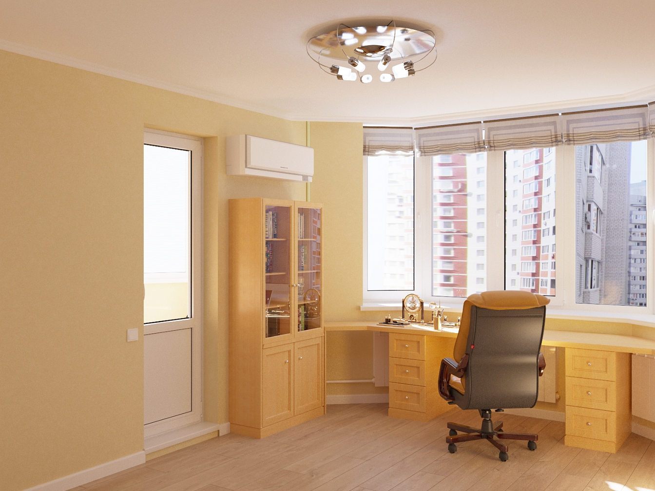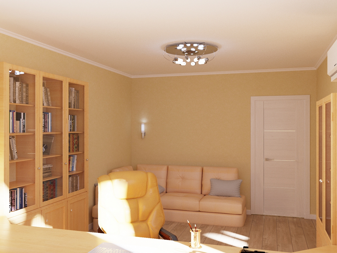 Предельная простота мебели компенсируется большим функционалом : компьютерный стол со множеством полок, диваны и кресла с широкими подлокотниками и выдвижными ящиками.